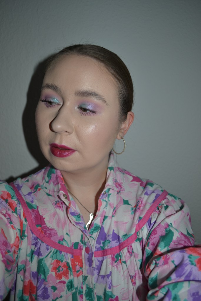 (Base: primer –  e.l.f. Poreless Putty primer, foundation – e.l.f. Cosmetics Camo CC Cream (shade: Fair 120N), concealer – L’Oréal Infaillible More Than Concealer (shade: 322 Ivory), powders – e.l.f. HD Undereye setting powder in Sheer + Rimmel Clear Complexion Clarifying powder in 021 Transparent. Face make-up: bronzer – Fenty Beauty Cheeks Out Freestyle cream bronzer in Butta Bisquit, blusher – MAC Glow Play blush in Totally Synced, highlighter – I Heart Revolution x Disney The Aristocats Marie highlighter (shade: Beloved). Eye make-up: base – MAC Pro Longwear Paint Pot in Painterly, eyeshadows – Essence eyeshadow in 05 Granny Pants + BH Cosmetics Remix Dance 90’s eyeshadow palette (shades: Hit Me Baby + Creep + I’m Blue + Supermodel), mascaras – Essence Volume Booster lash primer + Maybelline Lash Sensational Sky High mascara + L.A. Girl Volumatic mascara (shade: Purple), eyeliner – Revolution x Bratz Jade eye pencil. Eyebrows: Anastasia Beverly Hills Brow Freeze + Maybelline Brow Ultra Slim pencil in Medium Brown. Lips: NYX Slim lip pencil in Fuchsia + Essence The Big Glam Caring Glitter Lip Glow in 01 Blinging Out Loud)