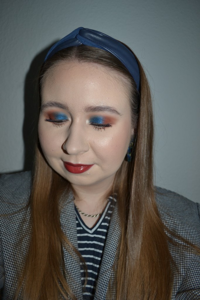 (Base: primer – NYX Angel Veil primer, foundation – Maybelline Dream Urban Cover foundation (shade: 100 Warm Ivory), concealers – L’Oréal Infaillible More Than Concealer (shade: 322 Ivory) + Essence Camouflage+ Healthy Glow concealer (shade: 10 Light Ivory), powder – Essence Brighten Up! Banana powder in 10 Bababanana + Fenty Beauty Pro Filt´r Instant Retouch setting powder in Butter. Face make-up: bronzer – Hourglass Ambient Lighting bronzer in Luminous Bronze Light, blusher – bareMinerals Gen Nude Blonzer in Kiss of Copper, highlighter – Becca Shimmering Skin Perfector pressed highlighter (shade: Moonstone). Eye make-up: base – MAC Pro Longwear Paint Pot in Painterly, eyeshadows – e.l.f. Cosmetics Bite-Size Eyeshadows in Carnival Candy (shades: all four) + MAC Nylon eyeshadow, mascara – L’Oréal Lash Paradise mascara in Moonlight Noir/Black Navy, eyeliner – MAC Teddy eye kohl. Eyebrows: Soda #wowbrow Flat Brow Liner in Kim + MAC Brow Set in Clear. Lips: Maybelline Moisture Extreme lip liner in 64 Aubergine + Yves Saint Laurent Rouge Volupte Rock’n Shine lipstick in 2 Cacao Bounce)