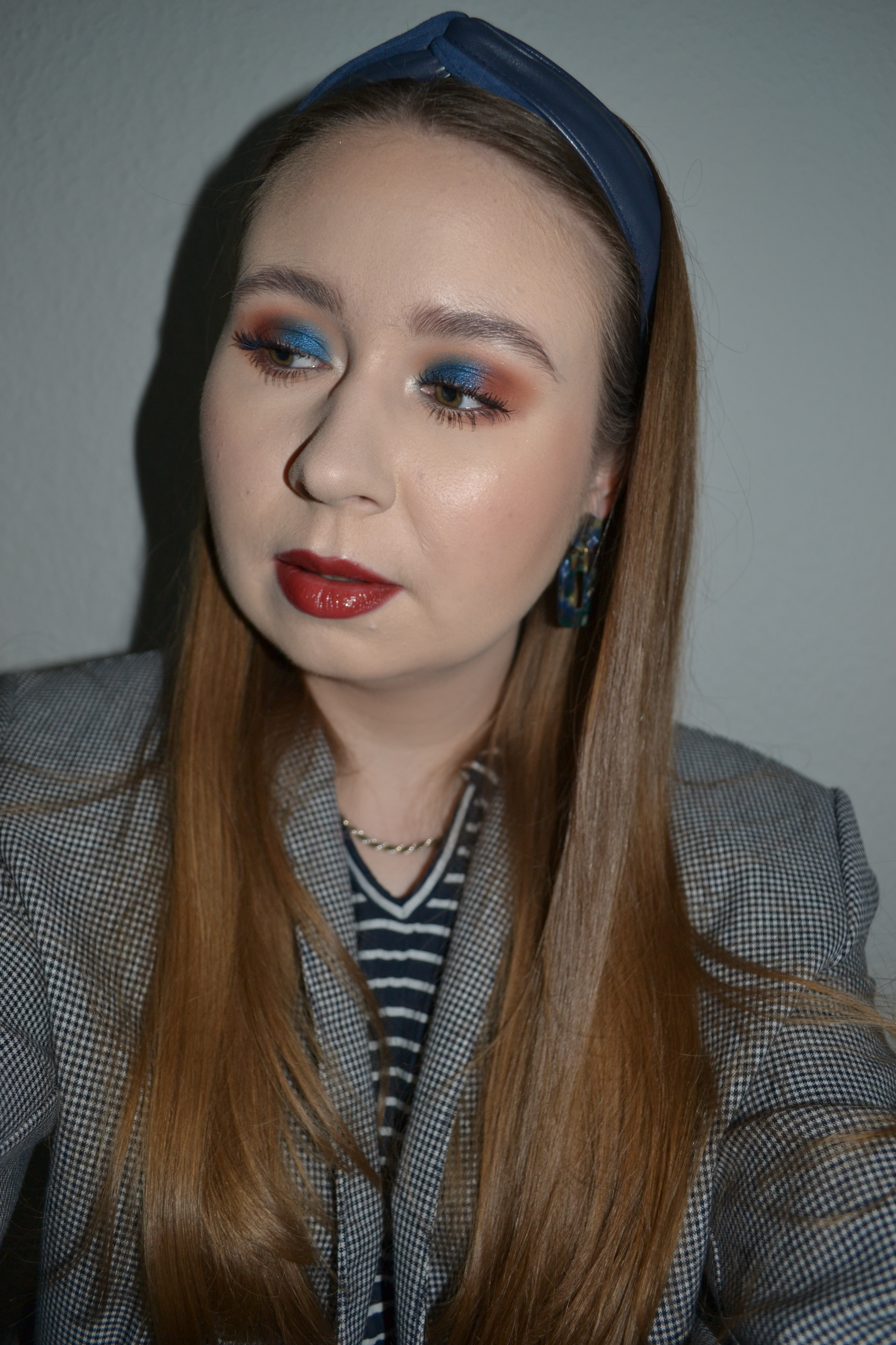 (Base: primer – NYX Angel Veil primer, foundation – Maybelline Dream Urban Cover foundation (shade: 100 Warm Ivory), concealers – L’Oréal Infaillible More Than Concealer (shade: 322 Ivory) + Essence Camouflage+ Healthy Glow concealer (shade: 10 Light Ivory), powder – Essence Brighten Up! Banana powder in 10 Bababanana + Fenty Beauty Pro Filt´r Instant Retouch setting powder in Butter. Face make-up: bronzer – Hourglass Ambient Lighting bronzer in Luminous Bronze Light, blusher – bareMinerals Gen Nude Blonzer in Kiss of Copper, highlighter – Becca Shimmering Skin Perfector pressed highlighter (shade: Moonstone). Eye make-up: base – MAC Pro Longwear Paint Pot in Painterly, eyeshadows – e.l.f. Cosmetics Bite-Size Eyeshadows in Carnival Candy (shades: all four) + MAC Nylon eyeshadow, mascara – L’Oréal Lash Paradise mascara in Moonlight Noir/Black Navy, eyeliner – MAC Teddy eye kohl. Eyebrows: Soda #wowbrow Flat Brow Liner in Kim + MAC Brow Set in Clear. Lips: Maybelline Moisture Extreme lip liner in 64 Aubergine + Yves Saint Laurent Rouge Volupte Rock’n Shine lipstick in 2 Cacao Bounce)
