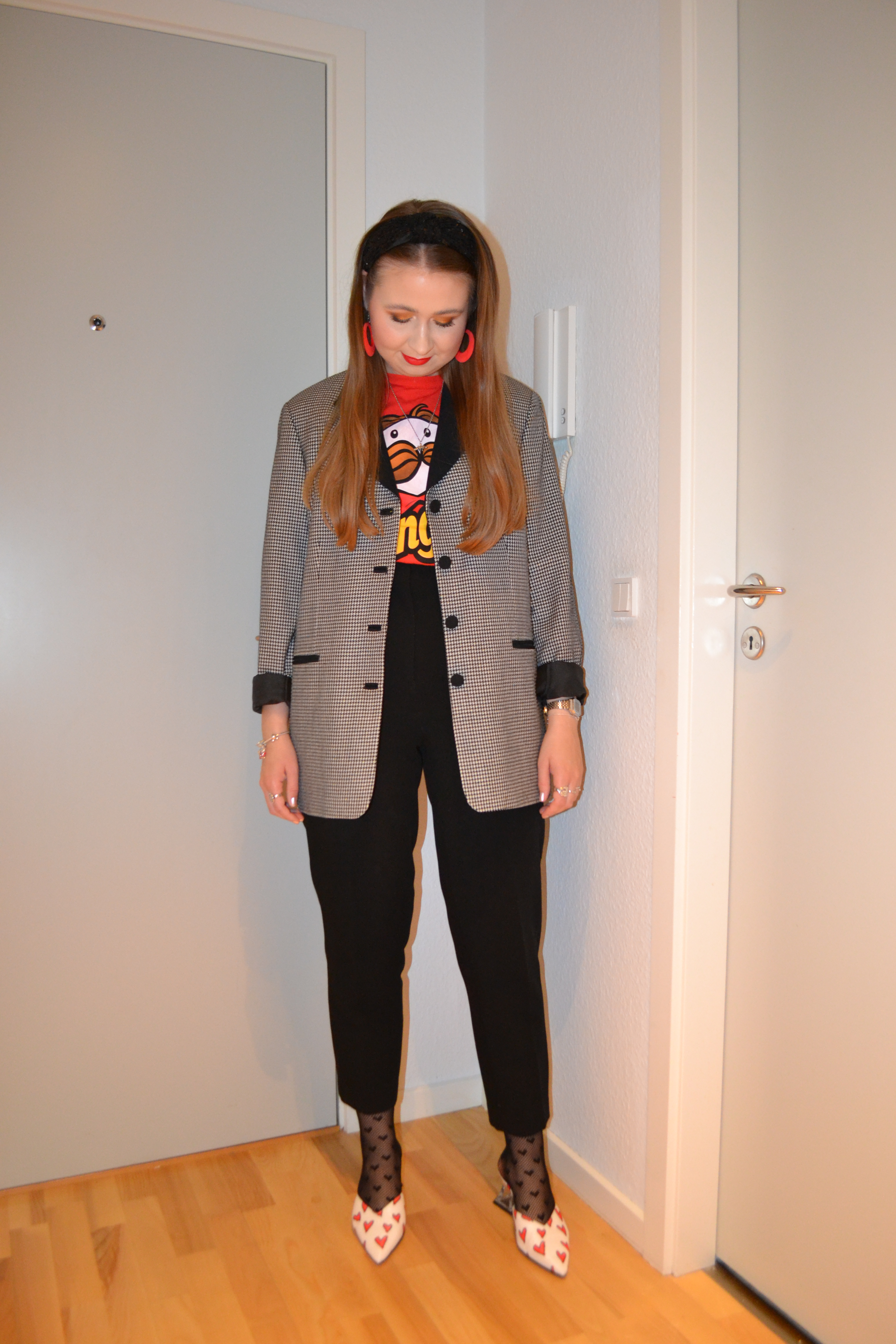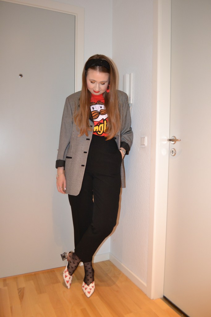 (Blazer – second hand, T-shirt + trousers + fishnet socks – H&M, heels – Asos Design)