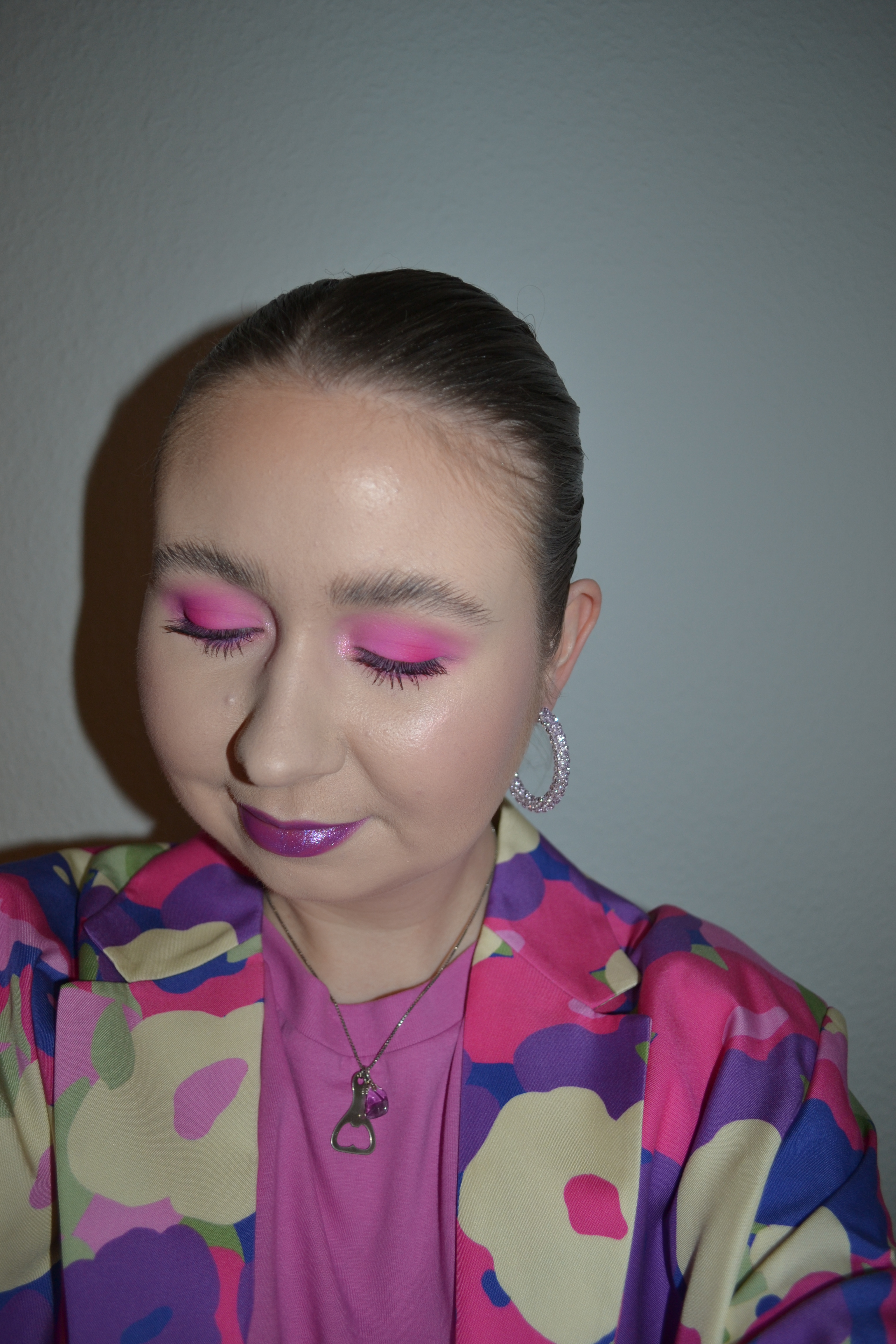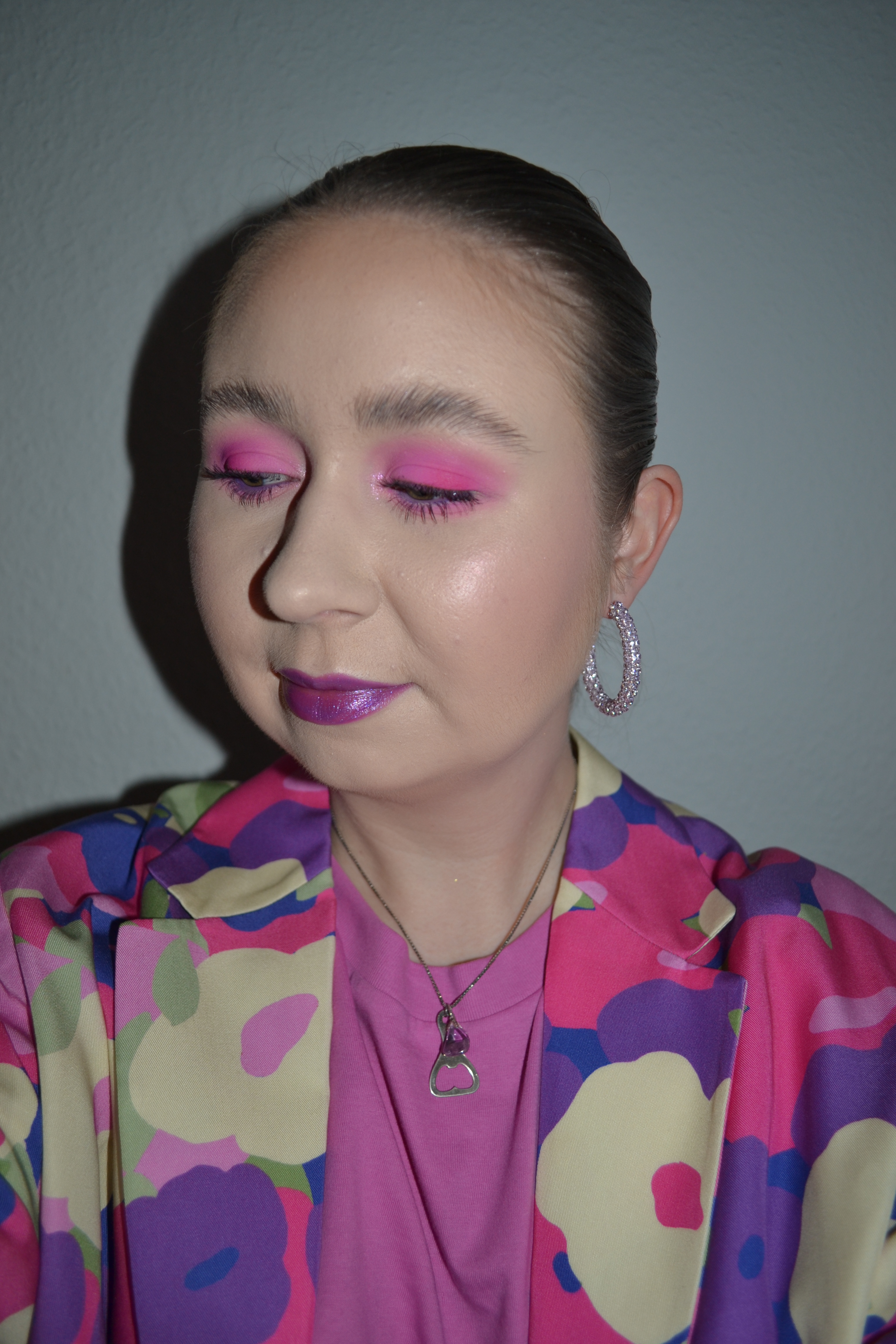 (Base: primer – Wet n Wild Prime & Set Prime Focus The Impossible primer, foundation – L’Oreal Paris Infaillible 24H Fresh Wear foundation (shade: 015 Porcelain), concealer – L’Oréal Infaillible More Than Concealer (shade: 322 Ivory), powder – Dior Backstage Face & Body Powder-No-Powder in 0 Neutral. Face make-up: bronzer – Hourglass Ambient Lighting bronzer in Luminous Bronze Light, blusher – MAC Glow Play blush in Totally Synced, highlighter – Huda Beauty Glow Obsessions Light highlighter palette (1. & 2. shade 1. row). Eye make-up: base – MAC Pro Longwear Paint Pot in Painterly, eyeshadows – Essence eyeshadow in 05 Granny Pants + Jeffree Star Cosmetics Pink Religion palette (shades: Pink Religion + Diva + Pink Fever + Princess Crown), mascara – MAC Magic Extension mascara, eyeliner – LA Girl Shockwave Neon Liner (shade: Vivid). Eyebrows: Anastasia Beverly Hills Brow Freeze + Maybelline Brow Ultra Slim pencil in Medium Brown. Lips: Essence Invisible Kiss transparent lipliner in 01 Multitalent Wonder + Essence The Big Glam Caring Glitter Lip Glow in 04 Bam, Bling, Glam!)
