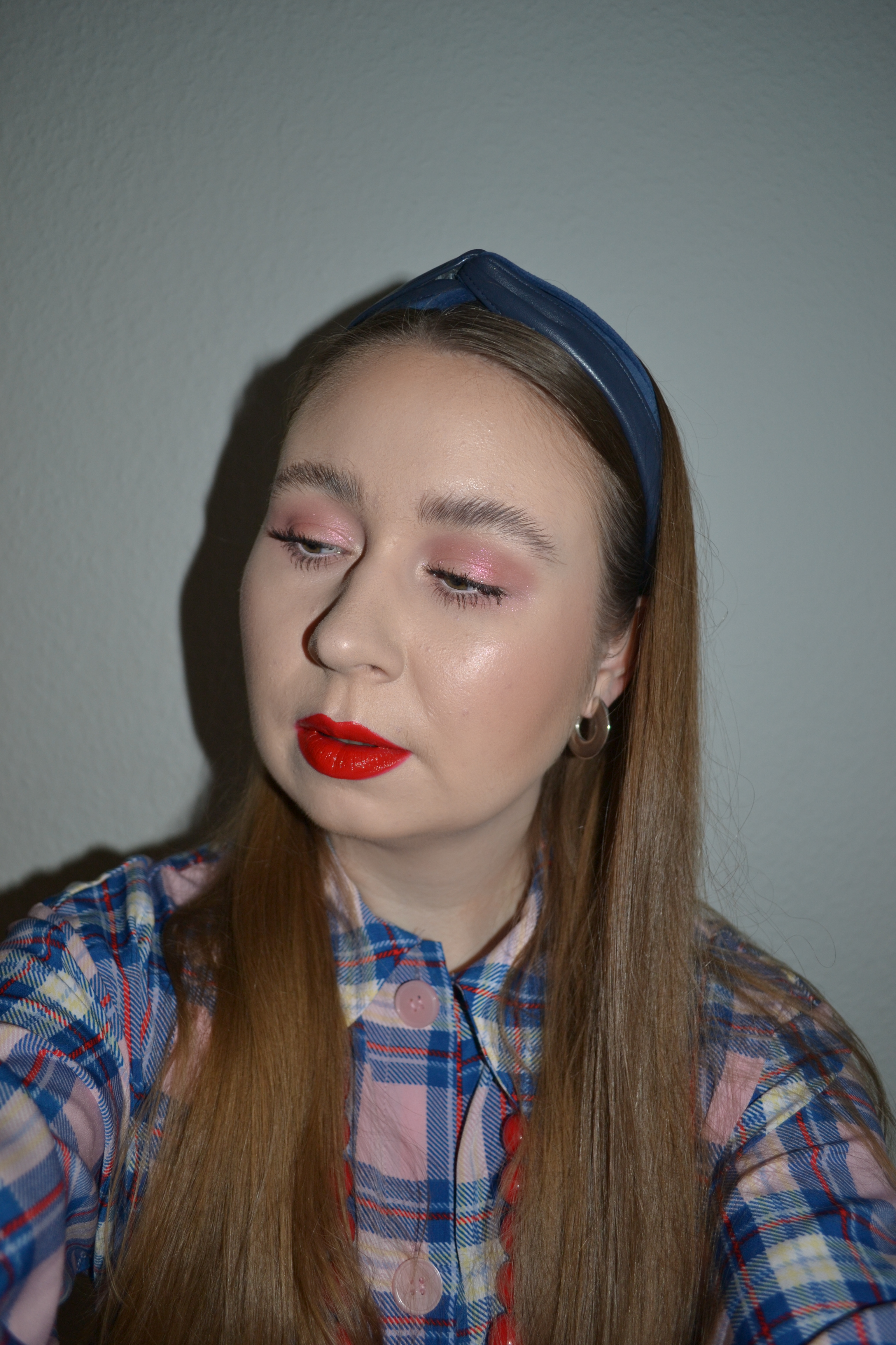 (Base: primers – NYX The Marshmellow primer + MAC Strobe Cream (shade: Pinklite), foundation – L’Oreal Paris Infaillible 24H Fresh Wear foundation (shade: 015 Porcelain), concealers – Catrice Ultimate Camouflage cream concealer (shade: 10 Ivory) + Nars Radiant Creamy concealer (shade: Vanilla), powder – Huda Beauty Easy Bake powder in Sugar Cookie. Face make-up: bronzer – Catrice Holiday Skin luminous bronzer in 010 Summer In The City, blusher – Pat McGrath Labs Skin Fetish: Divine blush in Fleurtatious, highlighter – Huda Beauty Glow Obsessions Light highlighter palette (1. & 2. shade 1. row). Eye make-up: base – MAC Pro Longwear Paint Pot in Painterly, eyeshadows – Fenty Beauty Bomb Posse Mega Mix & Match eyeshadow palette (shades: Vanilla Cake + Rock & Rose + Fussy + Balla’Rina) + Huda Beauty Glow Obsessions Light highlighter palette (1. shade 1. row on inner corners and browbones), mascara – MAC Magic Extension mascara, eyeliner – Marc Jacobs Fineliner Ultra-Skinny Gel Eye Crayon (shade: (Pink)yswear). Eyebrows: Anastasia Beverly Hills Brow Freeze + Maybelline Brow Ultra Slim pencil in Medium Brown. Lips: Essence Stay 8h lipliner in 08 Passionate + Jeffree Star Cosmetics Velvet Trap lipstick in Red Affair + Jeffree Star Cosmetics Supreme Gloss in Red Affair)