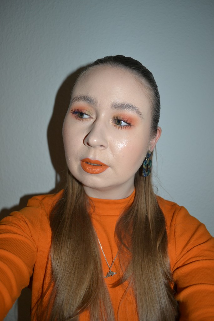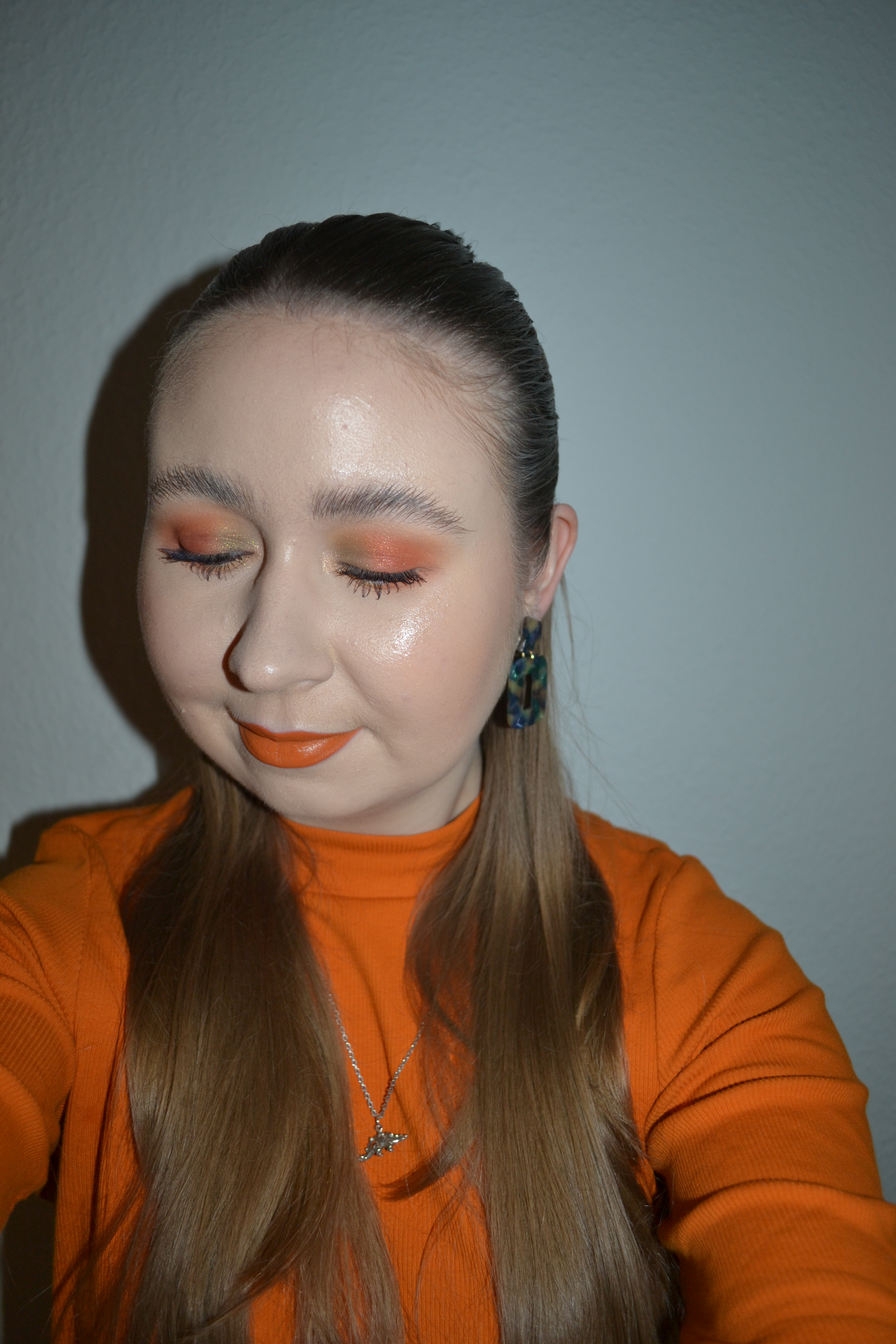 (Base: primer – Essence Skin Lovin’ Sensitive primer, foundation – Maybelline Dream Urban Cover foundation (shade: 100 Warm Ivory), concealers – L’Oréal Infaillible More Than Concealer (shade: 322 Ivory) + Essence Camouflage+ Healthy Glow concealer (shade: 10 Light Ivory), powders – e.l.f. HD powder in Soft Luminance + Dior Backstage Face & Body Powder-No-Powder in 0 Neutral. Face make-up: bronzer – Catrice Holiday Skin serum bronzer in 010 Escape to the Beach, blusher – Fenty Beauty Cheeks Out Freestyle Cream Blush in 01 Fuego Flush, highlighter – MAC Strobe Face Glaze in Punk In Spice. Eye make-up: base – MAC Pro Longwear Paint Pot in Painterly, eyeshadows – Essence eyeshadow in 05 Granny Pants + Huda Beauty Topaz Obsessions palette (shades: 1. shade 1. row + 2. shade 3. row) + MAC Eyeshadow x8: Feast Your Eyes (shades: All That Jam + What A Pear + Velvet Vamp + Feast Your Eyes), mascara – L’Oréal Lash Paradise mascara in Moonlight Noir/Black Navy, eyeliner – MAC Cobalt Kohl eye kohl. Eyebrows: Anastasia Beverly Hills Brow Freeze + Maybelline Brow Ultra Slim pencil in Medium Brown. Lips: Jeffree Star Cosmetics Velour lip liner in Allegedly + Lime Crime Unicorn lipstick in October)
