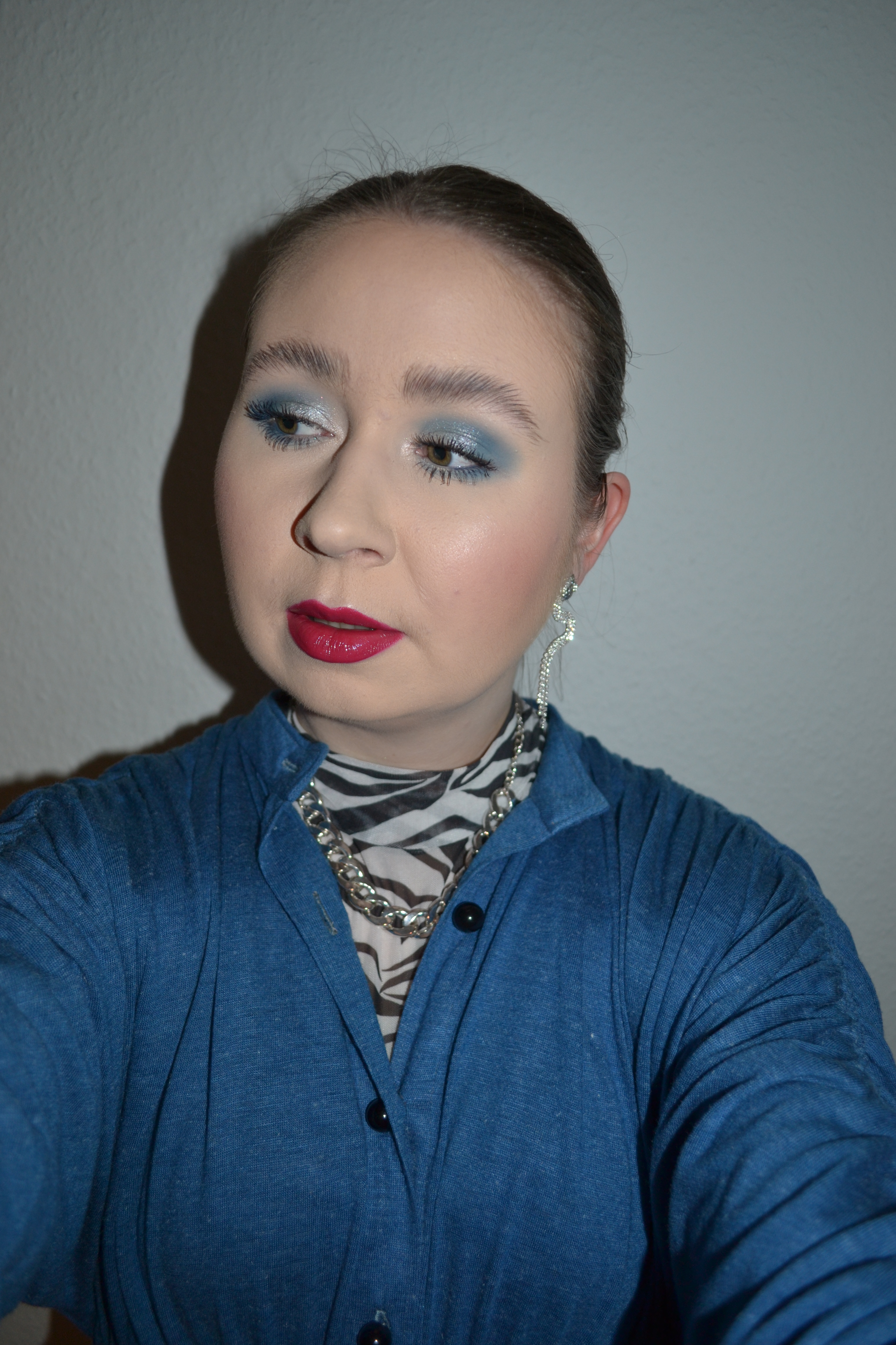 (Base: primer – Wet n Wild Prime Focus The Impossible primer, foundation – L’Oreal Paris Infaillible 24H Fresh Wear foundation (shade: 015 Porcelain), concealers – e.l.f. 16HR Camo matte concealers (shades: Light Sand + Fair Warm), powders – e.l.f. HD Undereye setting powder in Sheer + NYX Can’t Stop Won’t Stop mattifying powder in 01 Fair. Face make-up: bronzer – Fenty Beauty Sun Stalk’r Instant Warmth bronzer (shade: Inda Sun), blusher – Catrice Blush Box Glowing Multicolour blusher in 020 It’s Wine O’ Clock, highlighter – MAC Flashing Ice Extra Dimension Skinfinish Trio: Light (shade: Glitzed Out). Eye make-up: base – MAC Pro Longwear Paint Pot in Painterly, eyeshadows – Essence eyeshadow in 05 Granny Pants + Essence Ice, Ice Baby! eyeshadow palette (shades: VIP + Collaborate & Listen + Rock A Mic + I’ll Glow), mascara – L’Oréal Lash Paradise mascara in Moonlight Noir/Black Navy, eyeliners – NYX Slim eye pencil in Sapphire + MAC Technakohl liner in Sterling Silver. Eyebrows: Anastasia Beverly Hills Brow Freeze + Maybelline Brow Ultra Slim pencil in Medium Brown. Lips: Essence Stay 8h lipliner in 04 Naïve + Wet n Wild Megalast High-Shine Brilliance lipstick in Raining Rubies)