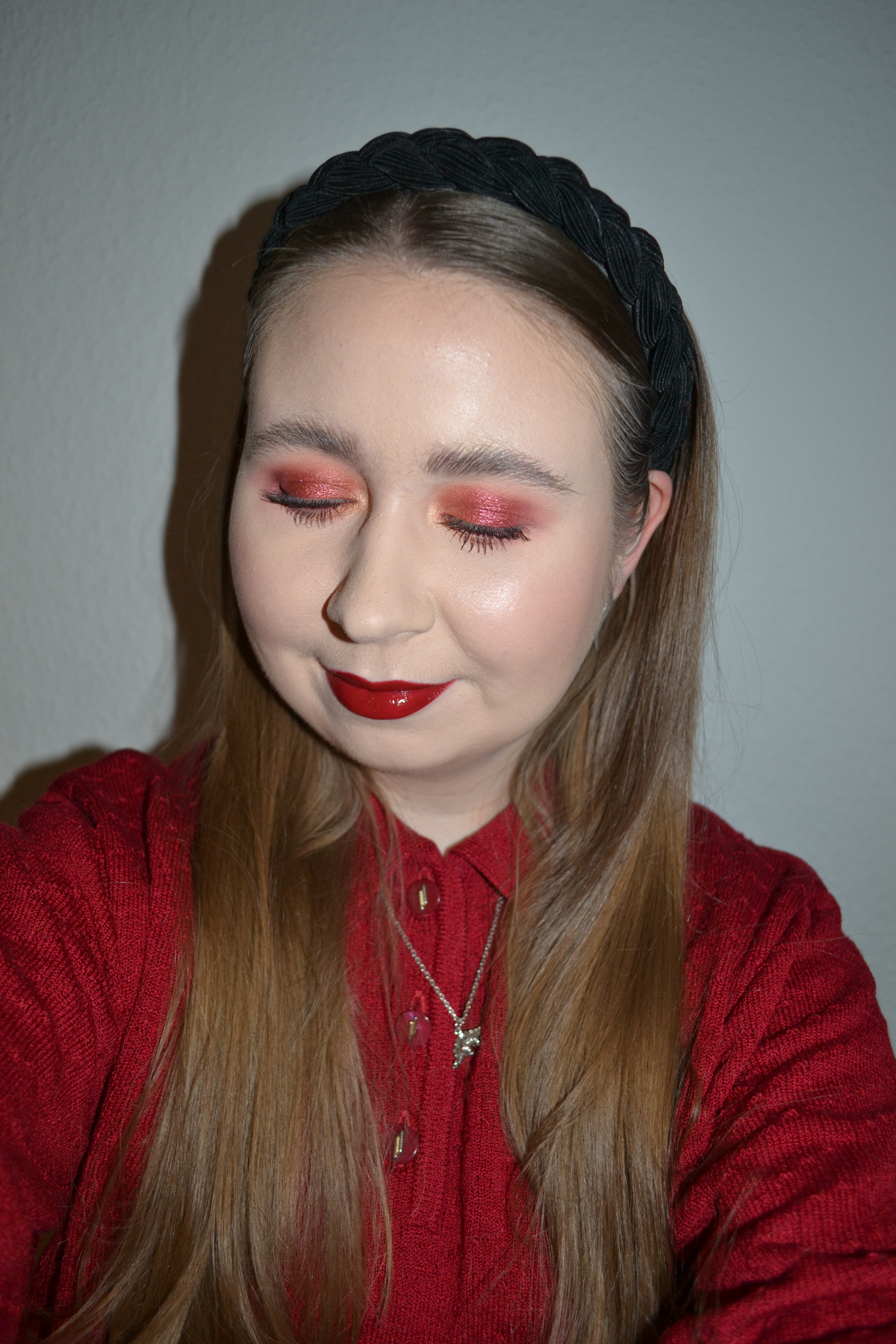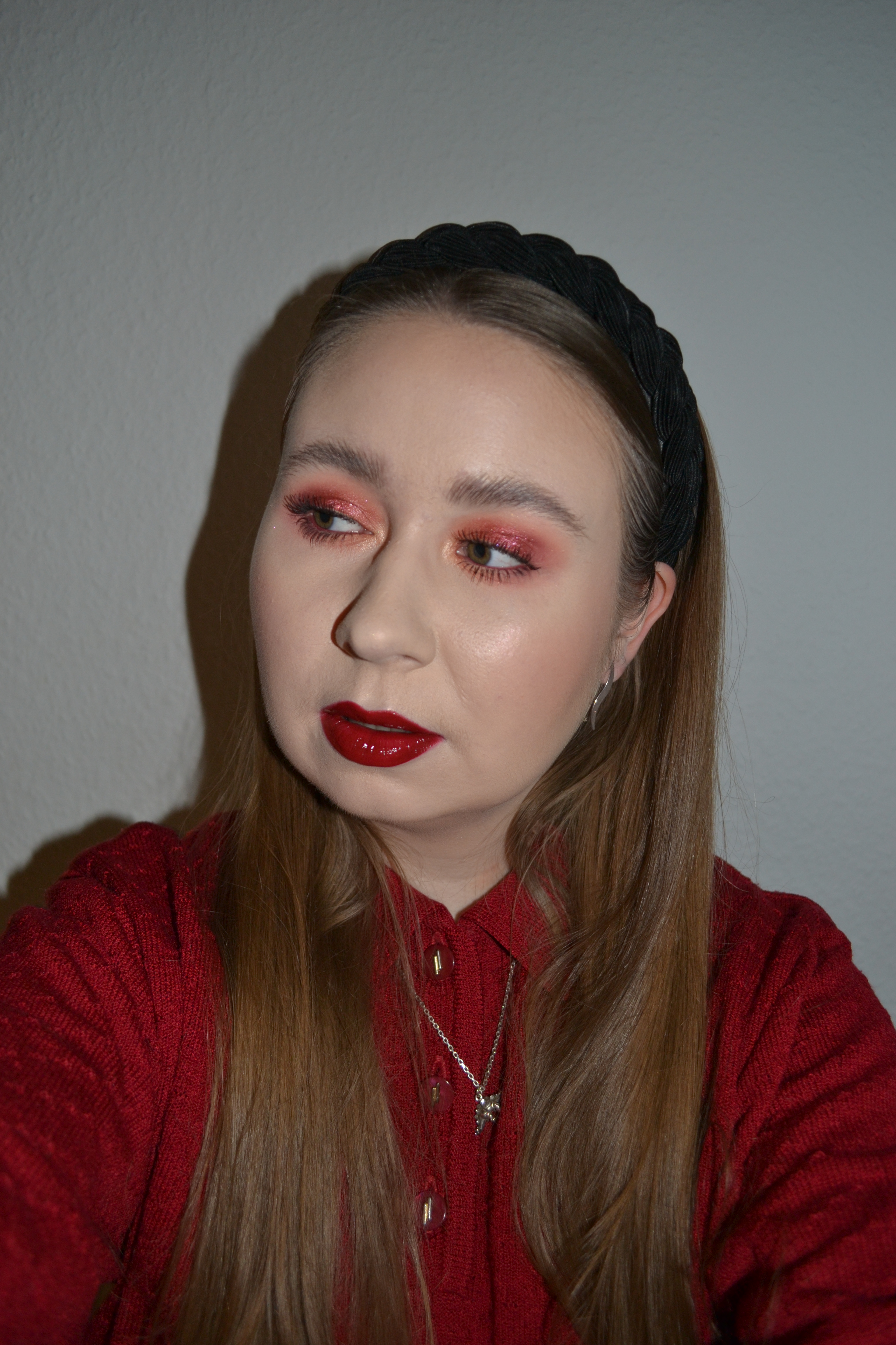 (Base: primer – e.l.f. Poreless Putty primer, foundations – Catrice True Skin Hydrating foundation (shade: 002 Neutral Ivory) + Huda Beauty Glowish Multidew skin tint in 3 light (sample), concealers – e.l.f. 16HR Camo matte concealers (shades: Light Sand + Fair Warm), powder – Laura Mercier Translucent Loose setting powder. Face make-up: bronzer – By Beauty Bay powder bronzer in Fawn, blusher – MAC Star-Dipped Face Compact light Extra Dimension blush in Sippin’ On Stars, highlighter – MAC Star-Dipped Face Compact light Extra Dimension Skinfinishes in Show Gold + Hi-Sequincy. Eye make-up: base – Milani eyeshadow primer in 01 Nude + NYX Glitter primer, eyeshadows – Essence My Little Copper eyeshadow palette (shades: Wear The Crown + Pretty Rich + Insta-Rich) + Urban Decay Relish eyeshadow + NYX Prismatic Shadow in Fireball + MAC Extra Dimension Foil eyeshadow in Firewerk the Room, mascaras – Essence Volume Booster lash primer + Maybelline Lash Sensational Sky High mascara, eyeliner – Marc Jacobs Highliner Glam Glitter gel eye crayon in Glam Jam. Eyebrows: Soda #wowbrow Flat Brow Liner in Kim + NYX Brow Glue Intant brow styler. Lips: Gosh Velvet Touch lipliner in 003 Cardinal Red + MAC Viva Glam I lipstick + MAC 10’s Across Da Board lipglass)