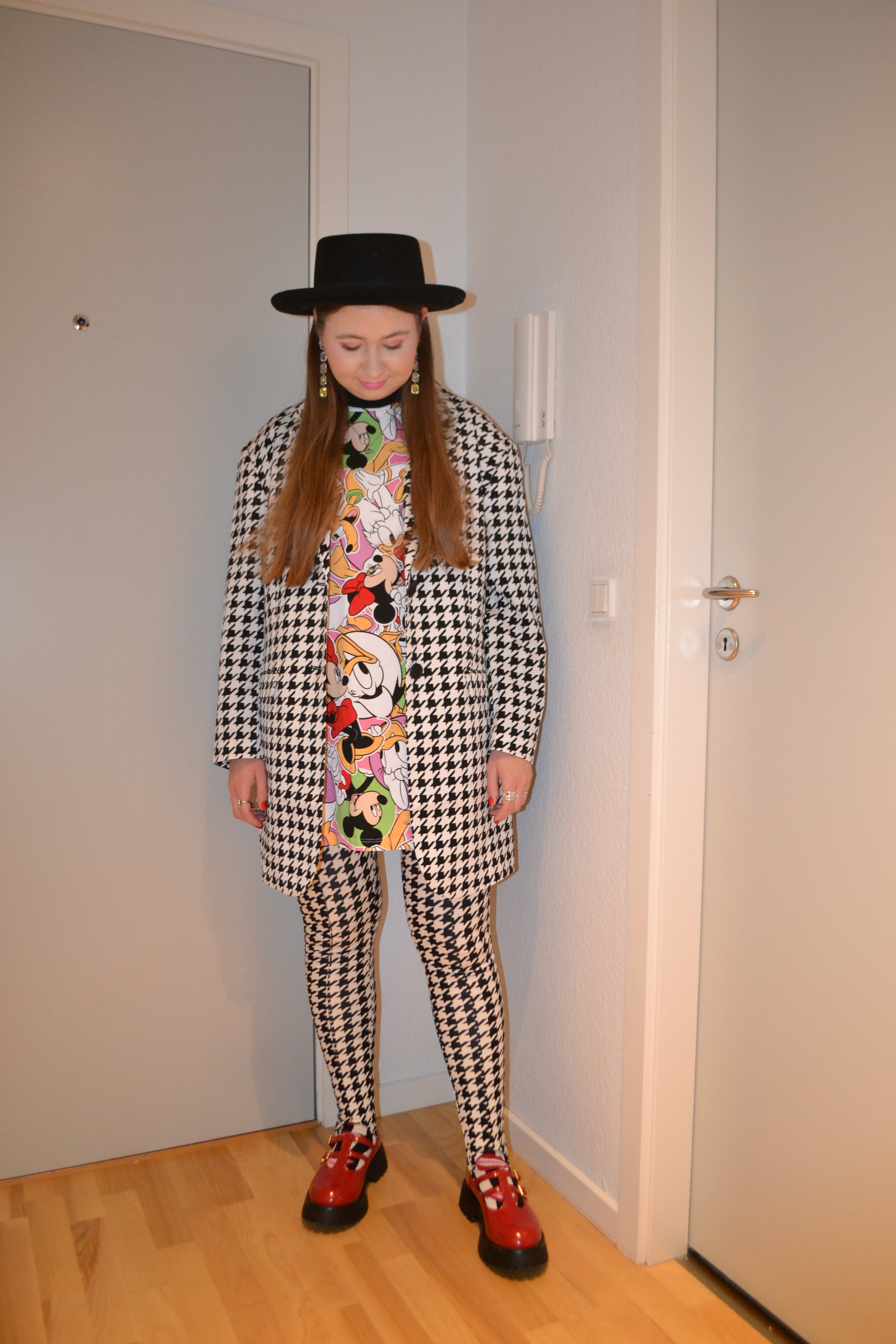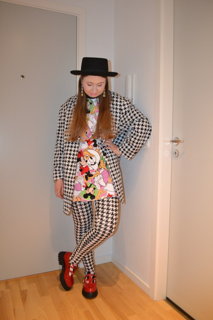 (Hat + roll neck top – H&M, T-shirt dress – Zara, blazer + leggings + socks – Monki, shoes – Asos Design)