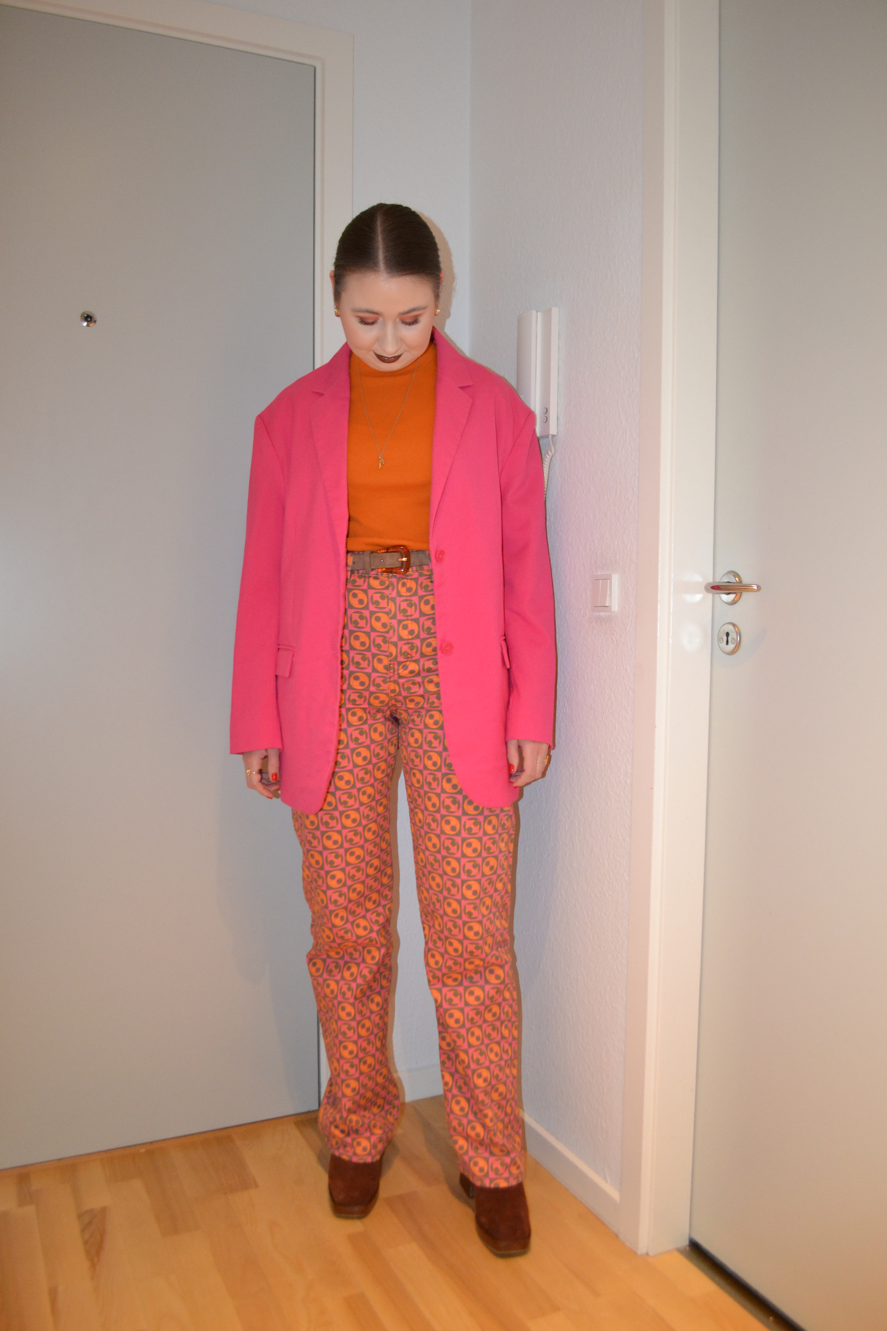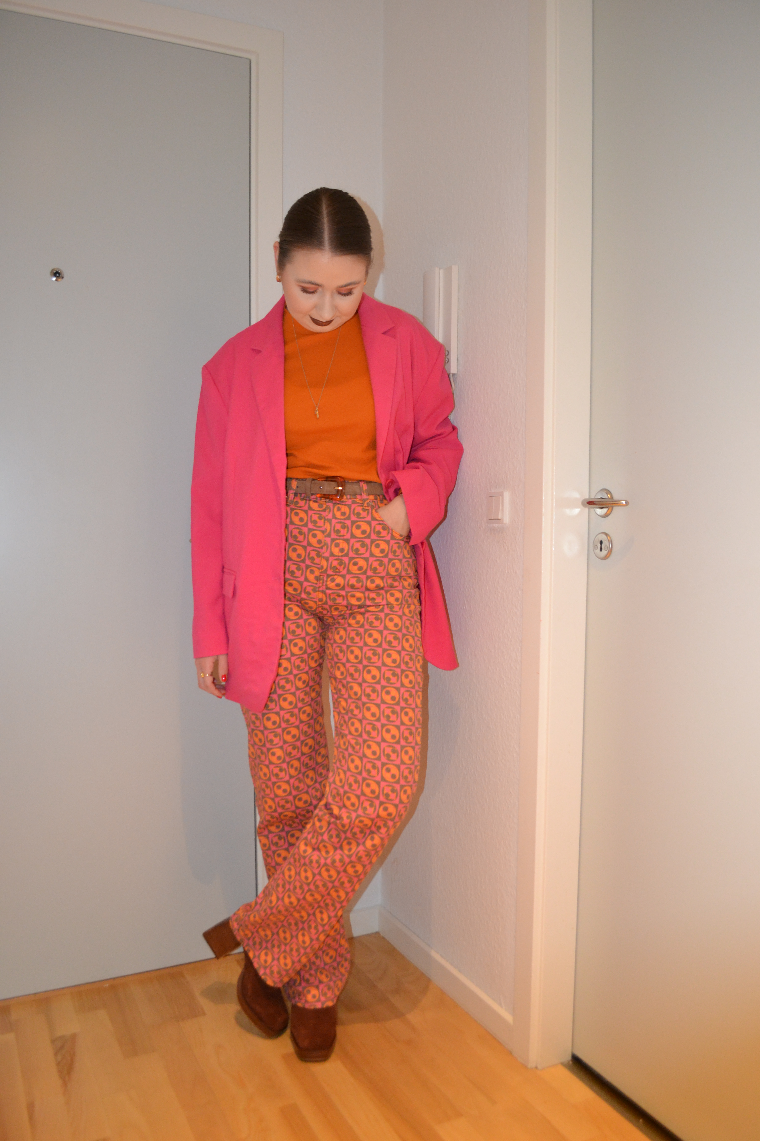 Here’s what I wore Thursday January 14. You’ve probably noticed how much I love pink and orange together, and I also really like the addition of brown to this look.