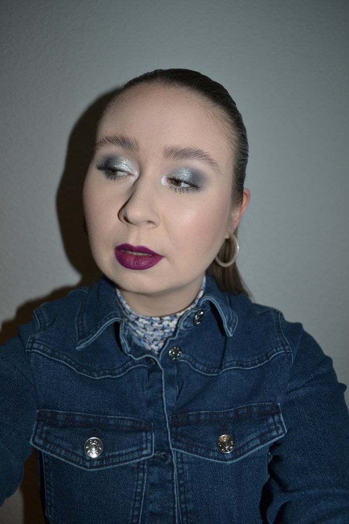 (Base: primer – Milk Makeup Hydro Grip primer, foundation – Catrice True Skin Hydrating foundation (shade: 004 Neutral Porcelain), concealers – e.l.f. 16HR Camo matte concealer (shades: Light Sand + Fair Warm), powders – Revolution Eye Bright setting powder + MAC Prep + Prime Transparent finishing powder. Face make-up: bronzer/contour – Natasha Denona Contour Sculpting Powder in 01 Light, blusher – Clinique Cheek Pop Pearl blush in 06 Garnet Pop, highlighter – Becca Shimmering Skin Perfector pressed highlighter (shade: Pearl). Eye make-up: base – MAC Pro Longwear Paint Pot in Painterly, eyeshadows – Natasha Denona Mini Xenon palette (shades: Puff + Mist + Blackest Black Matte + Gloom + Chromatic) + MAC Extra Dimension foil eyeshadow in Cooler Than Being Cool, mascara – Maybelline Lash Sensational Sky High mascara, eyeliner – MAC Dual-Ended Pro Longwear eyeliner in De-Vinyl/Tightly Laced (both shades). Eyebrows: Anastasia Beverly Hills Brow Freeze + Maybelline Brow Ultra Slim pencil in Medium Brown. Lips: MAC Hellebore Liptensity lip pencil + MAC Powder Kiss lipstick in P For Potent)