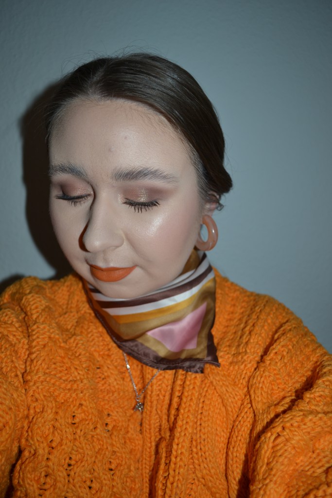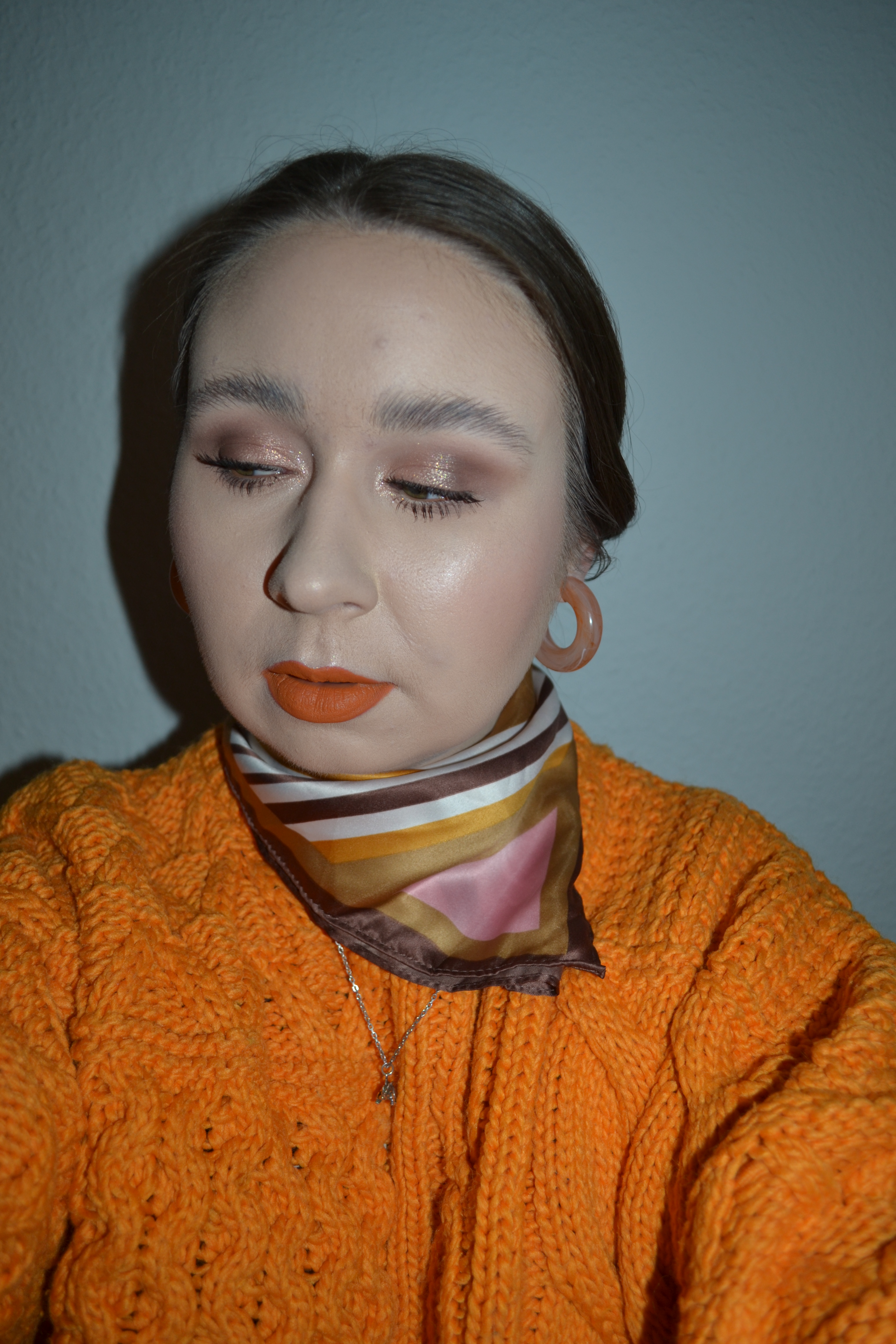 (Base: primer – Essence Catching Clouds Cloud-touch Mousse Primer in 01 Up On Cloud, foundation – e.l.f. Cosmetics Camo CC Cream (shade: Fair 120N), concealer – Anastasia Beverly Hills Magic Touch concealer (shade: 3), powder – Charlotte Tilbury Airbrush Flawless Finish powder (shade: 1 Fair). Face make-up: bronzer – e.l.f. Cosmetics Putty bronzer in Tan Lines, blusher – Natasha Denona Glam face palette Light (shade: Cream Blush), highlighter – Natasha Denona Glam face palette Light (shade: Star Glow). Eye make-up: base – MAC Pro Longwear Paint Pot in Painterly, eyeshadows – Essence eyeshadow in 05 Granny Pants + Natasha Denona Glam face palette Light (shades: Crease + Smoke + Outer Corner + Inner Corner), mascara – Maybelline Lash Sensational Sky High mascara, eyeliner – NYX Slim eye pencil in Light Brown. Eyebrows: Anastasia Beverly Hills Brow Freeze + Maybelline Brow Ultra Slim pencil in Medium Brown. Lips: Jeffree Star Cosmetics Velour liquid lipliner in Allegedly + Fenty Beauty Mattemoiselle Plush matte lipstick in Pumpkin Rose)