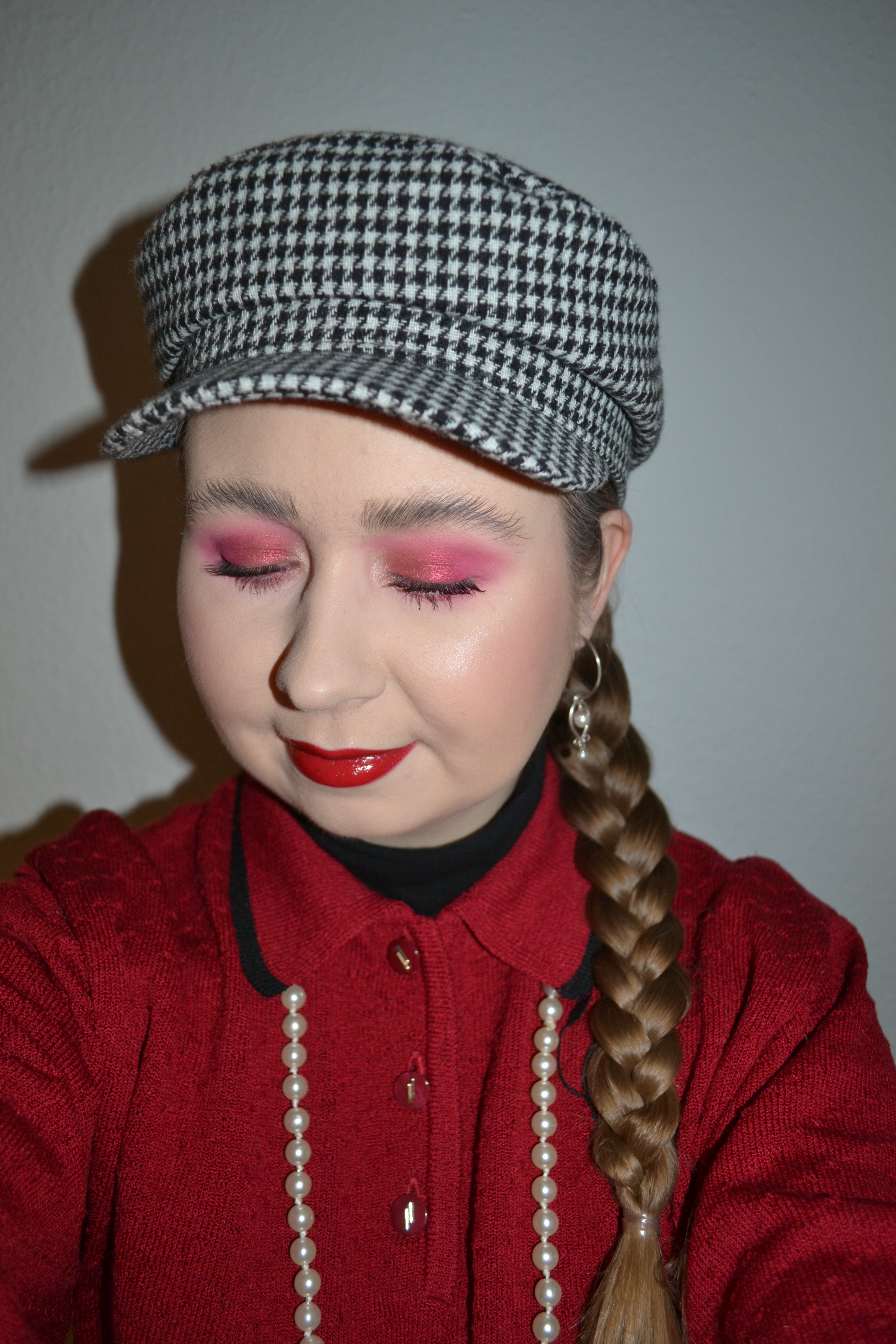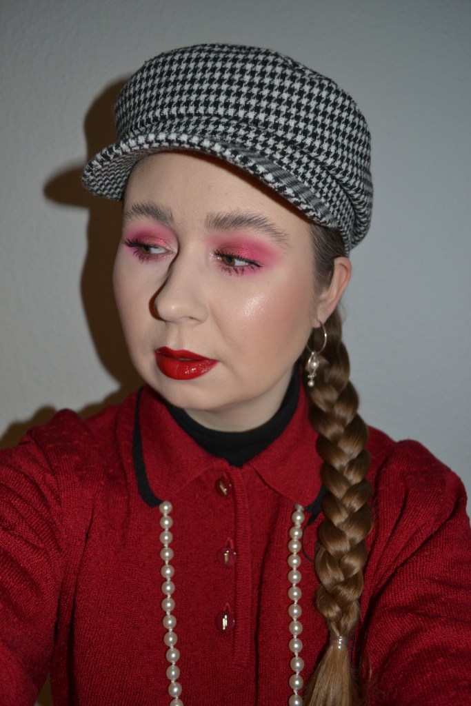 Here’s the make-up I wore with this outfit. The shades of red on my eyes and on my lips are not quite matching, but I don’t really mind, because all the shades still matches my jumper.
