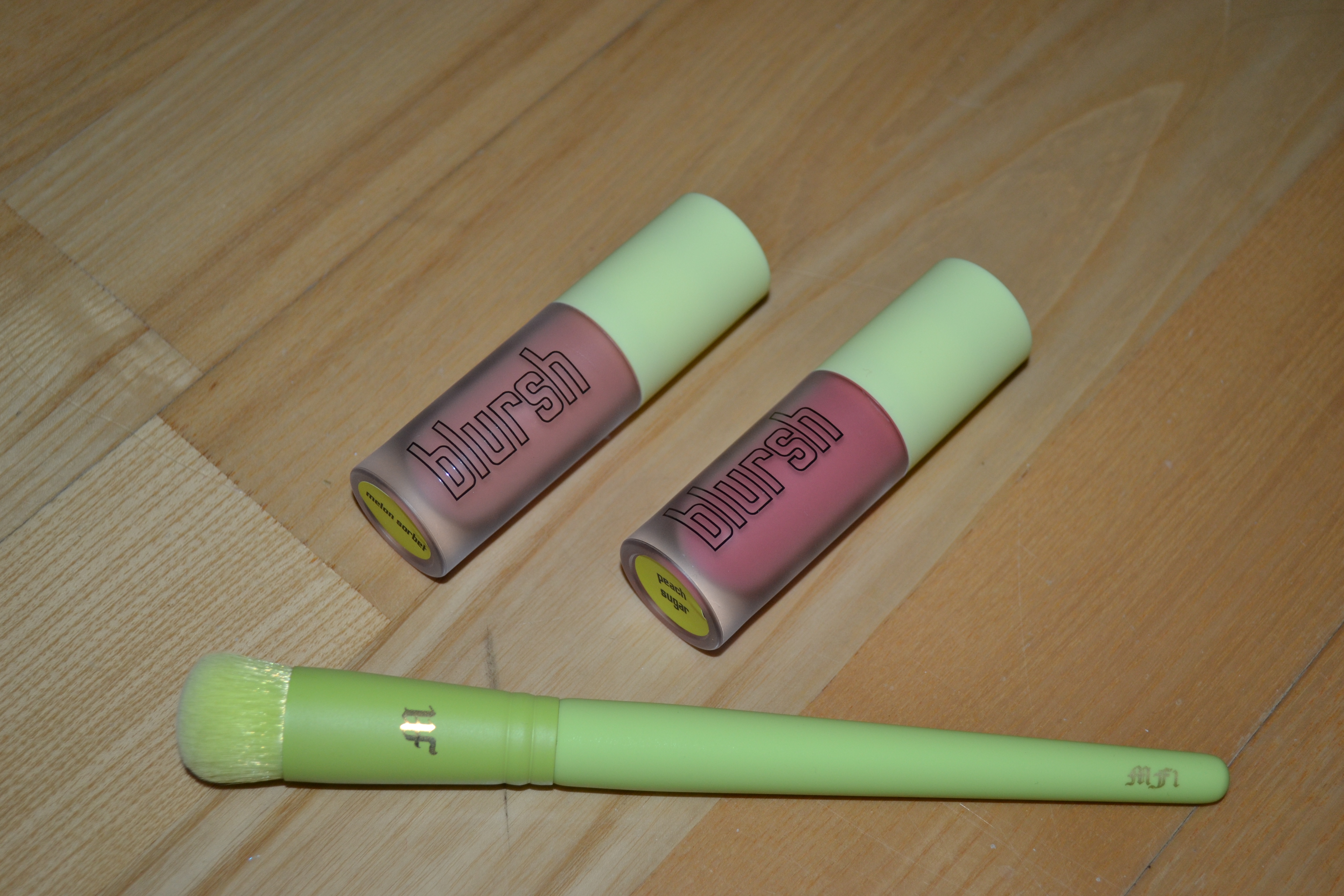 From Made By Mitchell I purchased the Milk Blursh Collection including a white liquid blush in Milk Mix, a purple one in Dairy Queen, and a hot pink one in Cow Lick. I also picked up the Blursh and Brush bundle which includes two blushers in the shades Melon Sorbet and Peach Sugar and a MF1 Face Brush Cheek Stippler. I’m not quite sure I like the brush though. However, I do like the other brush that I picked up, which is the ME3 eye brush Tapered Tickler.
