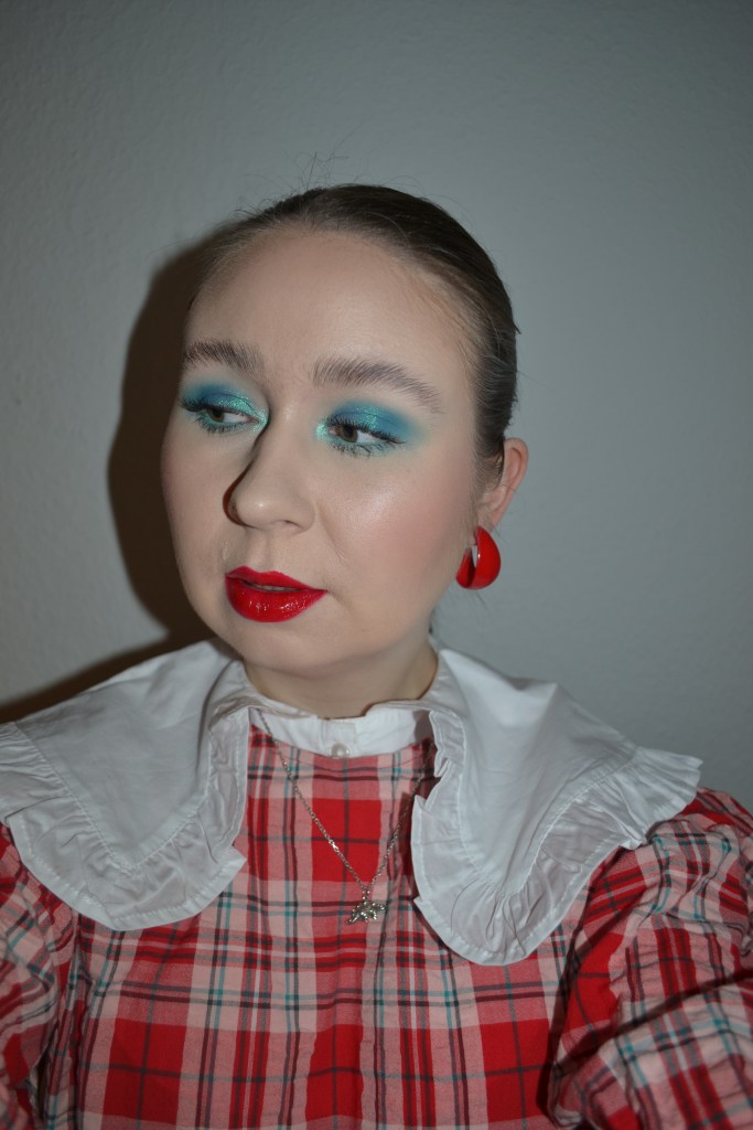 (Base: primer – Essence Prime + Studio Multi-Action + Protecting primer, foundation – e.l.f. Cosmetics Camo CC Cream (shade: Fair 120N), concealers – e.l.f. 16HR Camo matte concealer (shades: Light Sand + Fair Warm), powders – Essence Brighten Up! Banana powder in 10 Bababanana + Catrice All Matt Shine Control powder Healthy Look in 100 Neutral Fresh Beige. Face make-up: bronzer – Fenty Beauty Cheeks Out Freestyle cream bronzer in Butta Bisquit, blusher – MAC Glow Play blush in Grand, highlighter – RMS Beauty Living Luminizer. Eye make-up: base – MAC Pro Longwear Paint Pot in Painterly, eyeshadows – By BEAUTY BAY Disney Colour and BEAUTY BAY Mini Palette in Alice In Wonderland Cheshire Cat (shades: Cheshire Cat Teeth + Cheshire Cat Tree) + Juvia’s Place The Rebel Mint eyeshadow palette (shades: 2. shade top row + 2. shade bottom row) + Juvia’s Place Olori I palette (shade: 5), mascaras – Essence Volume Booster lash primer + Maybelline Lash Sensational Sky High mascara, eyeliner – LA Girl Shockwave Neon Liner in Fresh. Eyebrows: Anastasia Beverly Hills Brow Freeze + Maybelline Brow Ultra Slim pencil in Medium Brown. Lips: Gosh Velvet Touch lipliner in 004 Simply Red + Sephora Collection Glossed Vinyl Intense lip lacquer in 06 All-Powerful Red)