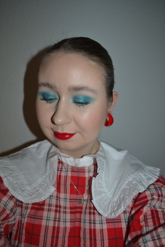Here’s the make-up I wore with this outfit. Why don’t I wear teal eyeshadows more often; it looks so good!