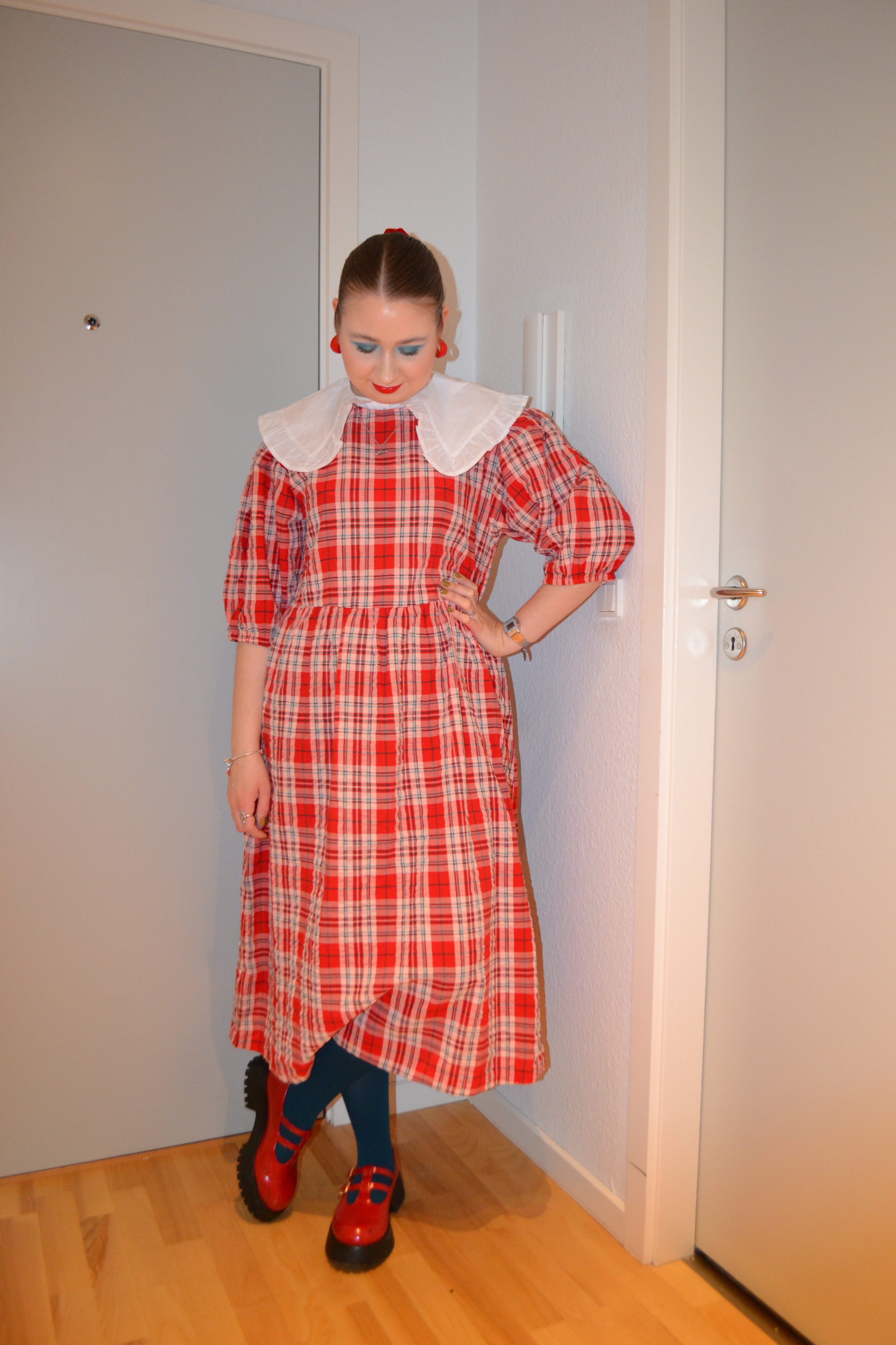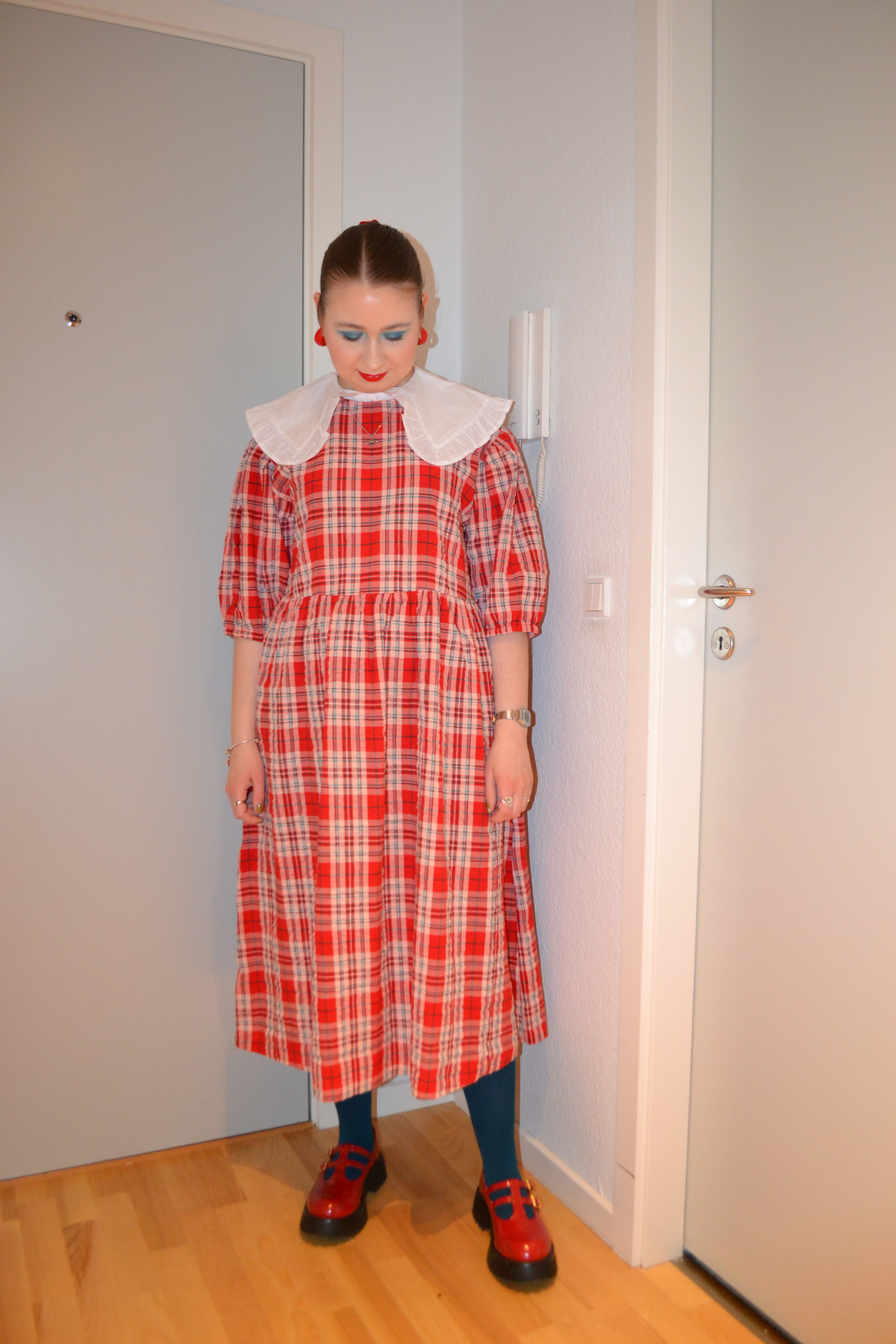 Here’s what I wore Wednesday April 20. I love how doll like this outfit is, and I also love the red and teal together; it makes up such a fun colour combo.