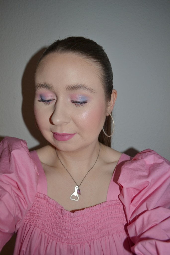 Here’s the make-up I wore with this outfit. This pink dress almost always makes me want to wear pink and blue eyeshadow paired with the same pink lipstick.