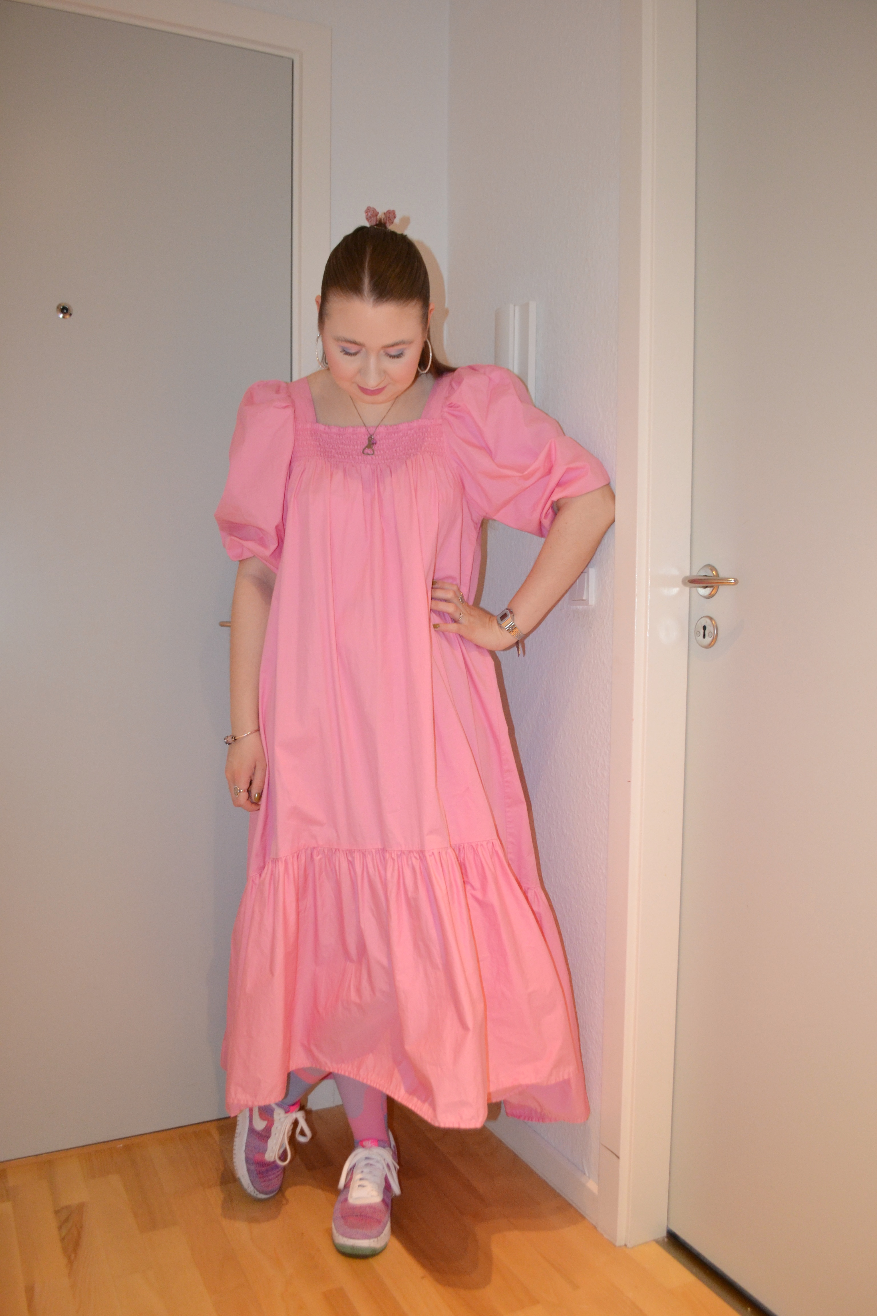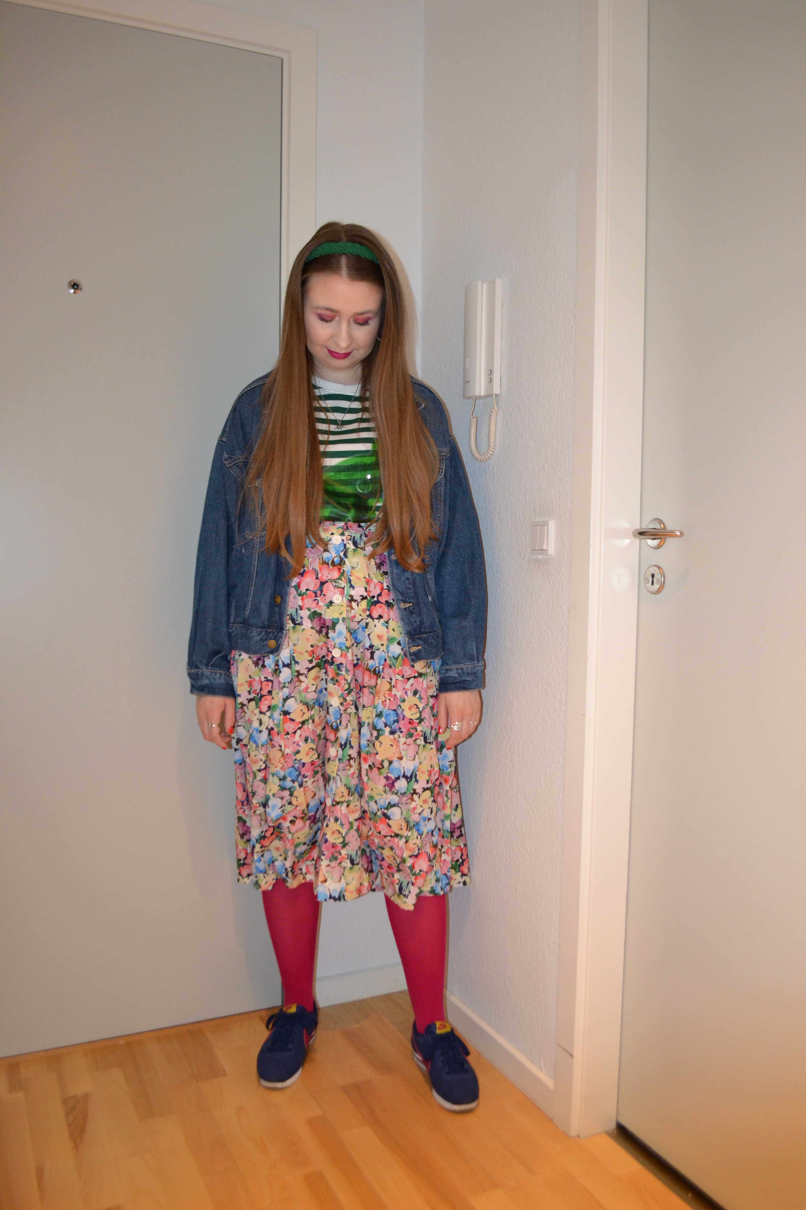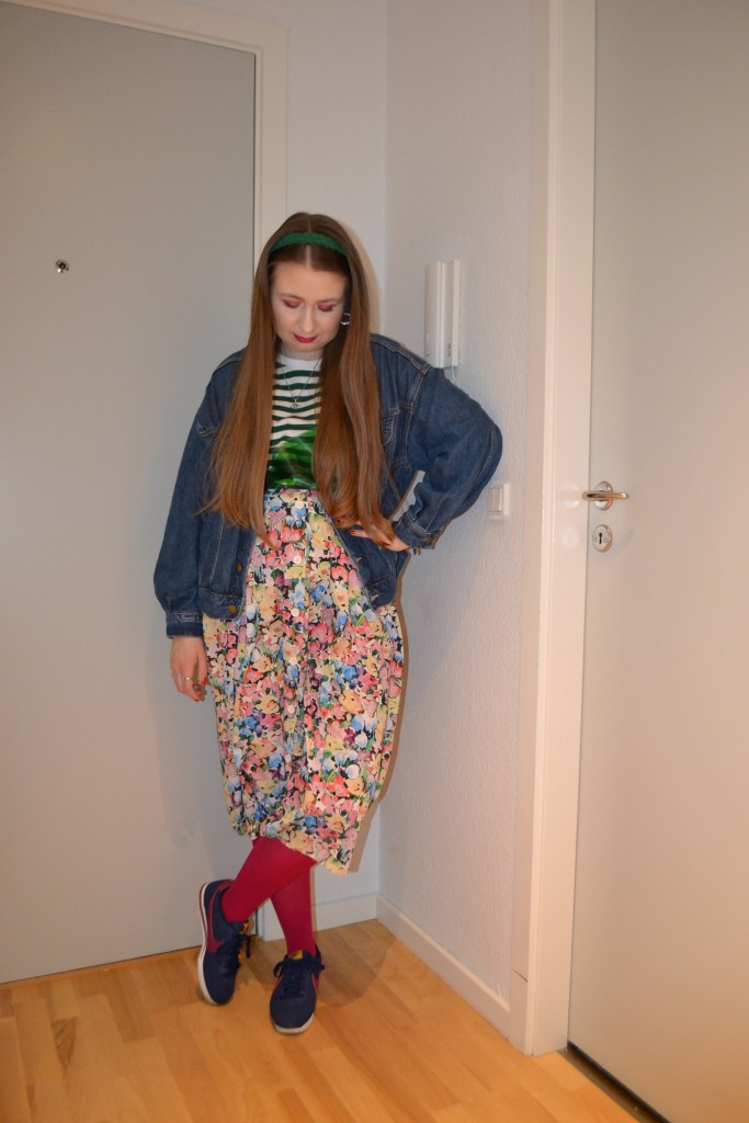 Here’s what I wore Thursday April 21. It’s difficult to find new ways to style this dress, because it makes out most of the outfit, but I think it looks really cute paired with patterned pastel coloured tights and matching sneakers.
