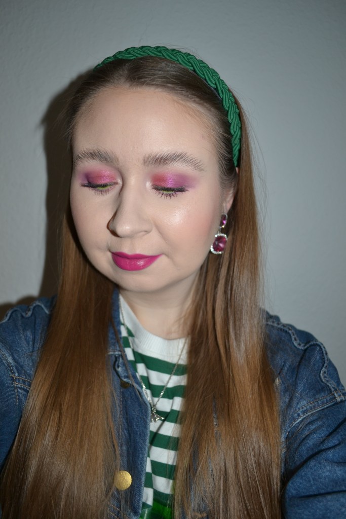 (Base: primer – Essence Prime + Studio Multi-Action + Protecting primer, foundation – L’Oreal Infaillible 24H Fresh Wear foundation (shade: 015 Porcelain), concealers – L’Oréal Infaillible More Than Concealer (shade: 322 Ivory) + e.l.f. Cosmetics Flawless Brightening concealer (shade: Fair 10 C), powder – e.l.f. Cosmetics Halo Glow setting powder. Face make-up: bronzer – e.l.f. Cosmetics Putty bronzer in Tan Lines, blusher – e.l.f. Cosmetics Putty blush in Turks and Caicos, highlighter – Anastasia Beverly Hills Stick Highlighter in Pink Diamond. Eye make-up: base – MAC Pro Longwear Paint Pot in Painterly, eyeshadows – Essence Welcome to Miami eyeshadow palette (shades: 2 + 6 + 7 + 8) + MAC Nylon eyeshadow, mascaras – Essence Volume Booster lash primer + Maybelline Lash Sensational Sky High mascara, eyeliner – LA Girl Shockwave Neon Liner in Gotcha. Eyebrows: Anastasia Beverly Hills Brow Freeze + Maybelline Brow Ultra Slim pencil in Medium Brown. Lips: NYX Slim lip pencil in Fuchsia + Make Up Store lipstick in Pink Bliss Eden)
