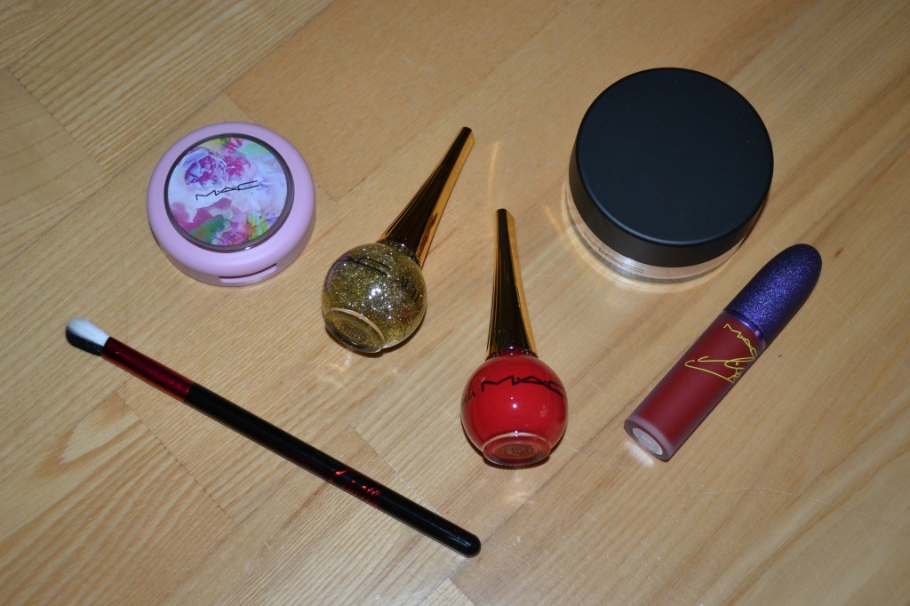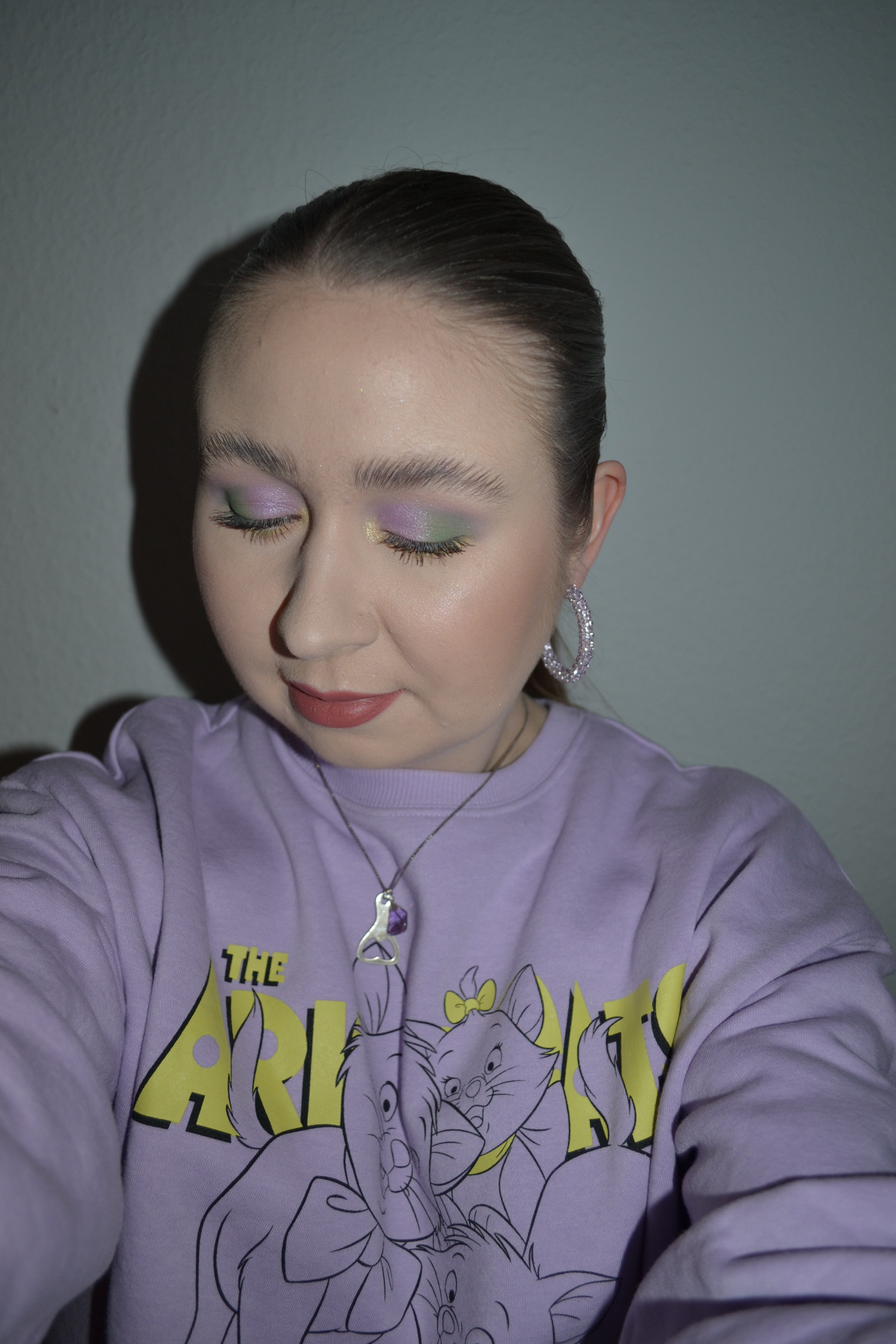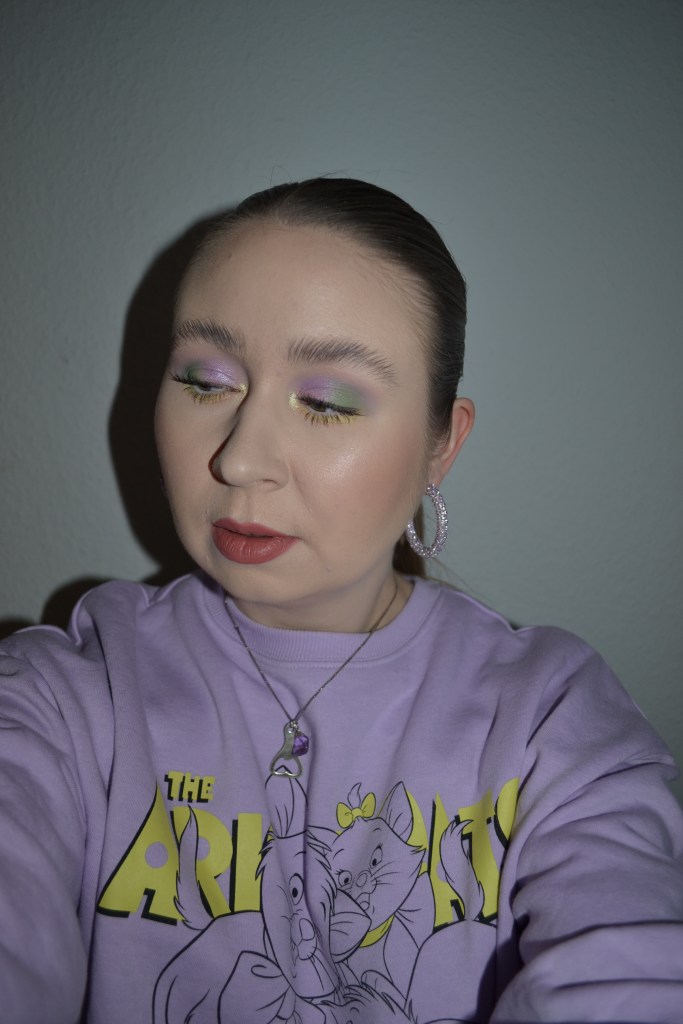 (Base: primers – Essence Skin Lovin’ Sensitive primer + Essence Glow Glow Go! Instant highlighter in 01 Fairy Lights, foundation – L’Oreal Paris Infaillible 24H Fresh Wear foundation (shade: 015 Porcelain), concealers – L’Oréal Infaillible More Than Concealer (shade: 322 Ivory) + Essence Skin Lovin’ Sensitive concealer (shade: 05 Fair), powders – e.l.f. Cosmetics HD Undereye setting powder in Sheer + Essence Skin Lovin’ Sensitive mineral powder (shade: 01 Translucent). Face make-up: bronzer – MAC Radiant Matte bronzing powder (shade: Beige-ing Beauty), blushers – e.l.f. Cosmetics baked blush in Rich Rose, highlighter – Becca Shimmering Skin Perfector pressed highlighter (shade: Vanilla Quartz). Eye make-up: base – MAC Pro Longwear Paint Pot in Painterly, eyeshadows – By BEAUTY BAY Jade Thirlwall x BEAUTY BAY 42 colour palette (shades: Intention + Nefertiti + Capricorn + Heritage + Starry Eyed) + MAC Nylon eyeshadow, mascaras – Essence Volume Booster lash primer + Maybelline Lash Sensational Sky High mascara, eyeliner – MAC Teddy eye kohl. Eyebrows: Anastasia Beverly Hills Brow Freeze + Maybelline Brow Ultra Slim pencil in Medium Brown. Lips: Morphe x Nyane Color pencil in Lavender Haze + Morphe x Nyane lipstick in Zuri)