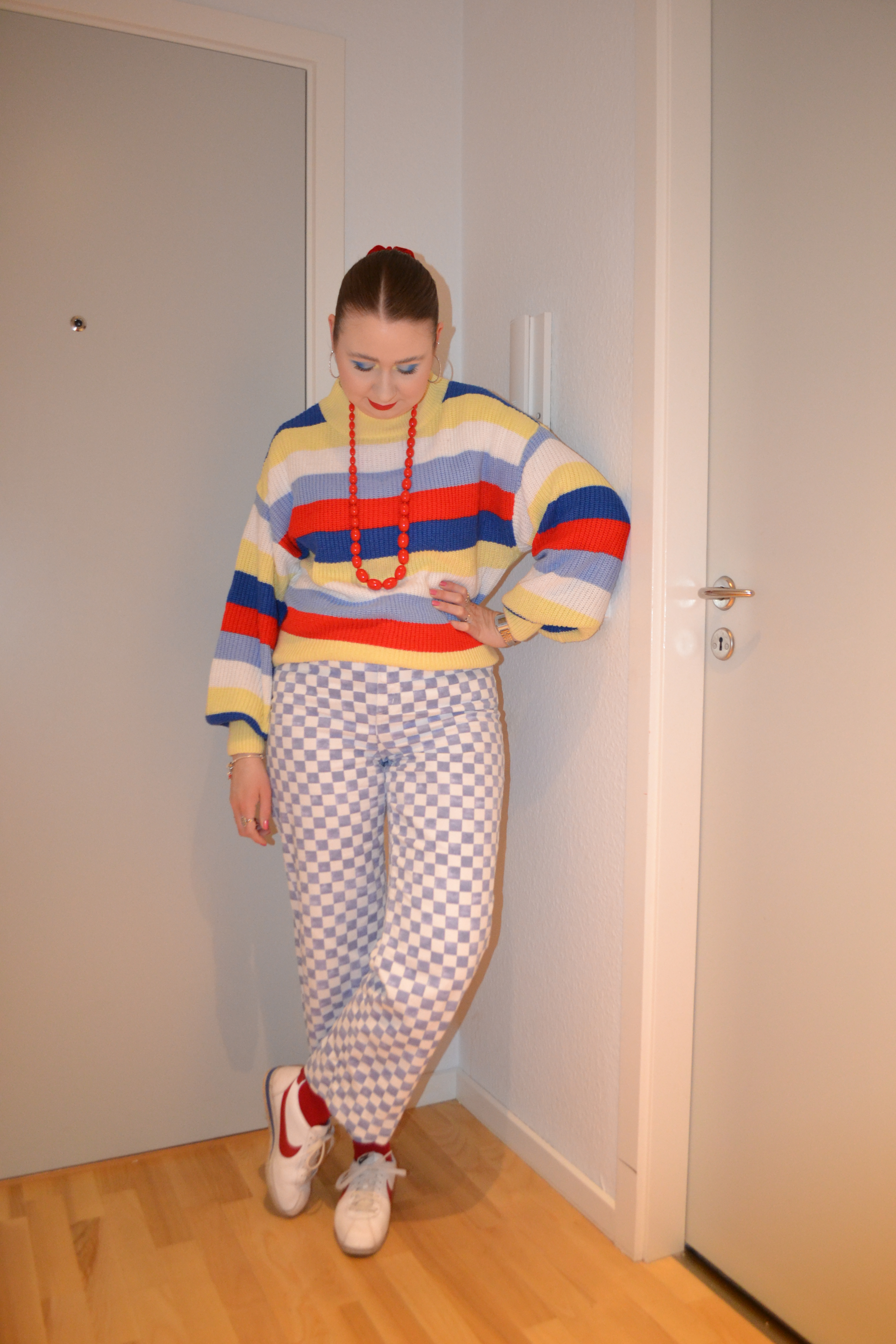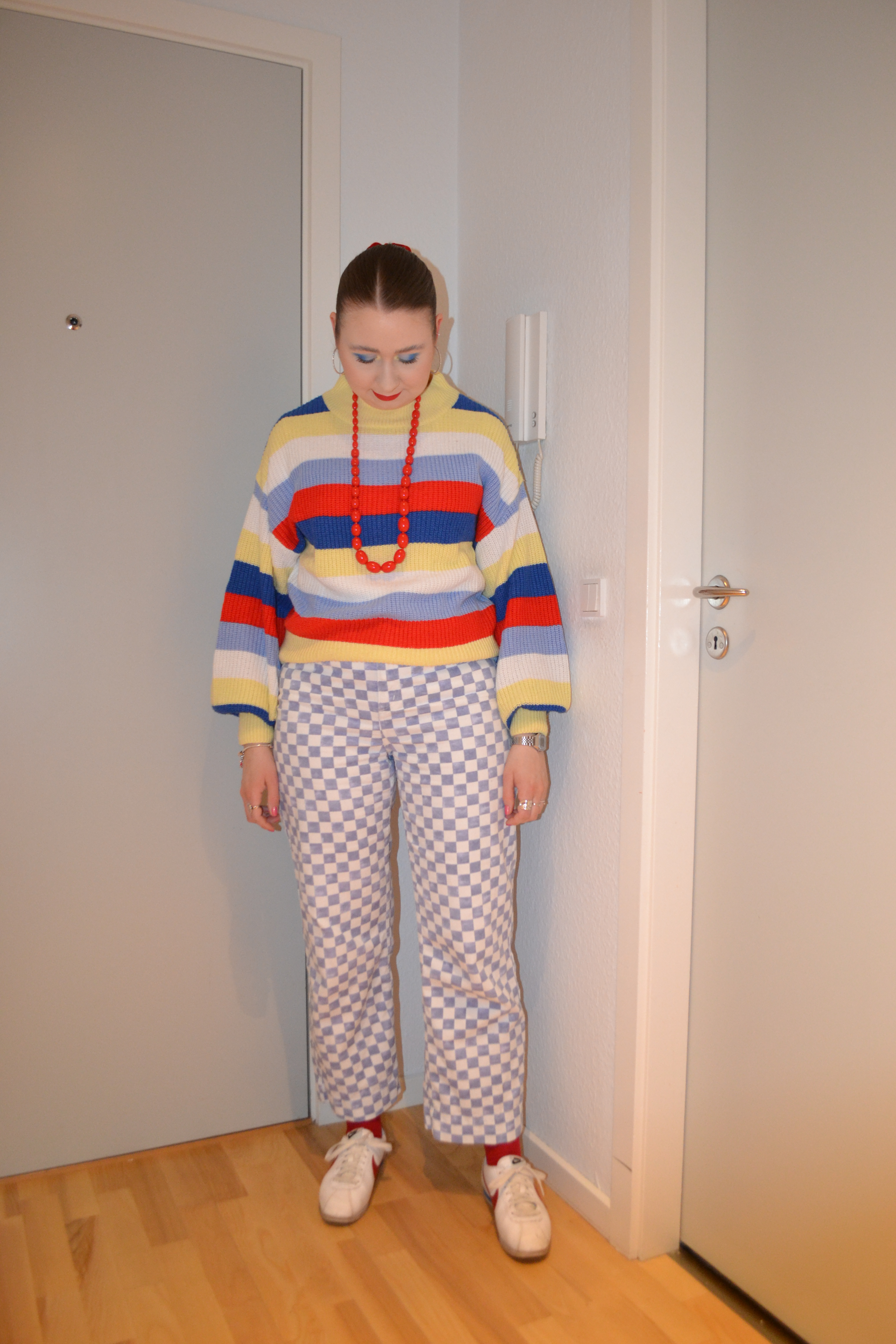 Here’s the make-up I wore with this outfit. I usually wear orange make-up with the orange 70’s dress, but this time around I decided to go for a brown smokey eye and a deep purple lip, and I really like this overall dark look.