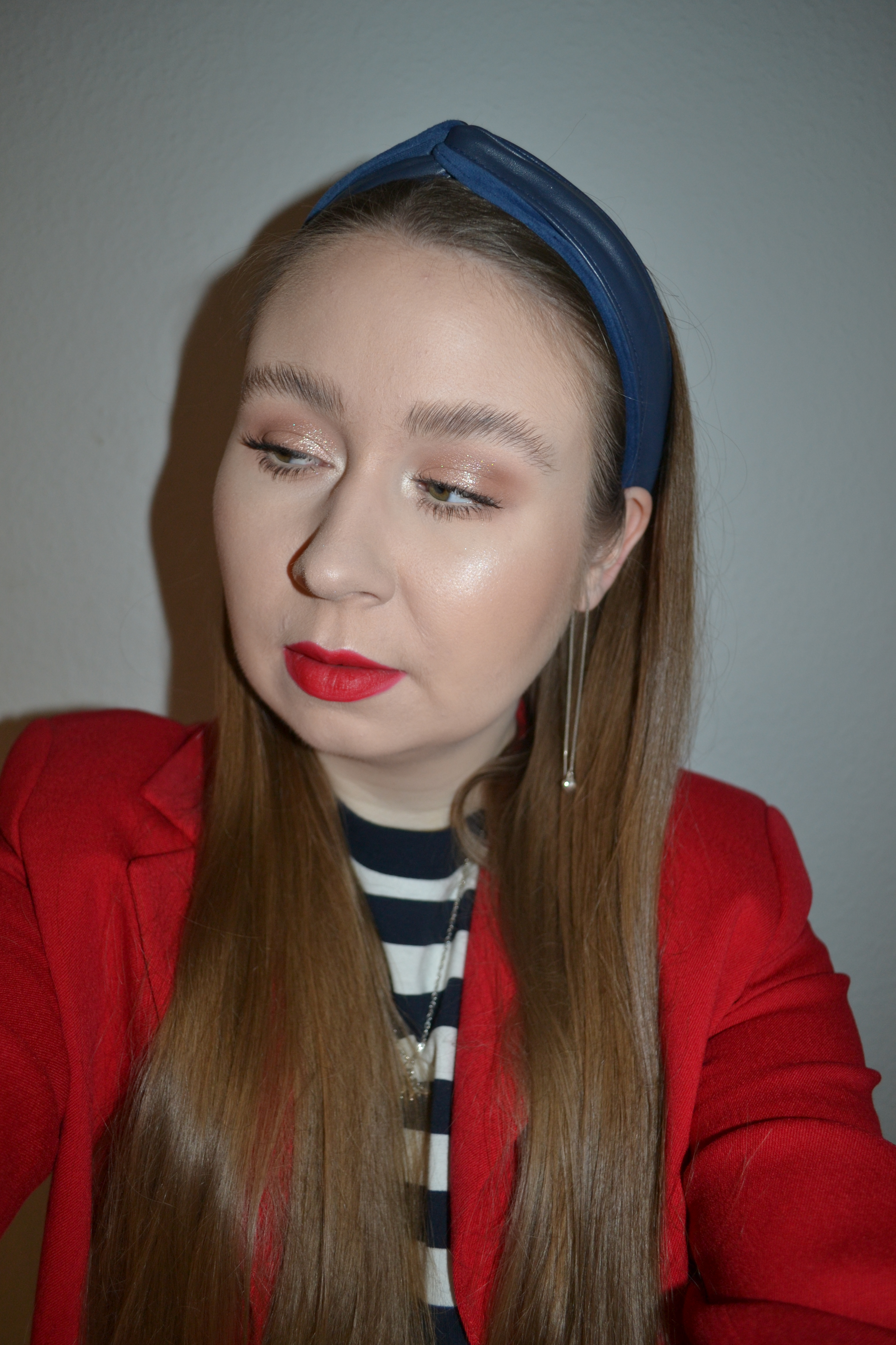 (Base: primers – Tarte Timeless Smoothing primer + Charlotte Tilbury Hollywood Flawless Filter (shade: 1 Fair), foundation – L’Oréal Paris True Match Nude plumping tinted serum (shade: 0,5-2 Very Light), concealer – Rimmel The Multi-Tasker concealer (shade: 020 Fair), powders – Essence Brighten Up! Banana powder in 10 Bababanana + Catrice All Matt Shine Control powder Healthy Look in 100 Neutral Fresh Beige. Face make-up: bronzer – Catrice Bronze Away to… baked bronzing & highlighting palette in C01 Costa Rica (bottom row bronzer), blusher – Too Faced Love Flush Water Colour blush in California Love, highlighter – Catrice Bronze Away to… baked bronzing & highlighting palette in C01 Costa Rica (bottom row highlighter). Eye make-up: base – MAC Pro Longwear Paint Pot in Painterly, eyeshadows – BH Cosmetics Opalescent palette (shades: Flutter + Grace + Gorgeous) + KVD Beauty Dazzle Stick long-wear eyeshadow in Hail Surge + MAC Nylon eyeshadow, mascaras – Maybelline Colossal mascara + MAC Extended Play Gigablack Lash mascara, eyeliner – MAC Studio Chromagraphic pencil in NC15/NW20. Eyebrows: Anastasia Beverly Hills Brow Freeze + Maybelline Brow Ultra Slim pencil in Medium Brown. Lips: Essence lipliner in 14 Femme Fatale + MAC Powder Kiss lipstick in Werk, Werk, Werk)