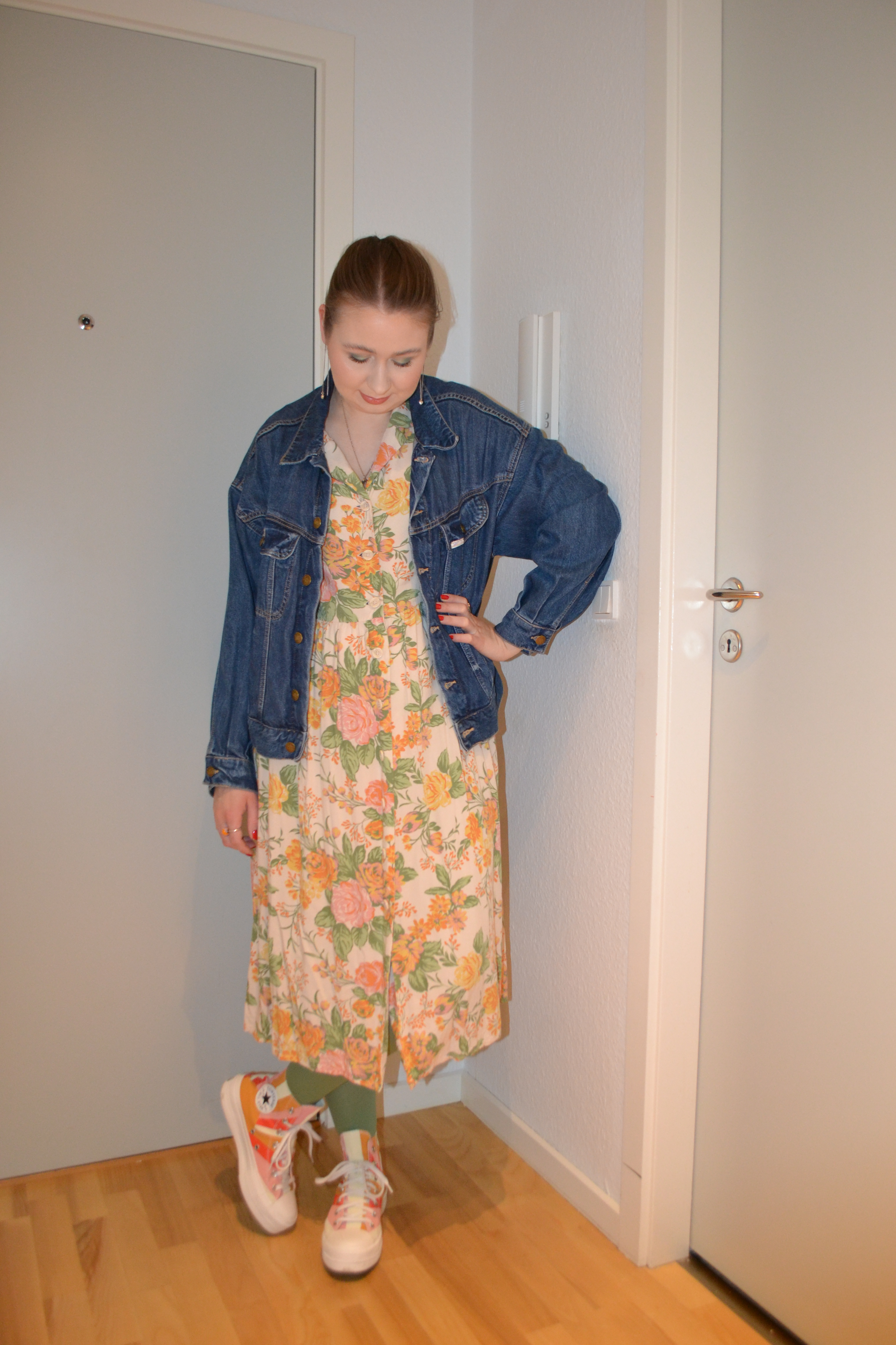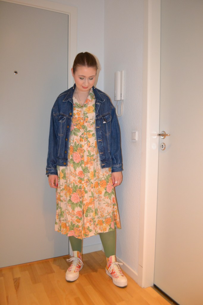 (Denim jacket – H&M, dress – Monki, tights – Asos Design, sneakers – Converse)