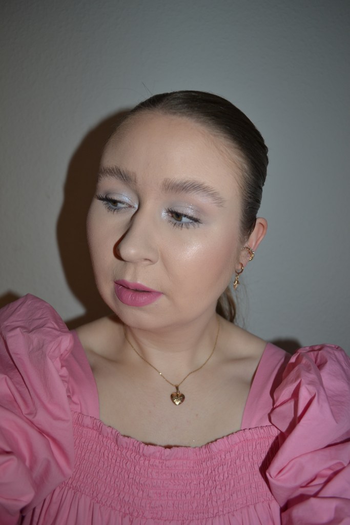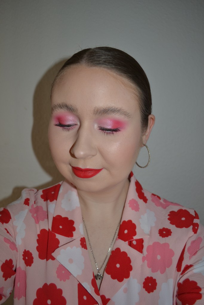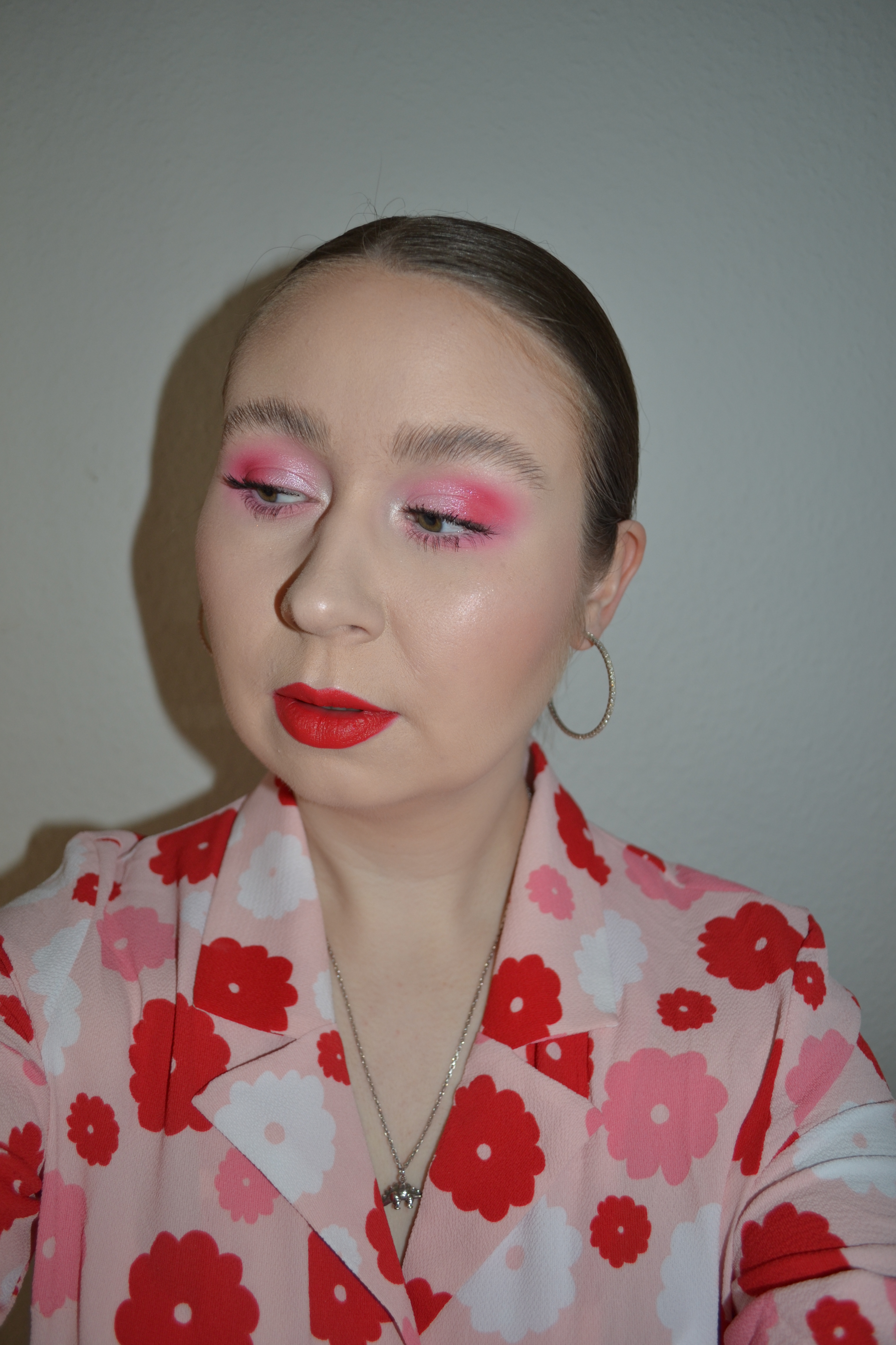 (Base: primer – Urban Decay All Nighter face primer, foundation – L’Oreal Infaillible 24H Fresh Wear foundation (shade: 015 Porcelain), concealers – L’Oréal Infaillible More Than Concealer (shade: 322 Ivory) + e.l.f. Cosmetics Flawless Brightening concealer (shade: Fair 10 C), powder – Laura Mercier Translucent Loose setting powder. Face make-up: bronzer – e.l.f. Cosmetics Putty bronzer in Tan Lines, blusher – e.l.f. Cosmetics Putty blush in Bora Bora, highlighter – Wet n Wild MegaGlo highlighting powder in Blossom Glow. Eye make-up: base – MAC Pro Longwear Paint Pot in Painterly, eyeshadows – Essence eyeshadow in 05 Granny Pants + Jeffree Star Cosmetics Pink Religion palette (shades: Saint Star + Sugar Savior + Holy Fire + Frosting Cult + Princess Crown) + MAC Nylon eyeshadow, mascaras – MAC M·A·CStack mascara, eyeliner – NYX Faux Whites eyeliner in Seashell. Eyebrows: Anastasia Beverly Hills Brow Freeze + Maybelline Brow Ultra Slim pencil in Medium Brown. Lips: Gosh Velvet Touch lipliner in 004 Simply Red + MAC De Vil In The Details lipstick)