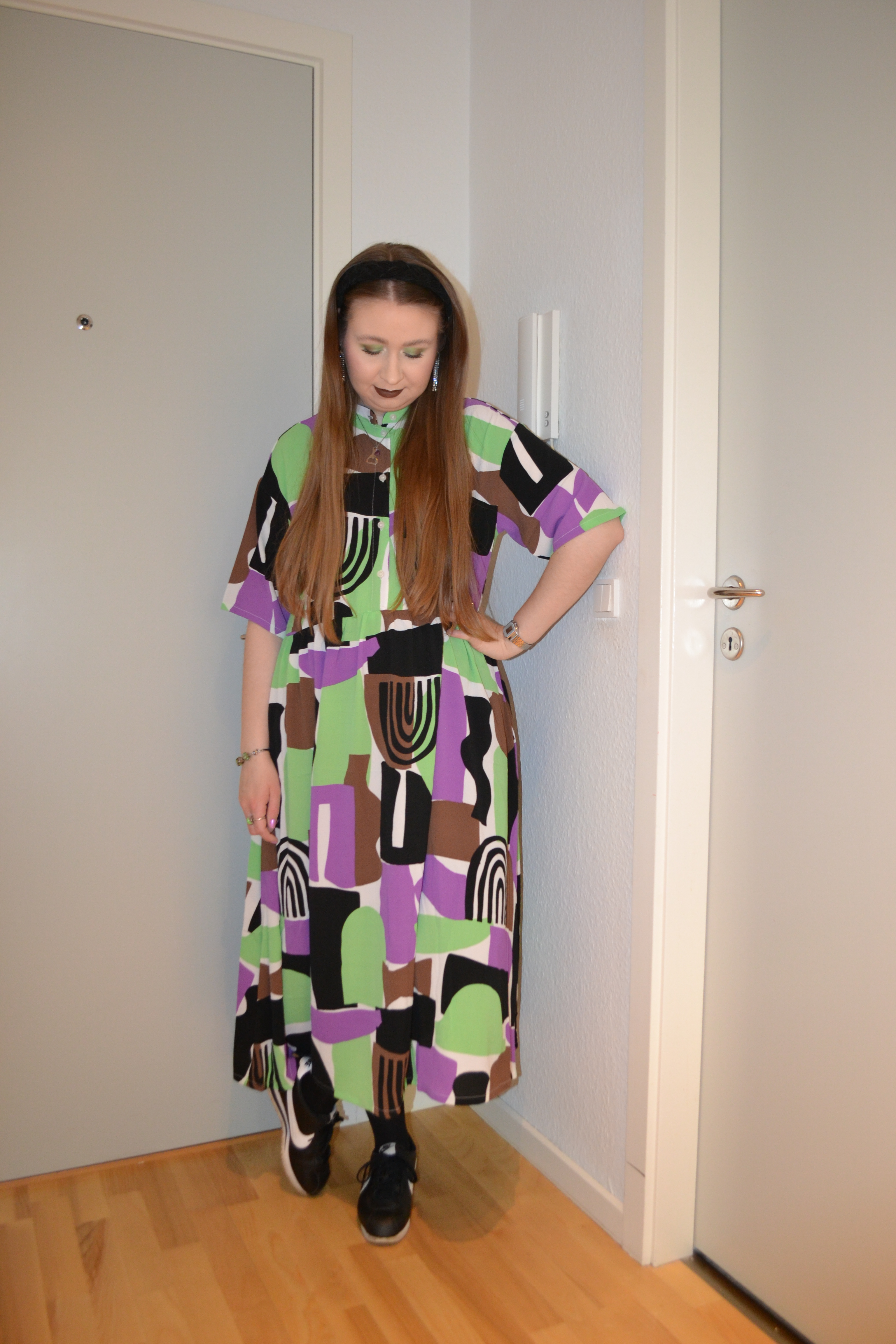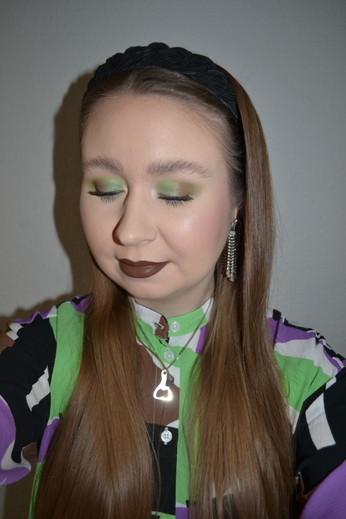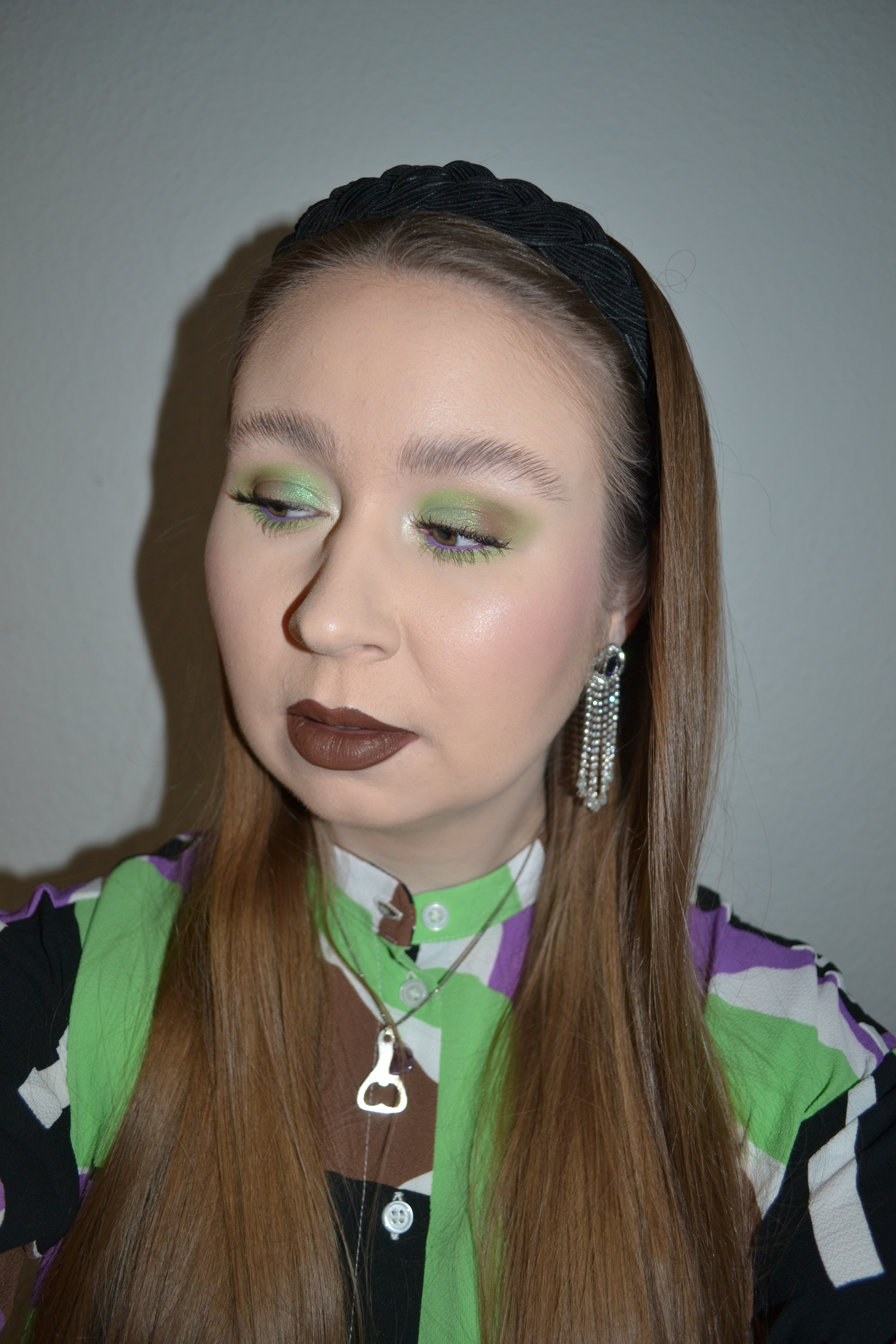 Here’s the make-up I wore with this outfit. I think this green eye look turned out really nice; the addition of brown and a pop of purple on the waterline works so well.