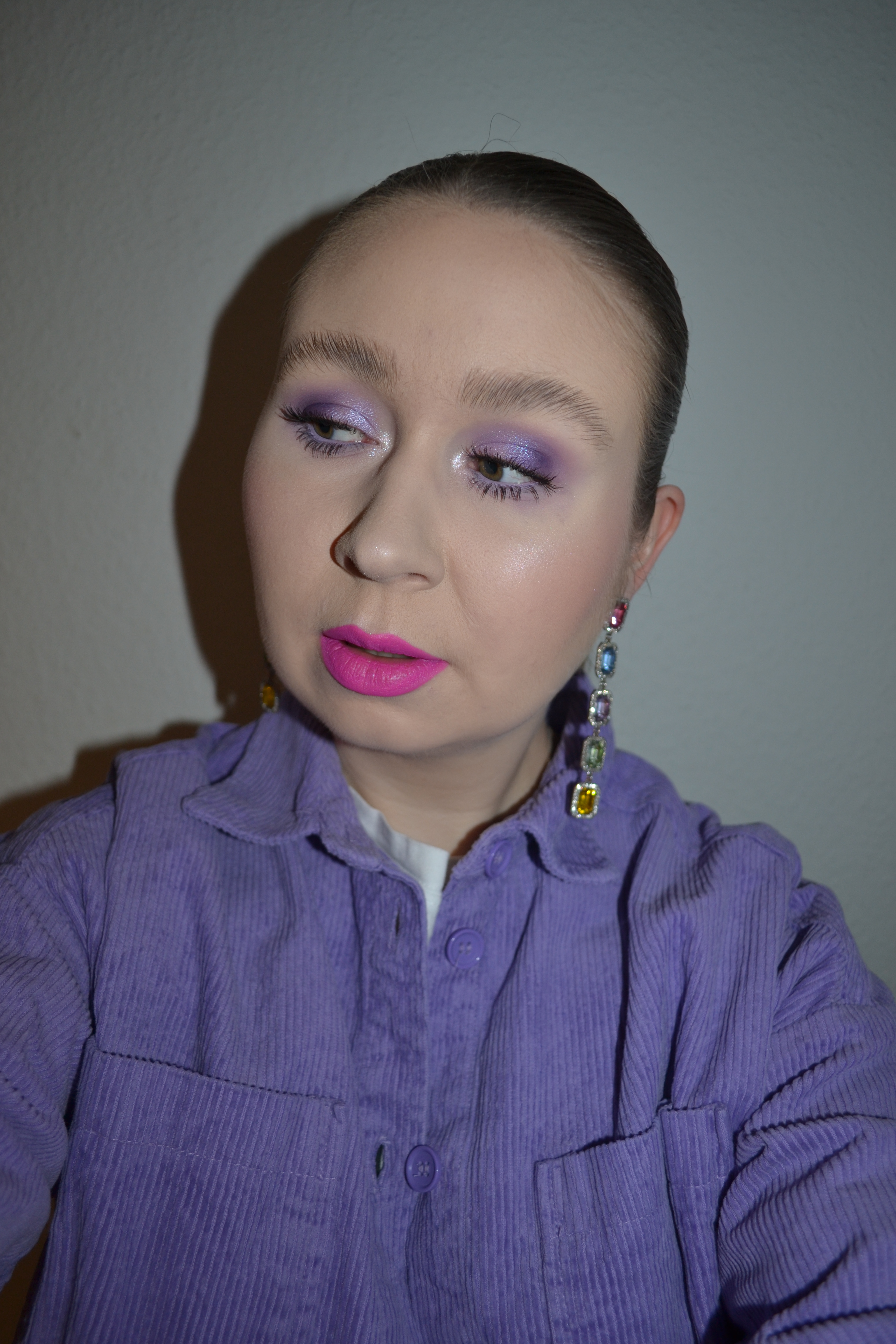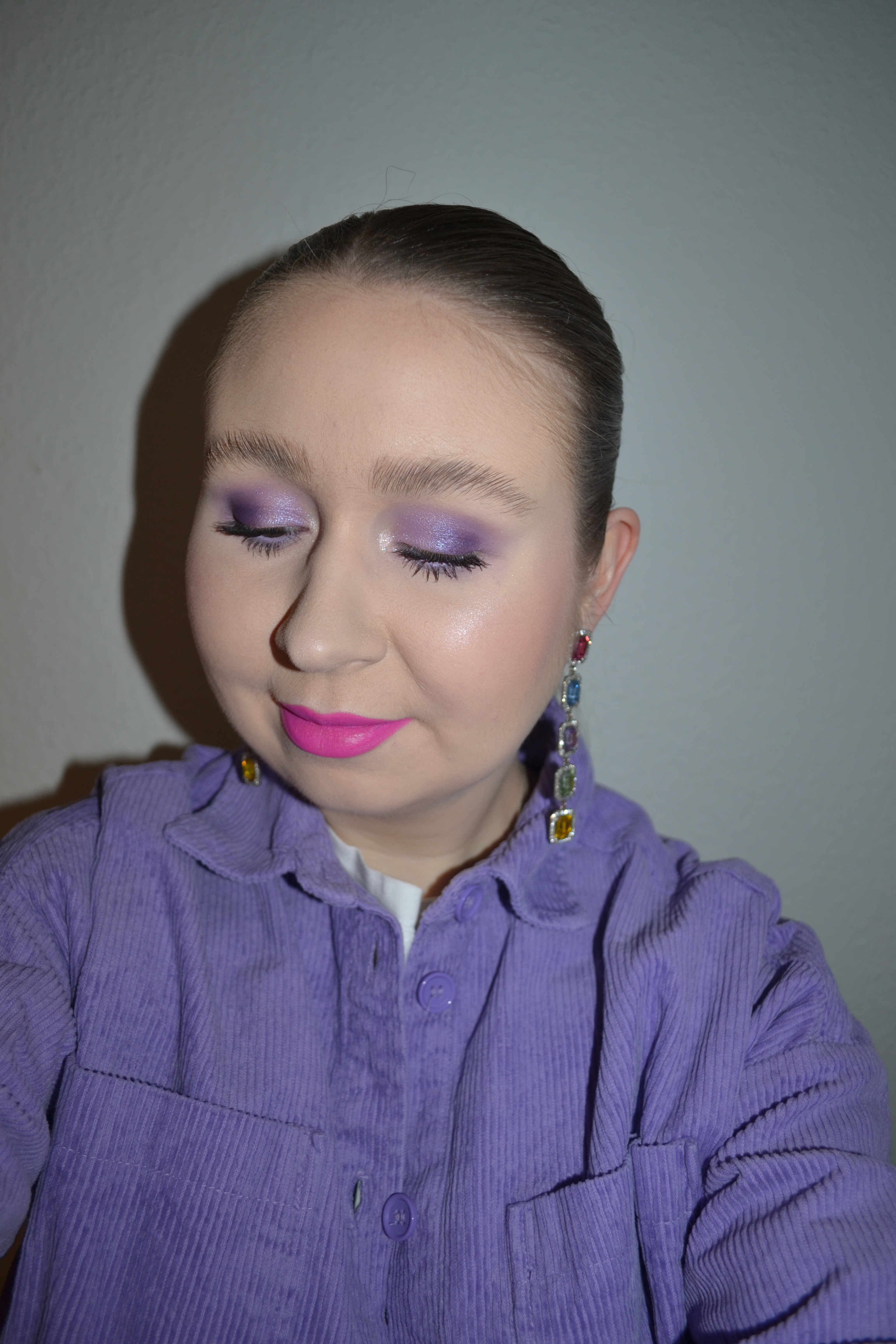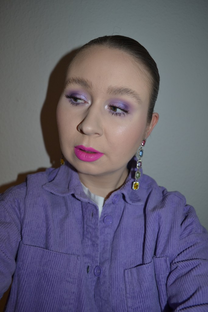 (Base: primer – NYX The Marshmellow primer, foundation – Maybelline Fit Me Matte + Poreless foundation (shade: 110 Porcelain), concealers – L’Oréal Infaillible More Than Concealer (shade: 322 Ivory) + e.l.f. Cosmetics Flawless Brightening concealer (shade: Fair 10 C), powders – Jeffree Star Cosmetics Magic Star setting powder in Lavender + Fair. Face make-up: bronzer – NABLA Skin Bronzing in Ambra, blusher – Dior Backstage Rosy Glow blush in 001 Pink, highlighter – Essence Glow Like A Pro loose highlighter (04 Purple Scandal). Eye make-up: base – MAC Pro Longwear Paint Pot in Painterly, eyeshadows – Essence eyeshadow in 05 Granny Pants + Juvia’s Place The Violets eyeshadow palette (shades: 1. & 2. & 3. shade bottom row) + MAC Extra Dimension foil eyeshadow in Cooler Than Being Cool, mascara – MAC M·A·CStack mascara, eyeliner – Revolution x Bratz Yasmin eye pencil. Eyebrows: Anastasia Beverly Hills Brow Freeze + Maybelline Brow Ultra Slim pencil in Medium Brown. Lips: MAC Shock Value Pro Longwear lip pencil + MAC Doo-Wop lipstick)