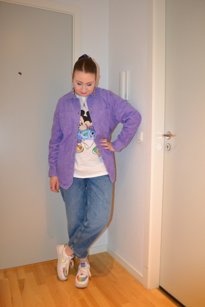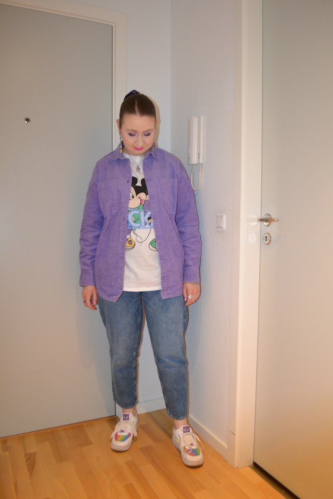 I picked up two shirts, and you’ve already seen me wear both. The purple fleece shirt is boxy and cropped, and the orange shirt is oversized.