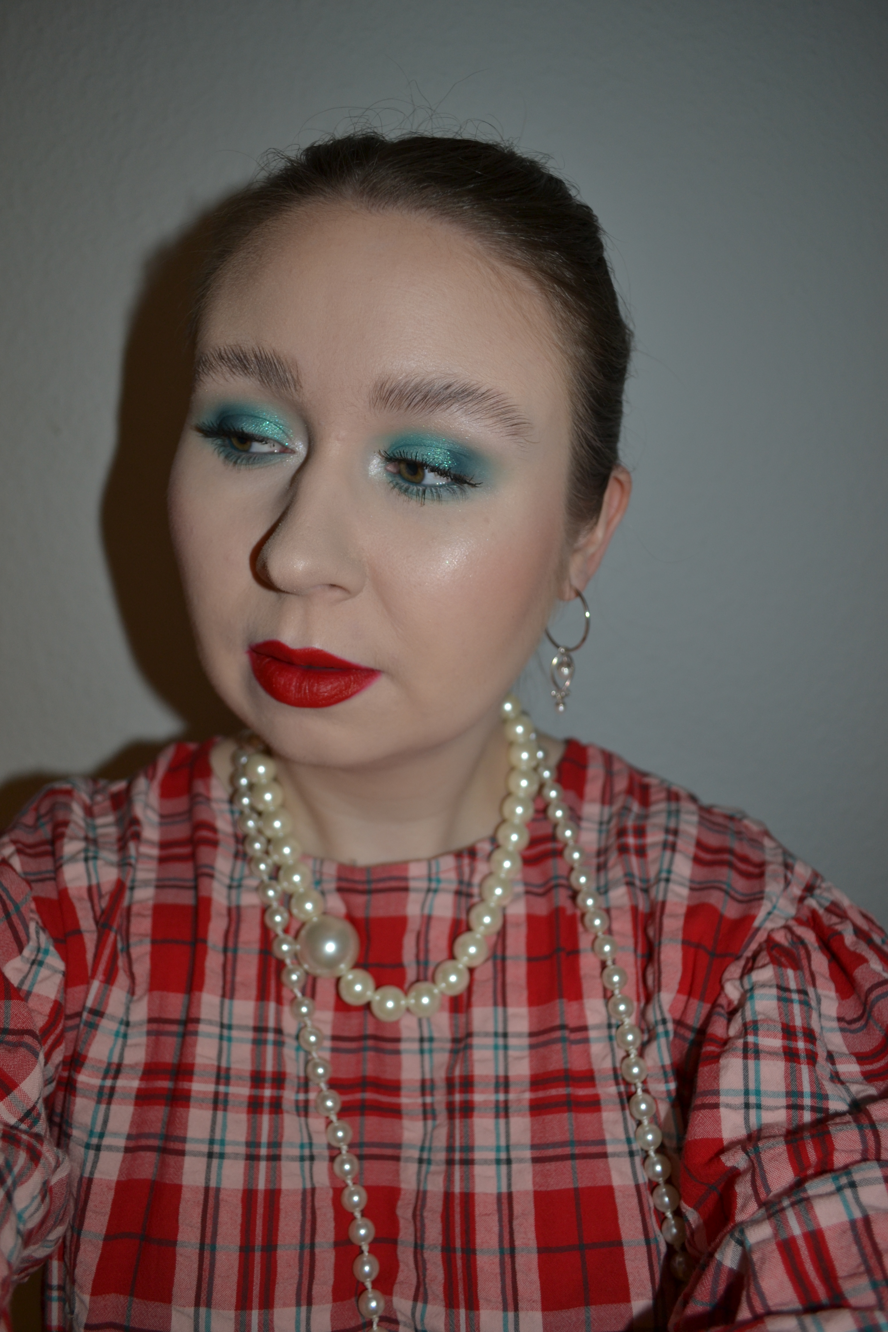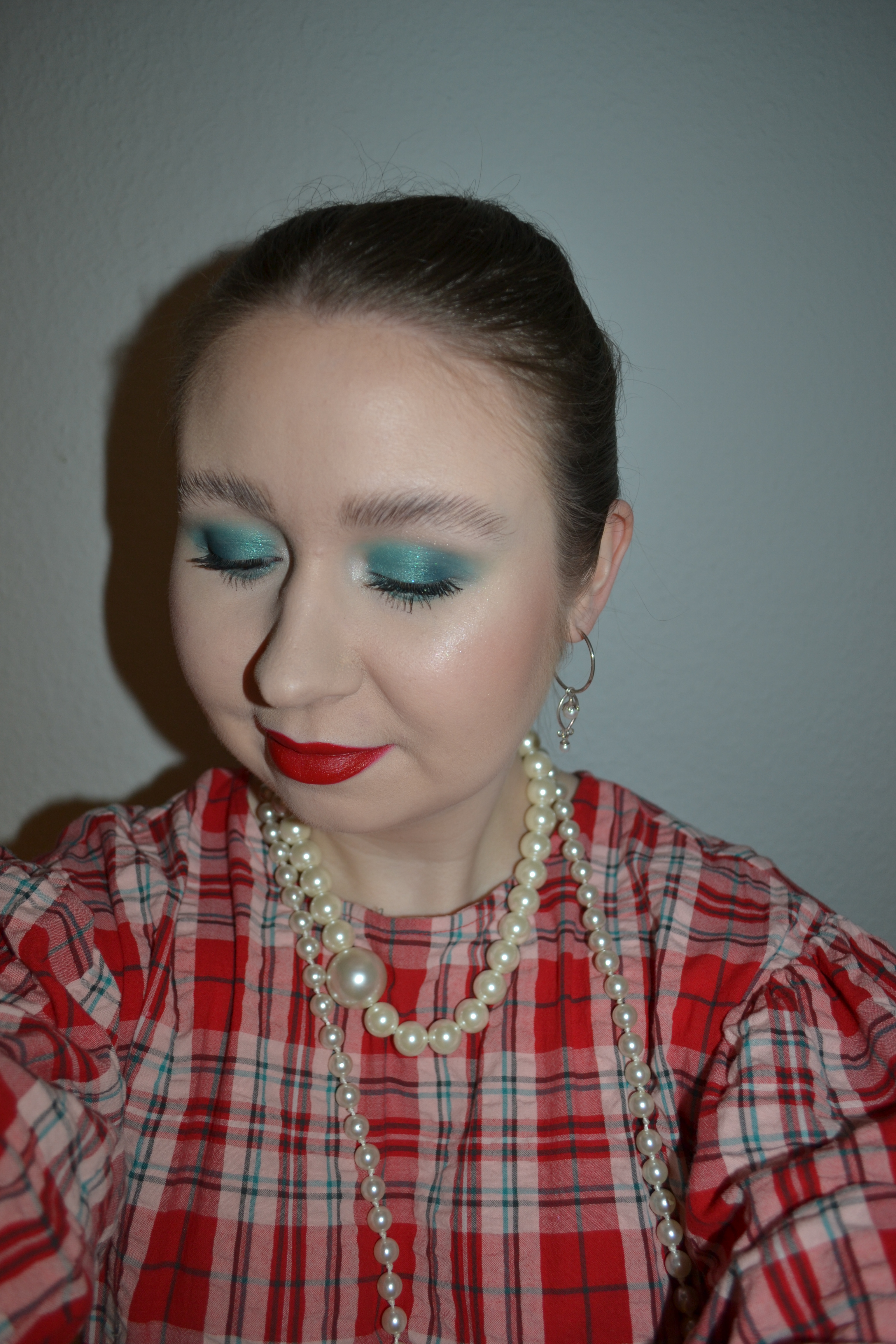 Here’s the make-up I wore with this outfit. I love my Jeffree Star Cosmetics Blue Blood palette, but for some reason I haven’t used the teal shades in the palette very much. I’m glad that I rediscovered them, because I think this eye look is so pretty.