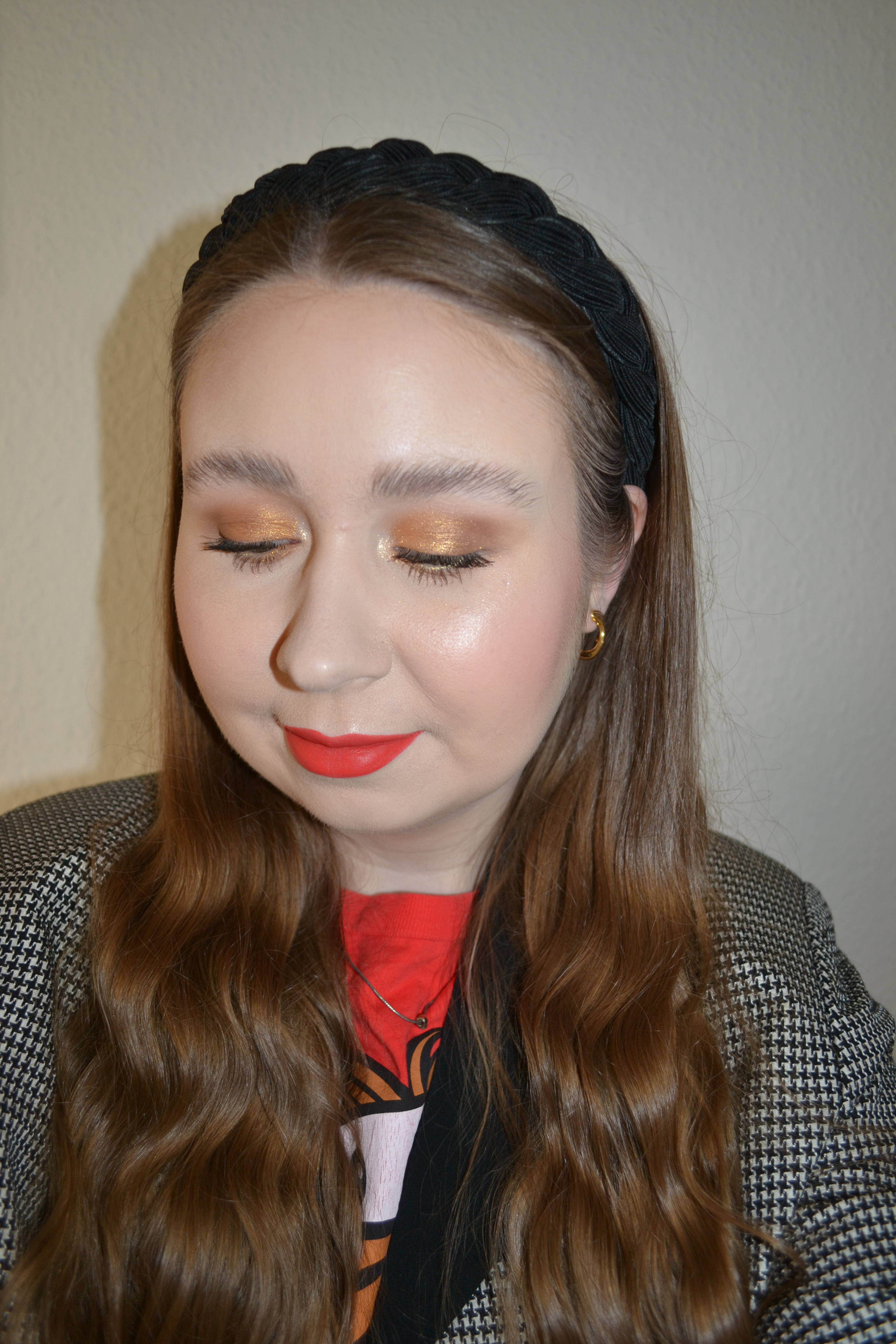 (Base: primers – Essence Catching Clouds Cloud-touch Mousse Primer in 01 Up On Cloud + MAC Prep + Prime Natural Radiance Illuminating Base (shade: Radiant Yellow), foundation – Maybelline Dream Urban Cover foundation (shade: 100 Warm Ivory), concealers – Rimmel The Multi-Tasker concealer (shade: 020 Fair) + NYX Born To Glow radiant concealer (shade: Pale), powder – Laura Mercier Translucent Loose setting powder. Face make-up: bronzer – e.l.f. Cosmetics Putty bronzer in Tan Lines, blusher – Natasha Denona Diamond & Blush palette in 01 Darya Coral (shade: Cream Blush), highlighters – Natasha Denona Diamond & Blush palette in 01 Darya Coral (shades: Glow Cream Base + Glow Extreme + Diamond Powder). Eye make-up: base – MAC Pro Longwear Paint Pot in Painterly, eyeshadows – Essence eyeshadow in 05 Granny Pants + Natasha Denona Gold palette (shades: Sand Stone + Teak + Alchemist + Oro + Sparks), mascara – MAC M·A·CStack mascara, eyeliner – Marc Jacobs Highliner Glam Glitter gel eye crayon in All That Glitters. Eyebrows: Anastasia Beverly Hills Brow Freeze + Maybelline Brow Ultra Slim pencil in Medium Brown. Lips: Jeffree Star Cosmetics Velour liquid lipstick in Anna Nicole)
