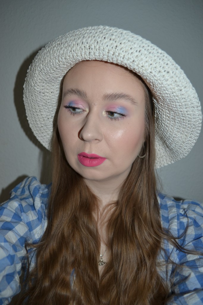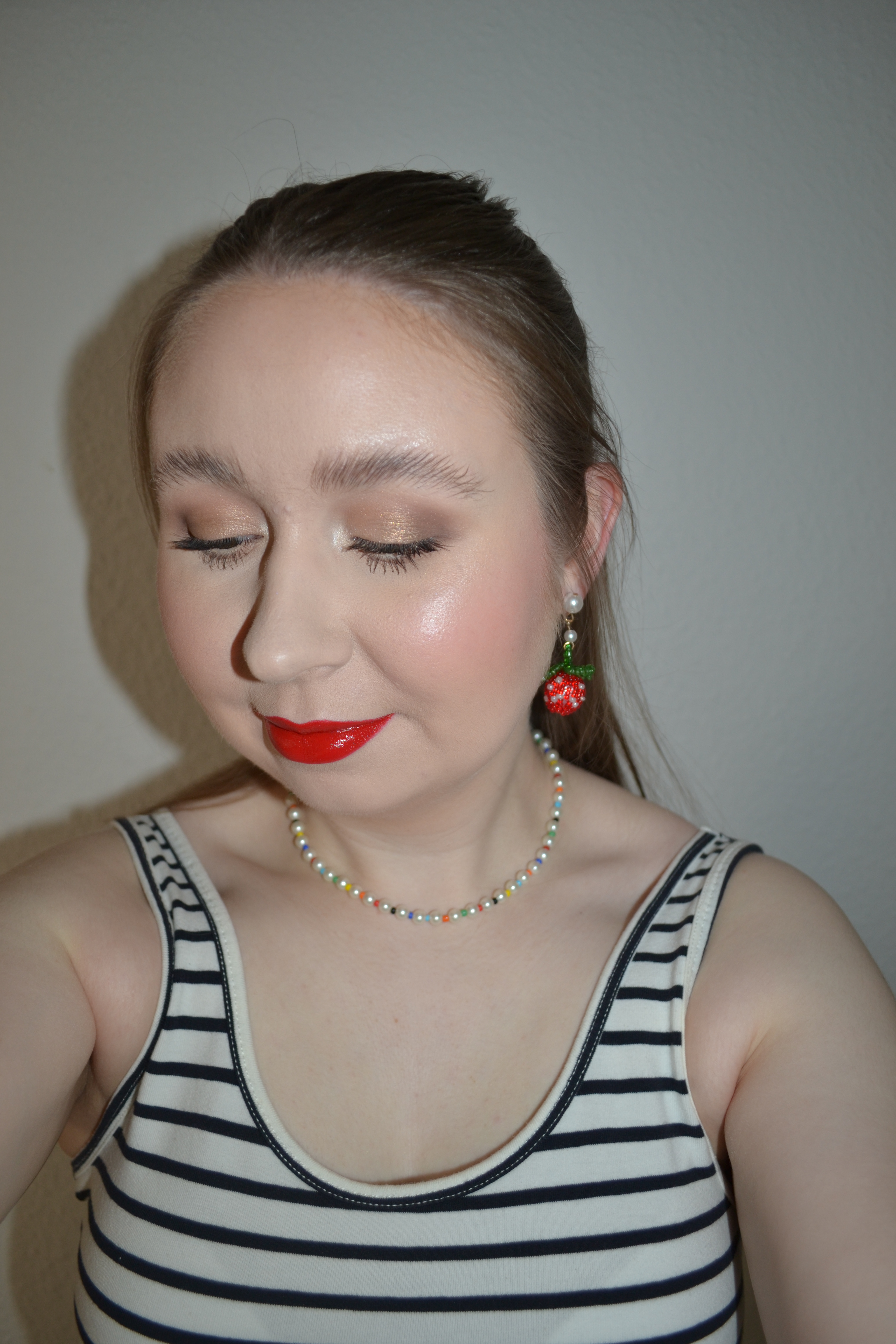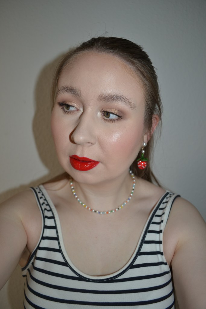(Base: primer – Maybelline Fit Me Matte + Poreless primer, foundation – L’Oréal Paris True Match Nude plumping tinted serum (shade: 0,5-2 Very Light), concealers – Rimmel The Multi-Tasker concealer (shade: 020 Fair) + NYX Born To Glow radiant concealer (shade: Pale), powders – Essence Brighten Up! Banana powder in 10 Bababanana + Dior Backstage Face & Body Powder-No-Powder in 0 Neutral. Face make-up: bronzer – e.l.f. Cosmetics Putty bronzer in Tan Lines, blusher – e.l.f. Cosmetics Putty blush in Fiji, highlighter – RMS Beauty Living Luminizer. Eye make-up: base – MAC Pro Longwear Paint Pot in Painterly, eyeshadows – Essence eyeshadow in 05 Granny Pants + Natasha Denona Glam palette (shades: Smoke & Blend 2. row + 2x Center Eye Lid 3. Row) + MAC Nylon eyeshadow, mascara – Tarte Lights, Camera, Lashes mascara, eyeliner – MAC Studio Chromagraphic pencil in NC15/NW20. Eyebrows: Anastasia Beverly Hills Brow Freeze + Maybelline Brow Ultra Slim pencil in Medium Brown. Lips: Essence Stay 8h lipliner in 08 Passionate + Jeffree Star Cosmetics Velvet Trap lipstick in Red Affair + Jeffree Star Cosmetics Supreme Gloss in Red Affair)