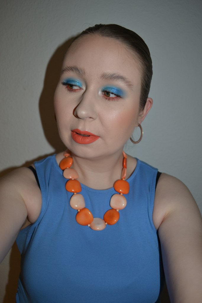 (Base: primer – Maybelline Fit Me Matte + Poreless primer, foundation – L’Oréal Paris True Match Nude plumping tinted serum (shade: 0,5-2 Very Light), concealers – L’Oréal Infaillible More Than Concealer (shade: 322 Ivory) + Maybelline Superstay Active Wear 30H concealer (shade: 05 Ivory), powders – e.l.f. Cosmetics HD powder in Soft Luminance + Rimmel Lasting Finish compact foundation (shade: 01 Fair Porcelain). Face make-up: bronzer – Physicians Formula Butter bronzer (shade: Light), blusher – Oden’s Eye Solmåne Sunlight Love blusher in W102 Peach Gleam, highlighter – Oden’s Eye Solmåne Moonlight Feel highlighter in H105 Azura Shine. Eye make-up: base – MAC Pro Longwear Paint Pot in Painterly, eyeshadows – Essence Disney Classics Silky Eyeshadow Palette in Patch 03 Dognapped! (shades: 15 Puppies + Perdita + Sibling) + Oden’s Eye Solmåne II eyeshadow palette (shades: Soft Cloud + Nebula + Deep Space + Solar), mascaras – MAC Extended Play Gigablack Lash mascara + Tarte Lights, Camera, Lashes mascara, eyeliner – Oden’s Eye Solmåne II gel liner in 002 Orange. Eyebrows: Anastasia Beverly Hills Brow Freeze + Maybelline Brow Ultra Slim pencil in Medium Brown. Lips: Jeffree Star Cosmetics Velour liquid lipstick in Tangerine Queen)
