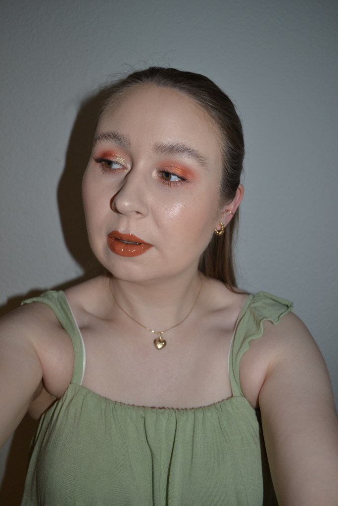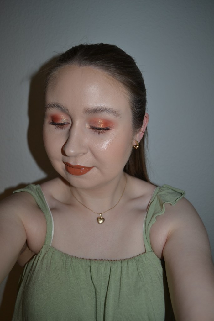 Here’s the make-up I wore with this outfit. I hadn’t worn a warm, bronzy make-up look in a really long time, but I think the look turned out very pretty.
