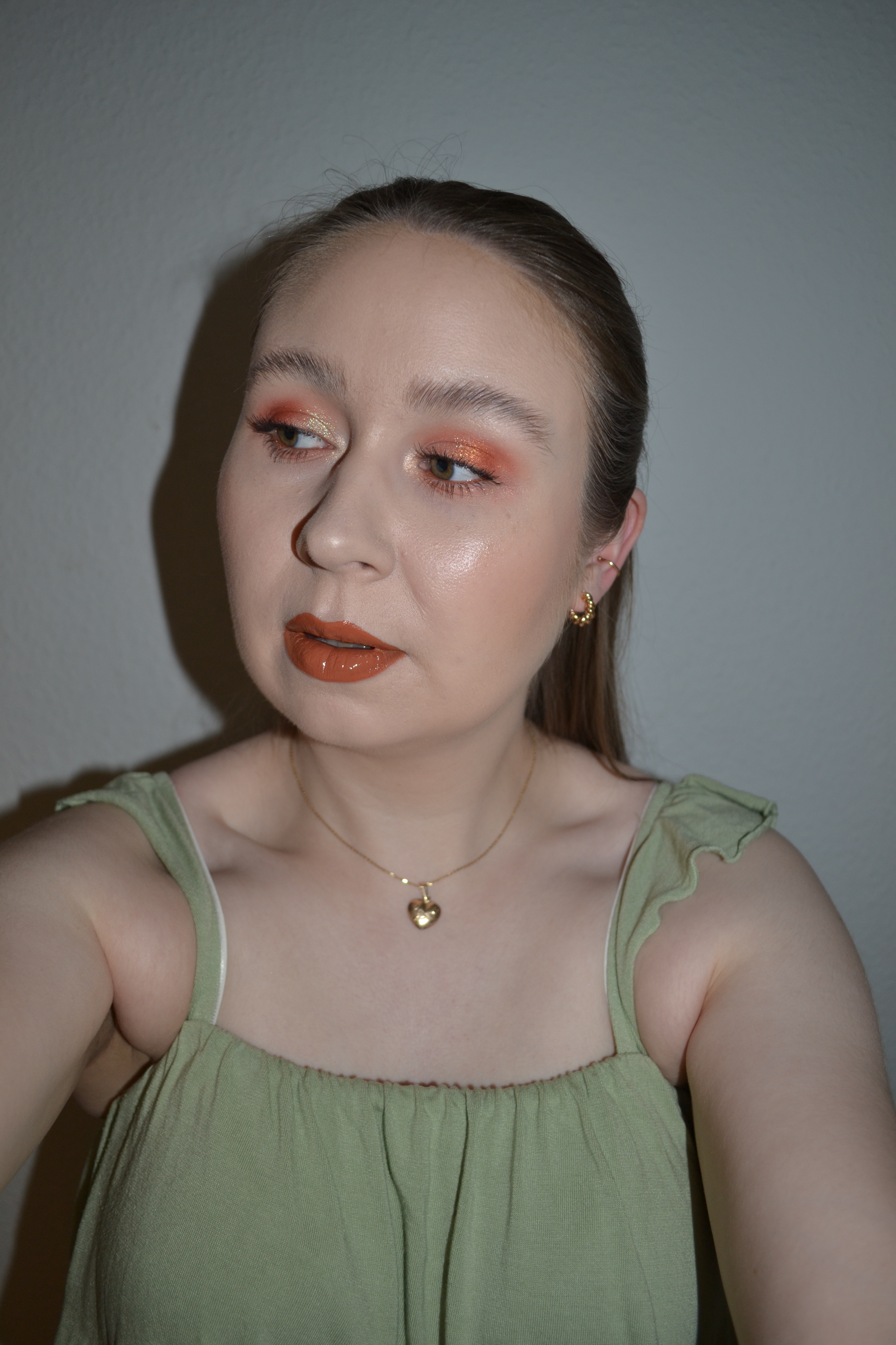 (Base: primers – e.l.f. Cosmetics Blemish Fighting Putty primer + Charlotte Tilbury Hollywood Flawless Filter (shade: 1 Fair), foundation – e.l.f. Cosmetics Camo CC Cream (shade: Fair 120N), concealers – L’Oréal Infaillible More Than Concealer (shade: 322 Ivory) + NYX Bare With Me concealer serum (shade: 02 Light), powders – Catrice All Matt Plus Shine Control powder in 002 Banana Bright + Catrice All Matt Shine Control powder Healthy Look in 100 Neutral Fresh Beige. Face make-up: bronzer – Danessa Myricks Beauty Balm Contour in Light 1, blusher – e.l.f. Cosmetics Putty blush in Bahamas, highlighters – MAC Strobe Face Glaze in Punk In Spice + Essence The Highlighter in 01 Mesmerizing. Eye make-up: base – MAC Pro Longwear Paint Pot in Painterly, eyeshadows – Essence eyeshadow in 05 Granny Pants + Jeffree Star Cosmetics Pricked palette (shades: Thorny + Unblunted) + LH Cosmetics Shimmer Saga palette (shades: Crush + Success), mascara – Pat McGrath Labs Dark Star mascara, eyeliner – Make Up For Ever Aqua Resist Smoky Shadow in 16 Copper. Eyebrows: Anastasia Beverly Hills Brow Freeze + Maybelline Brow Ultra Slim pencil in Medium Brown. Lips: Jeffree Star Cosmetics Velour liquid lipstick in Play Your Luck + Jeffree Star Cosmetics Supreme Gloss in Nude Garden)