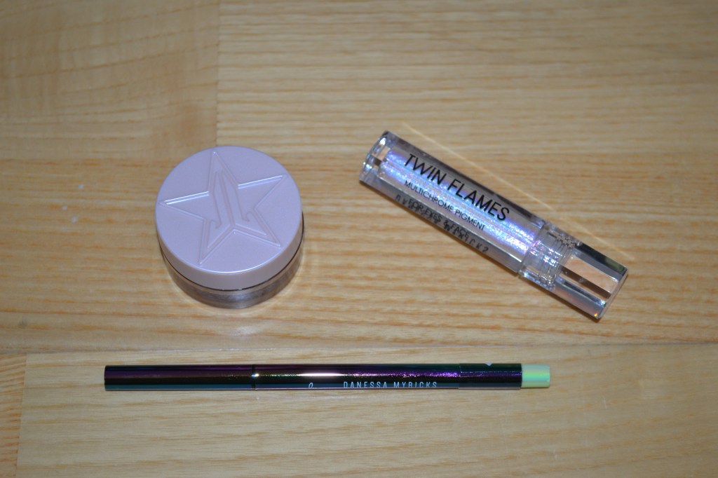 Now on to a few more eye products. As I mentioned in a recent make-up post, I’m really into creams and liquids and all kinds of different types of eyeshadows these days, so I picked up the Jeffree Star Cosmetics Eye Gloss Powder in Voodoo Glass, the Danessa Myricks Beauty Twin Flames Multichrome Pigment in Passion, and I also decided to try the Danessa Myricks Beauty Infinite Chrome Pencil in Jade.