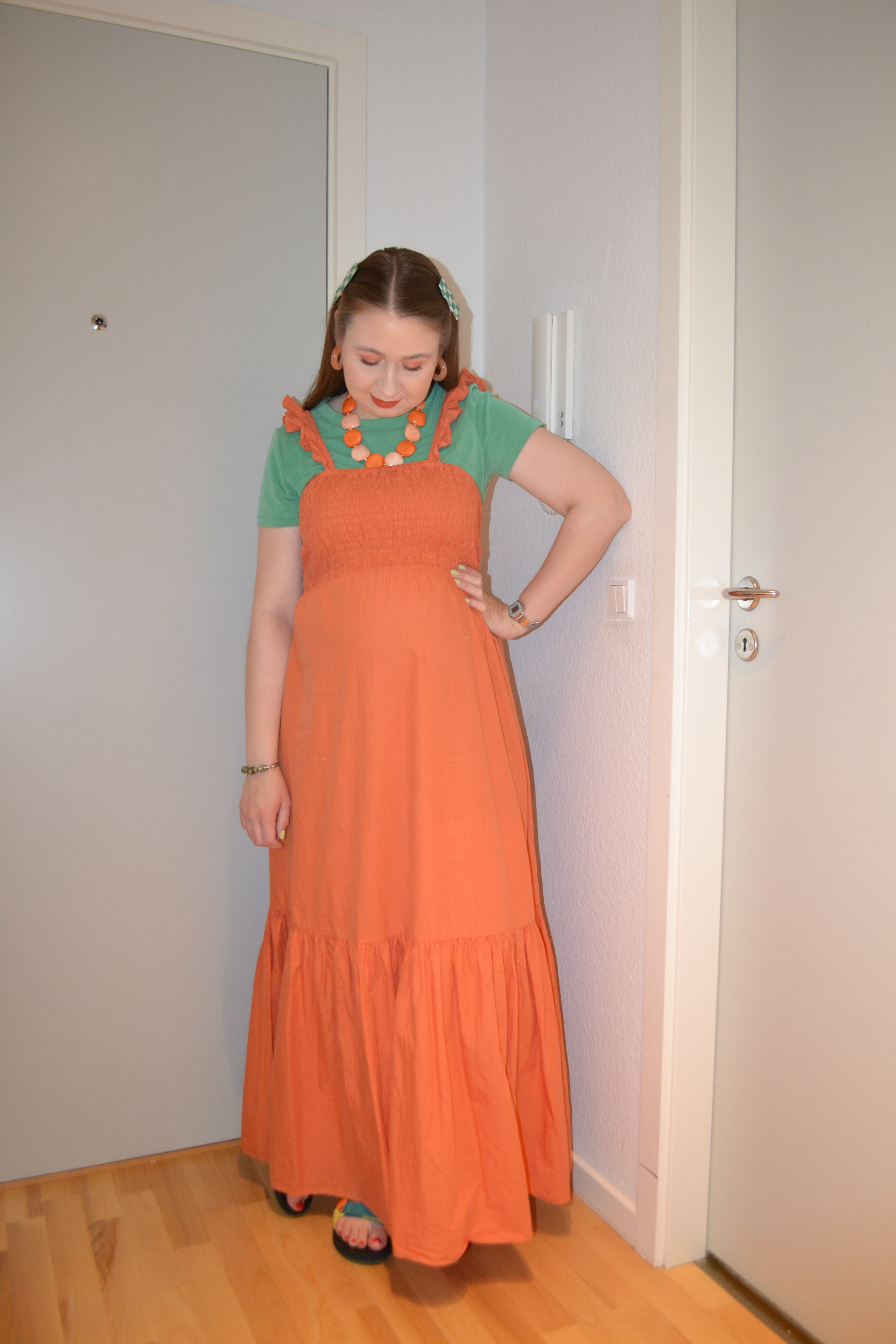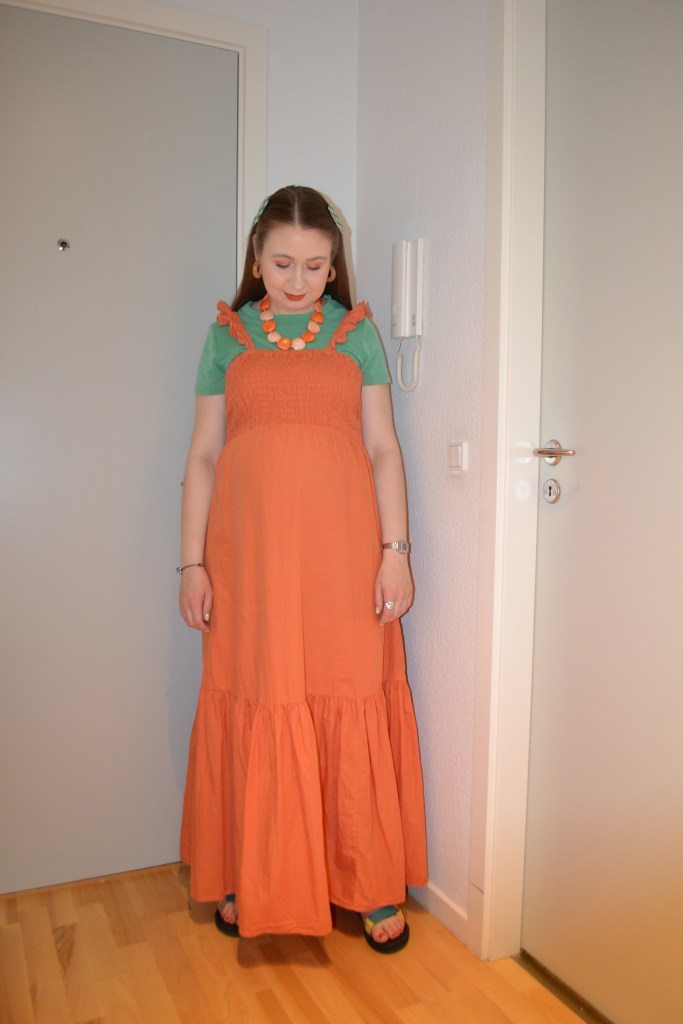 Here’s what I wore Monday August 22. This maternity dress is actually a little big on me, especially the top part, but I can definitely make it work by wearing a T-shirt underneath. I also think this orange and green colour combo is so pretty.