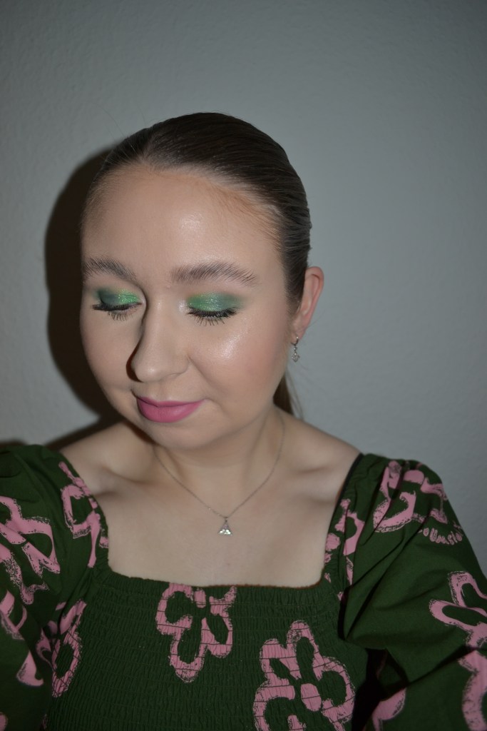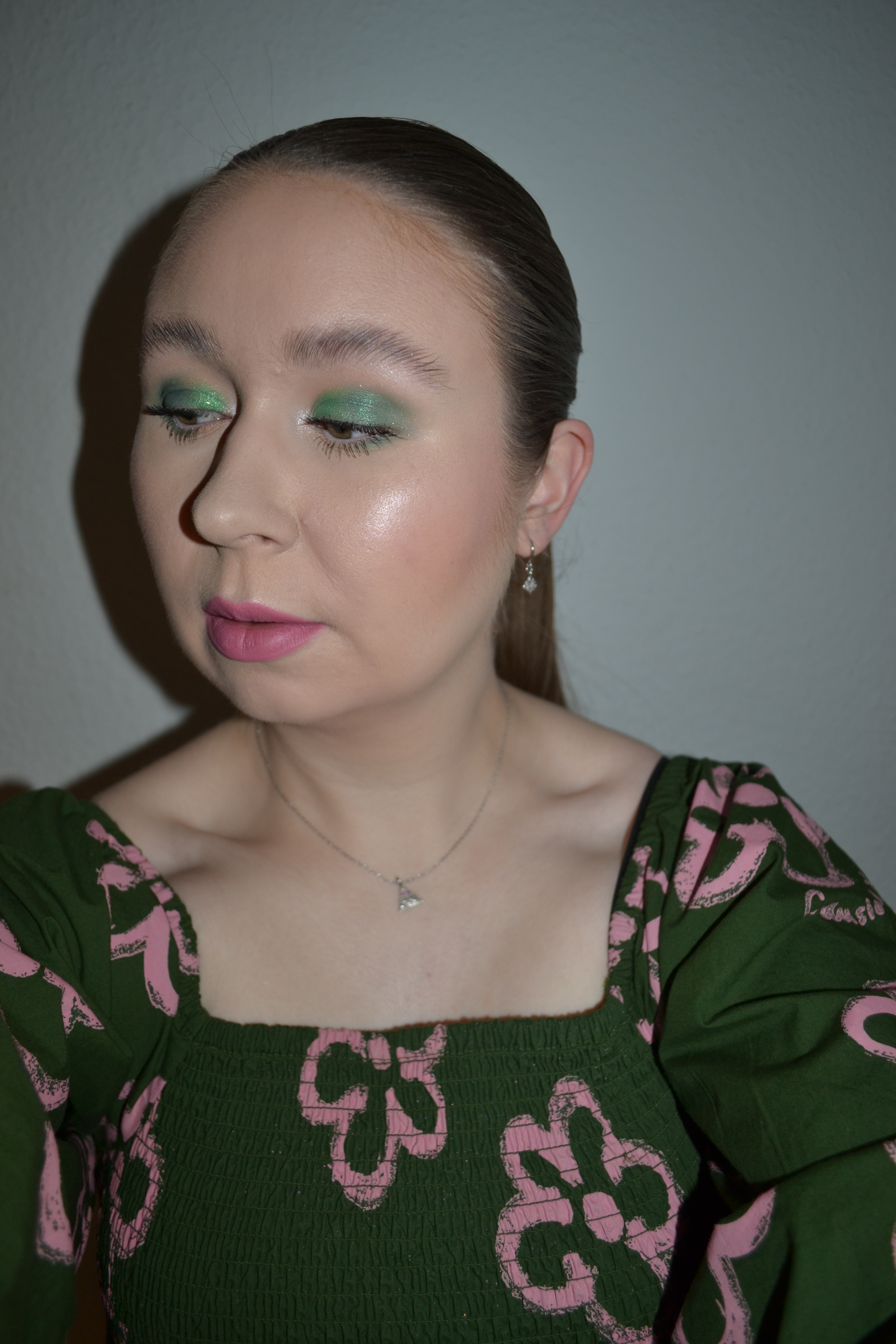 Here’s the make-up I wore with this outfit. I might wear a Christmas themed eyeshadow palette in summer, but I don’t mind; I liked the greens with my dress.