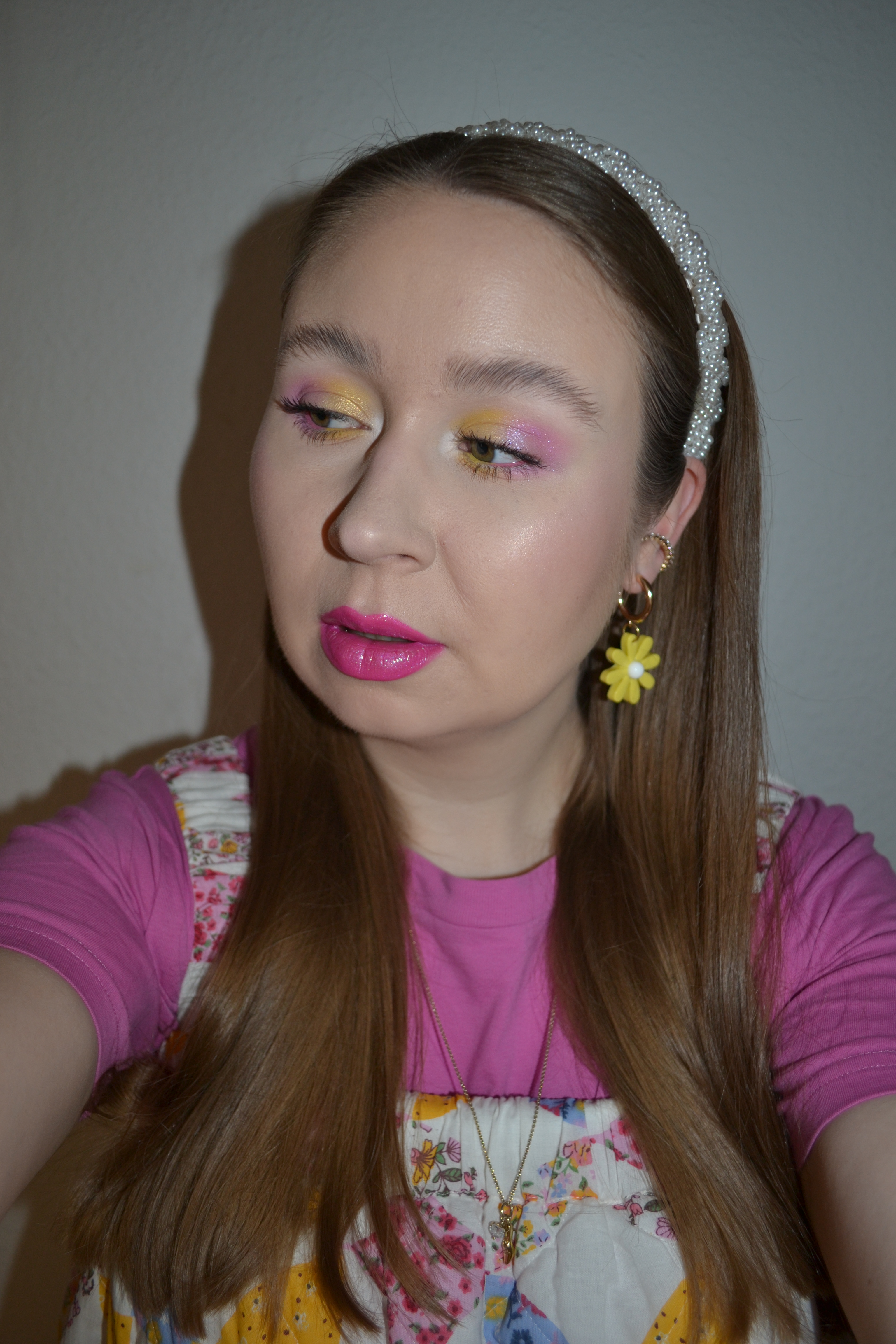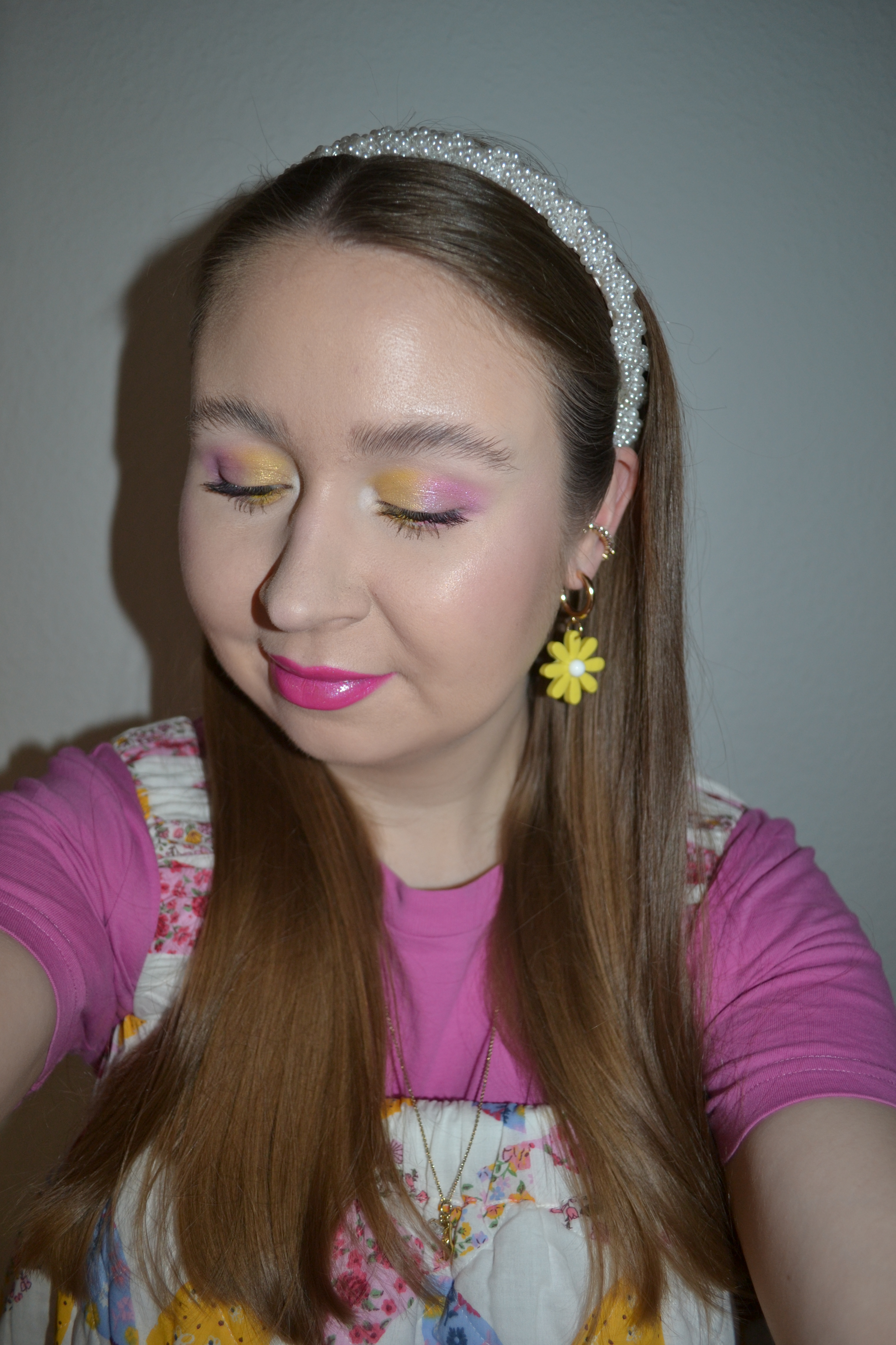 Here’s the make-up I wore with this outfit. Cool-toned almost fuchsia pink and bright yellow is such a pretty summer colour combo.
