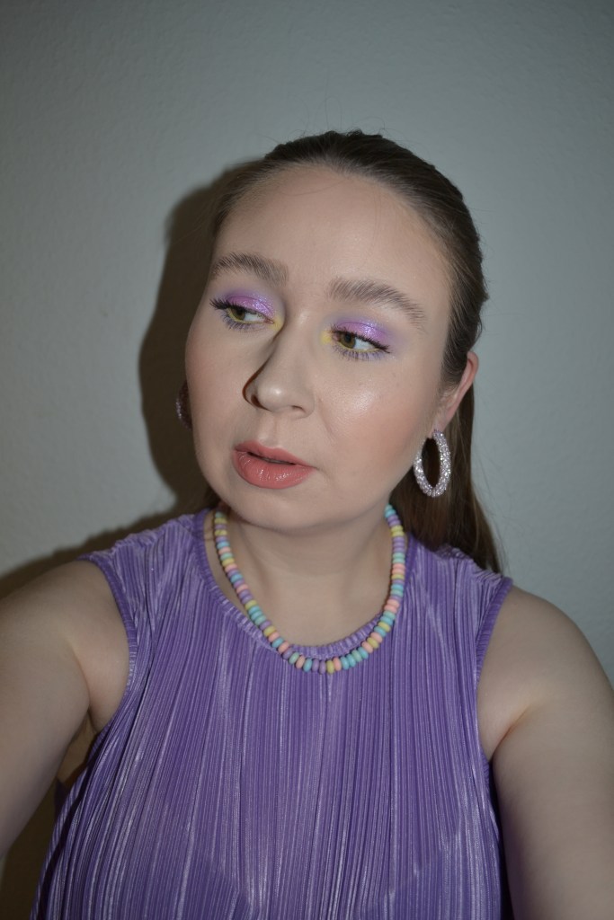 (Base: primers – Rare Beauty Always An Optimist pore diffusing primer + I Heart Revolution x Elf collection primer, foundation – L’Oreal Infaillible 24H Fresh Wear foundation (shade: 015 Porcelain), concealers – L’Oréal Infaillible More Than Concealer (shade: 322 Ivory) + Fenty Beauty Bright Fix Eye Brightener (shade: Golden Ivory), powders – Essence Brighten Up! Banana powder in 10 Bababanana + Dior Backstage Face & Body Powder-No-Powder in 0 Neutral. Face make-up: bronzer – Rare Beauty Warm Wishes Effortless bronzer in Power Boost, blusher – Anastasia Beverly Hills Stick Blush in Peachy Keen, highlighter – About-Face Light Lock Highlight Fluid in Unrestrained. Eye make-up: base – MAC Pro Longwear Paint Pot in Painterly, eyeshadows – Essence eyeshadow in 05 Granny Pants + By BEAUTY BAY TECHNIDAZE pressed pigment palette (shades: 1991 + Kaleidoscope + Hacienda) + MAC Nylon eyeshadow, mascara – Pat McGrath Labs Dark Star mascara, eyeliner – LA Girl Pastel Dream auto eyeliner in Sunshine. Eyebrows: Anastasia Beverly Hills Brow Freeze + Maybelline Brow Ultra Slim pencil in Medium Brown. Lips: MAC Naked Liner lip pencil + MAC Love Me lipstick in Sakura Szn)