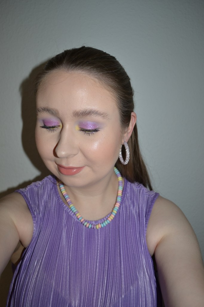 Here’s the make-up I wore with this outfit. Adding a pop of yellow to a purple eye look is actually quite nice and something I should do again some time.