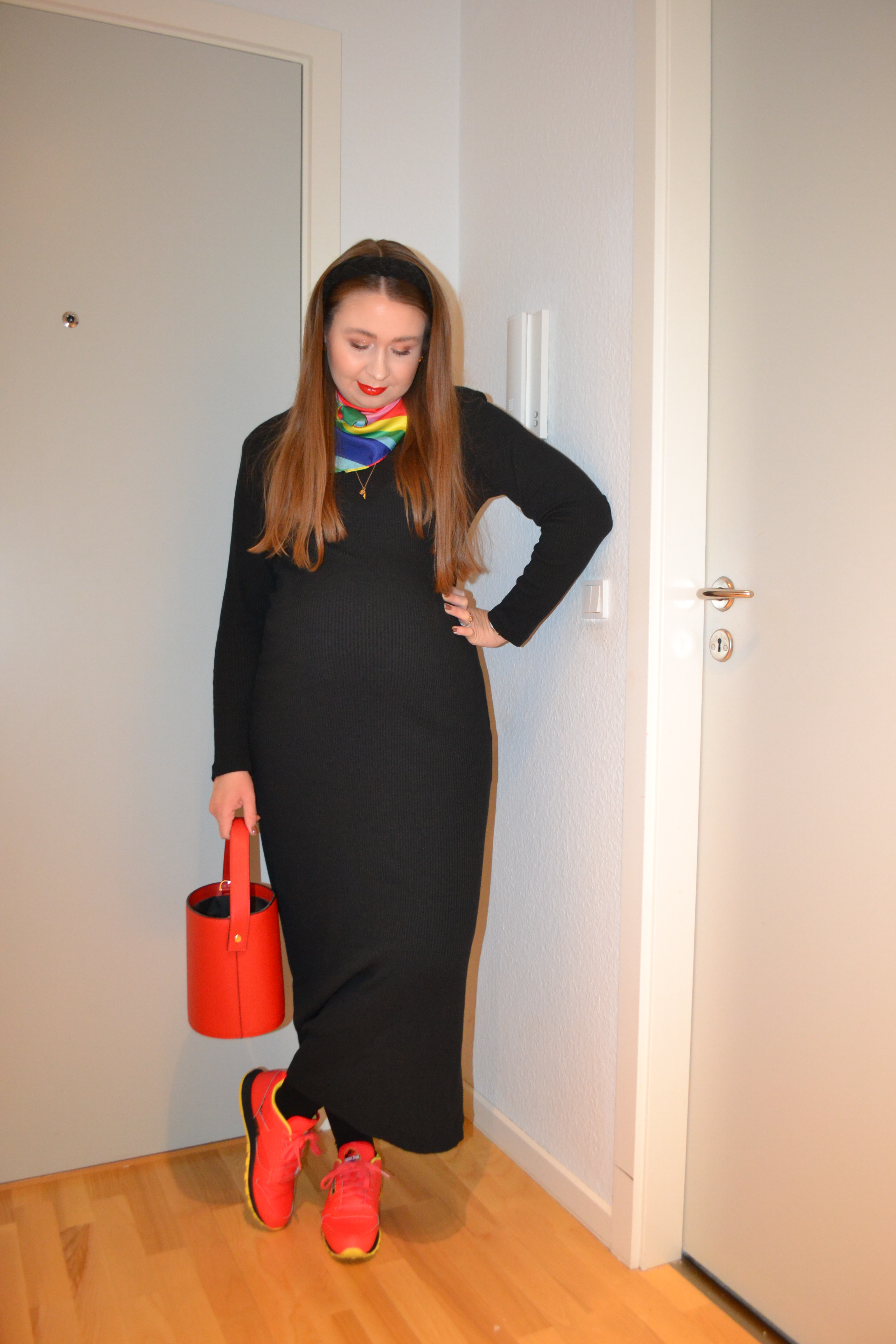 (Dress – second hand, scarf – Gina Tricot x Emili Sindlev, bag – Topshop, sneakers – Reebok)