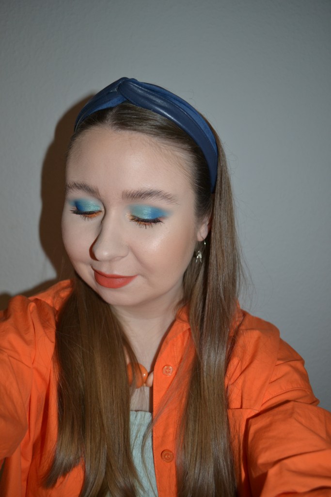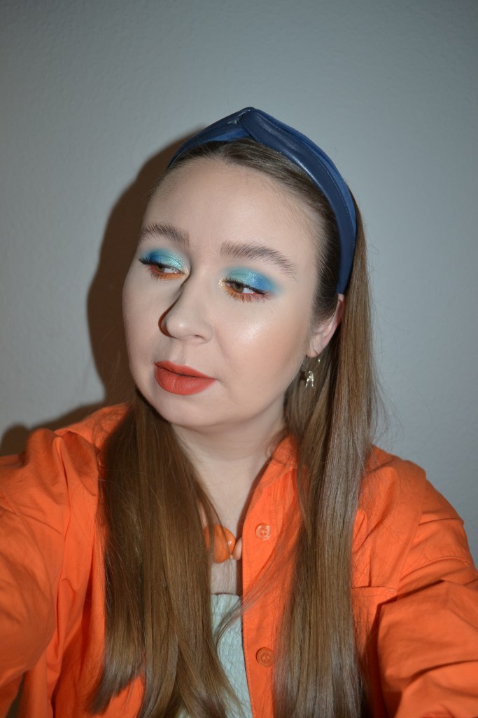 (Base: primers – Rare Beauty Always An Optimist pore diffusing primer + Charlotte Tilbury Hollywood Flawless Filter (shade: 1 Fair), foundation – L’Oréal Paris True Match Nude plumping tinted serum (shade: 0,5-2 Very Light), concealers – L’Oréal Infaillible More Than Concealer (shade: 322 Ivory) + Huda Beauty #FAUXFILTER Luminous Matte liquid concealer (shade: 1.3G Marshmellow), powders – Essence Brighten Up! Banana powder in 10 Bababanana + Charlotte Tilbury Airbrush Flawless Finish powder (shade: 1 Fair). Face make-up: bronzer – Too Faced Milk Chocolate Soleil bronzer, blusher – Oden’s Eye Sunlight Love blusher in B102 Warm Sun, highlighter – Huda Beauty Glow Obsessions Light highlighter palette (shades: 1. shade 1. row + 1. shade 2. row). Eye make-up: base – MAC Pro Longwear Paint Pot in Painterly, eyeshadows – Essence eyeshadow in 05 Granny Pants + Oden’s Eye Solmåne II eyeshadow palette (shades: Neptune + Nebula + Mercury + Solar + Warm Light + Starry Night), mascara – Pat McGrath Labs Dark Star mascara, eyeliner – Oden’s Eye Solmåne II gel liner in 002 Orange. Eyebrows: Anastasia Beverly Hills Brow Freeze + Maybelline Brow Ultra Slim pencil in Medium Brown. Lips: Morphe x Nyane Color pencil in Tequila Sunrise + MAC Powder Kiss liquid lipcolour in Sorry Not Sorry)