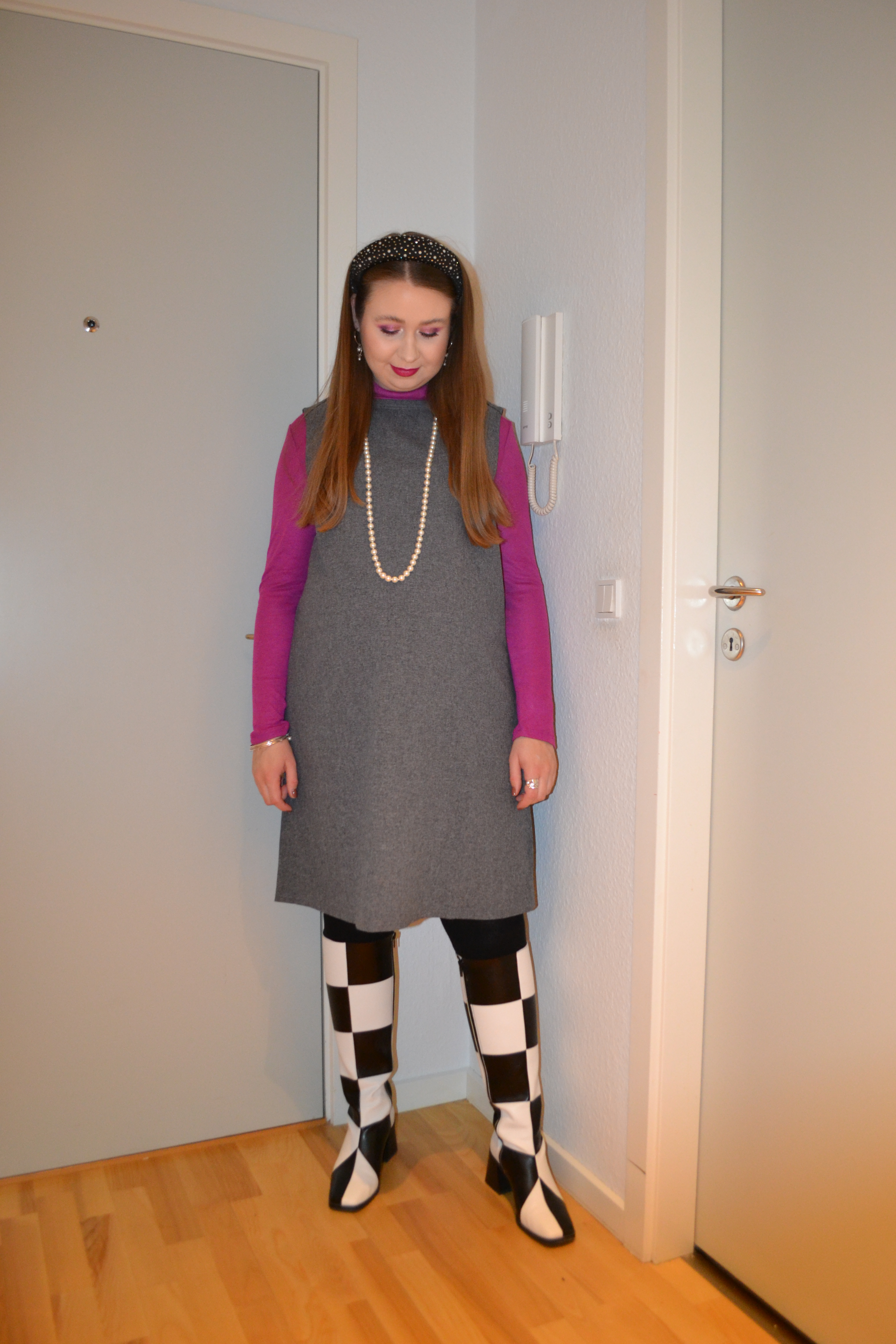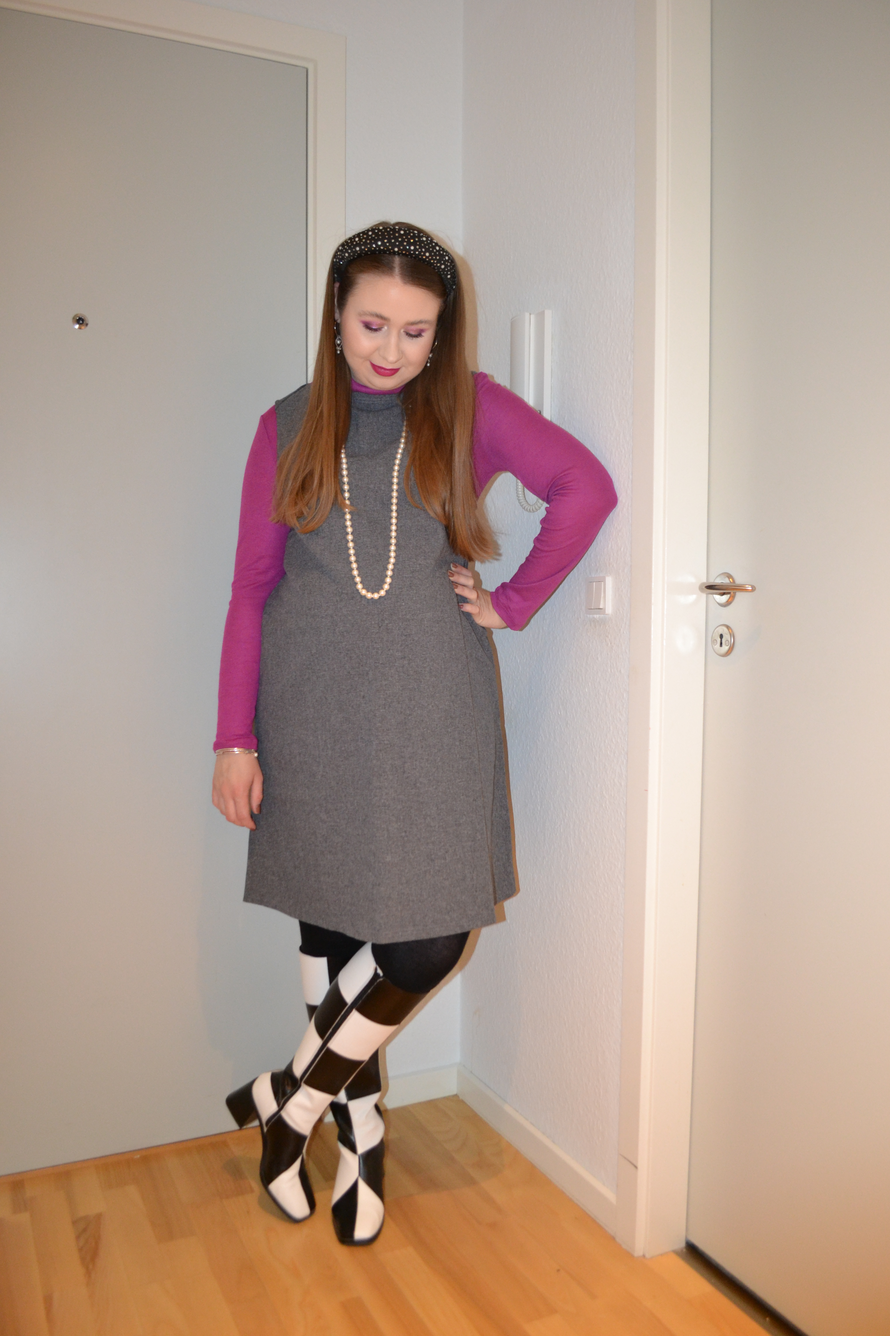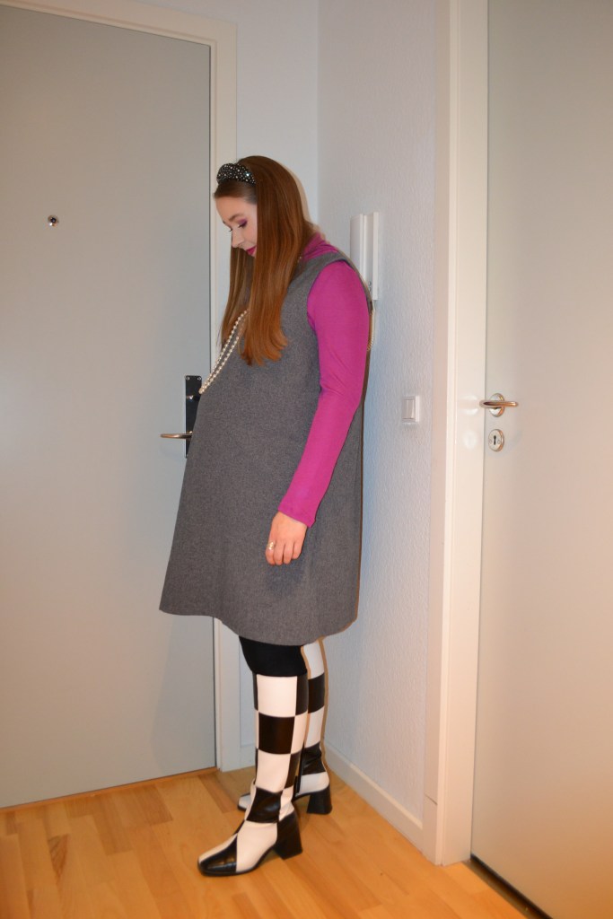 (Roll neck top – Vero Moda Maternity, dress – second hand, tights – H&M MAMA, boots – Monki)