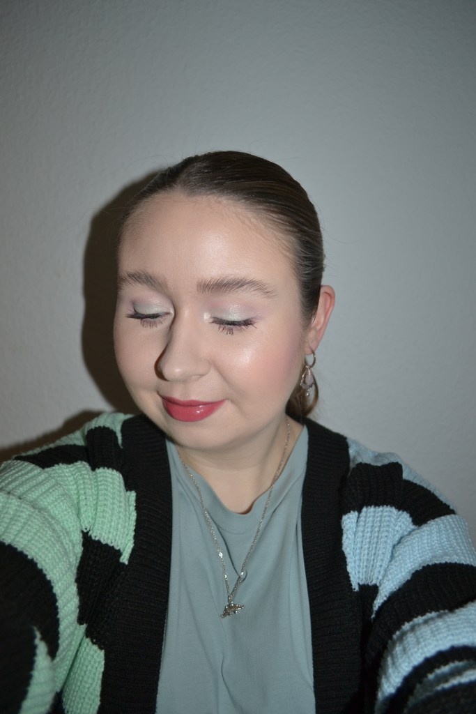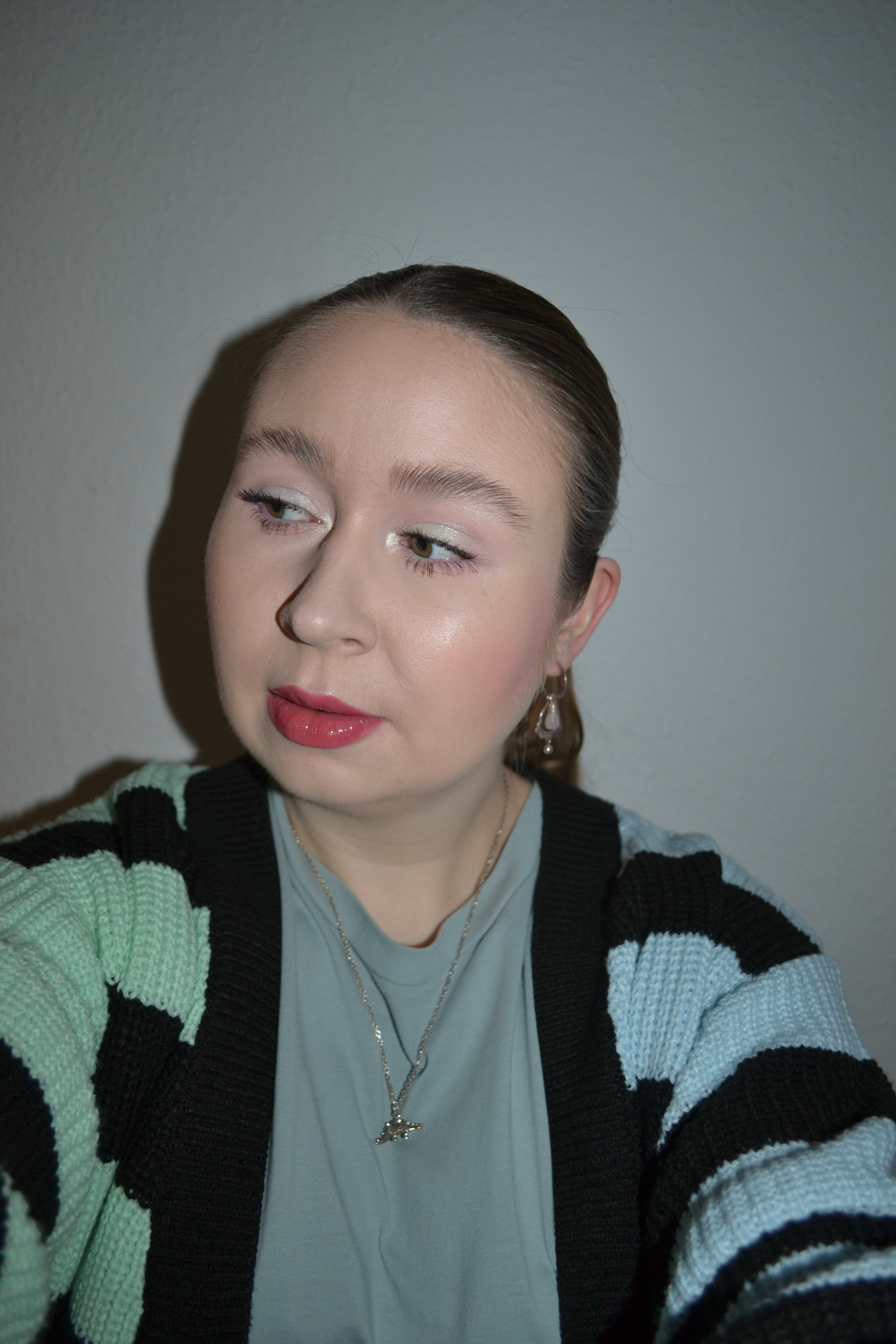 (Base: primer – Catrice Disney Villains Maleficent face primer, foundation – L’Oréal Paris True Match Nude plumping tinted serum (shade: 0,5-2 Very Light), concealers – Catrice Under Eye Brightener in 010 Light Rose + L’Oréal Infaillible More Than Concealer (shade: 322 Ivory), powders – Laura Mercier Translucent Loose Setting Powder Tone Up in Rose + Huda Beauty Glowish Luminous pressed powder in 01 Fair. Face make-up: bronzer – NYX Wonder Stick Dual-Ended Face Shaping Stick in 01 Fair (contour shade), blusher – NYX Wonder Stick Dual Ended Cream Blush Stick in 01 Light Peach + Baby Pink (shade: Baby Pink), highlighter – Catrice Disney Villains Maleficent liquid highlighter in 010 Magic. Eye make-up: base – Essence Super Coverage eyeshadow base by Merve in 01 Create Your Canvas, eyeshadows – Essence eyeshadow in 05 Granny Pants + Catrice Disney Villains Maleficent eyeshadow palette in 010 I Run This Castle (shades: Fairy + Aurora + Fauna + Eternal Sleep), mascara – Pat McGrath Labs Dark Star mascara, eyeliners – Revolution x Bratz Jade eye pencil + MAC Powerpoint eye pencil in Mistletoe Mint. Eyebrows: Anastasia Beverly Hills Brow Freeze + Soda #browpurrfection Ultra Thin Brow Liner in 003 Kim. Lips: Rimmel Exaggerate lip liner in 063 Eastend Snob + Essence Pumpkins Pretty Please! matte lipstick in 01 Sweeter Than Pumpkin Pie + Essence Juicy Bomb shiny lipgloss in 10 Sweet Mint)