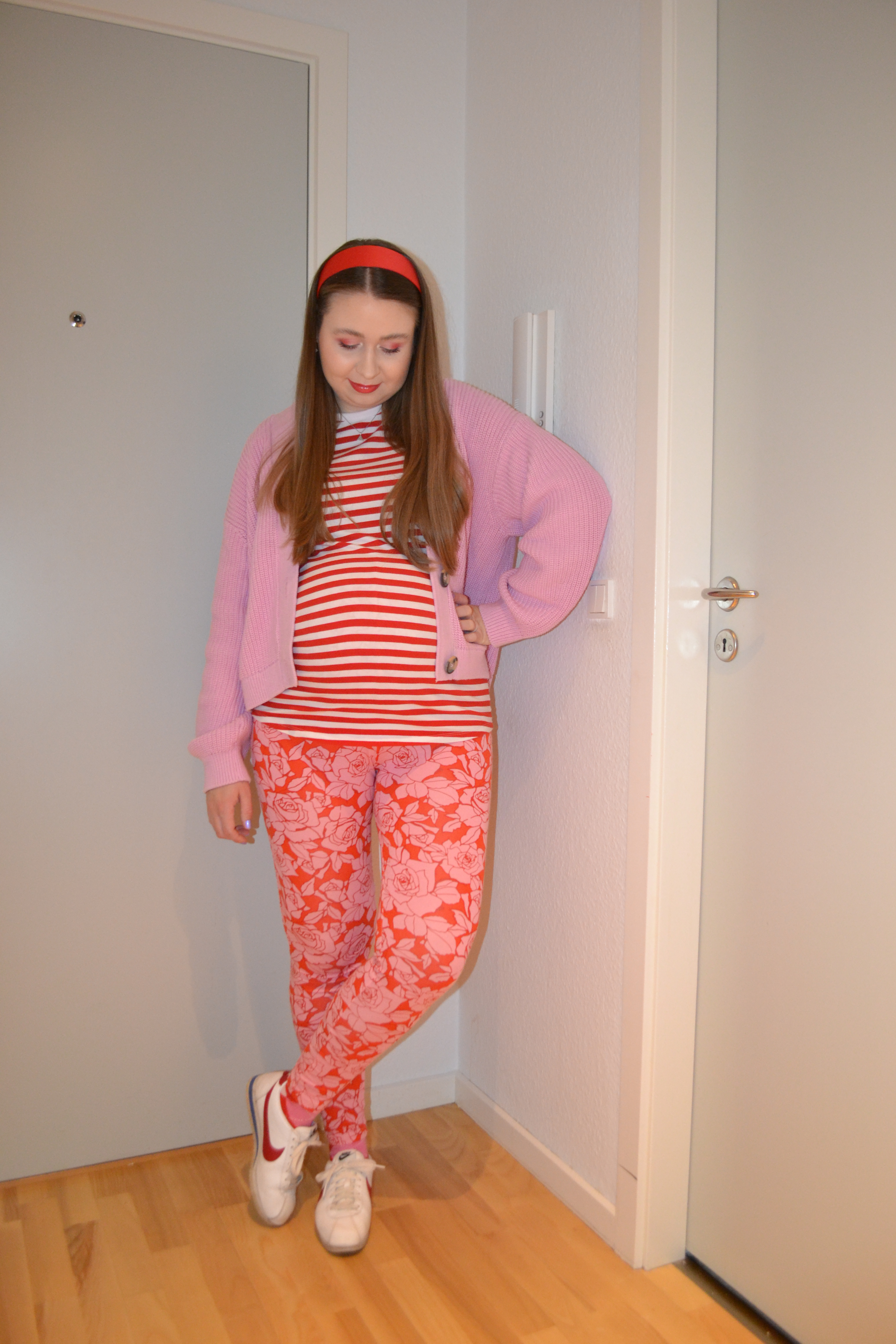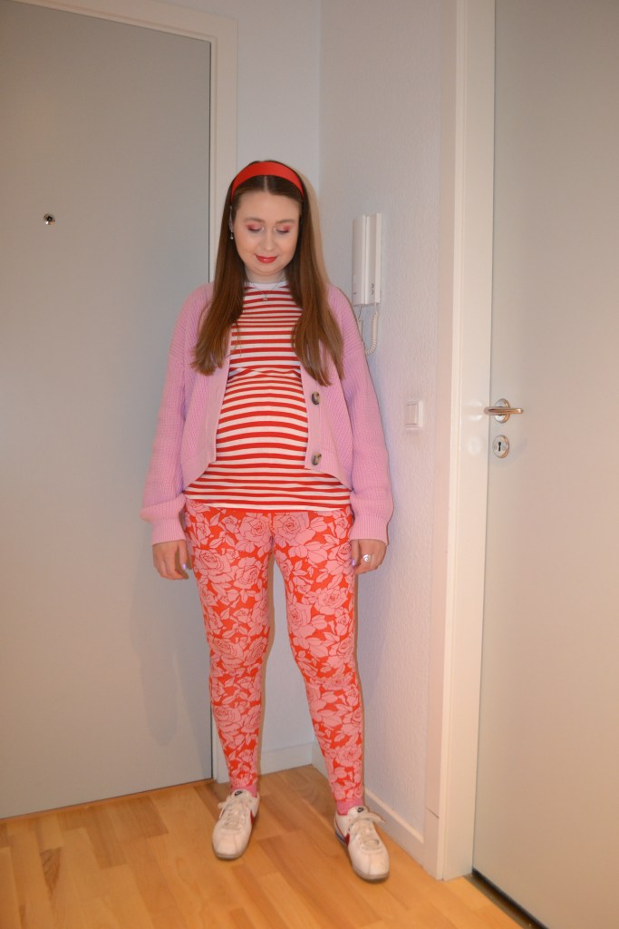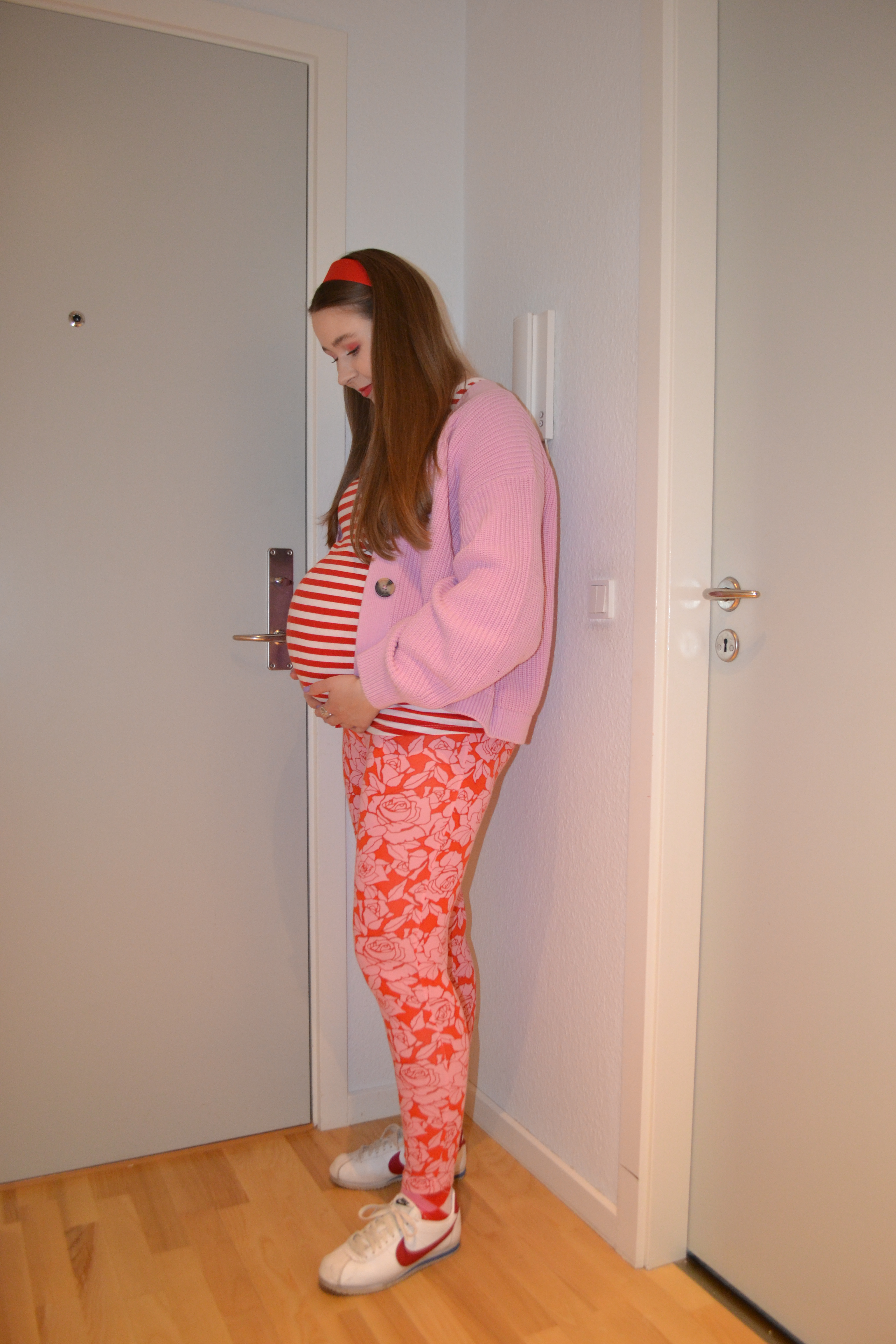 (Cardigan – H&M, T-shirt – H&M MAMA, leggings – Asos Maternity, socks – Asos Design, sneakers – Nike)