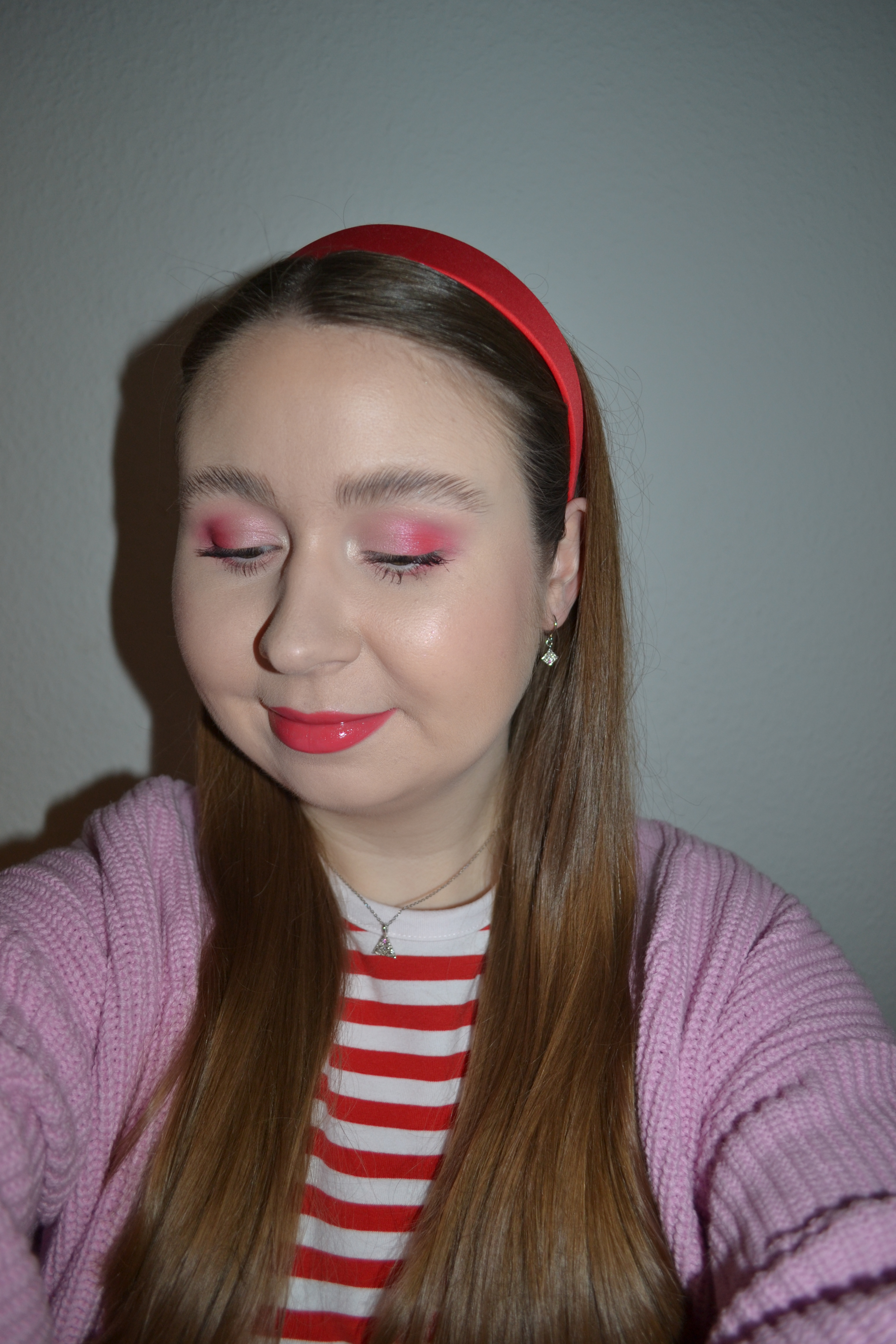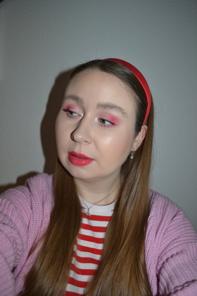 Here’s the make-up I wore with this outfit. I love red and pink together, and how pretty is this glossy, soft red lip!