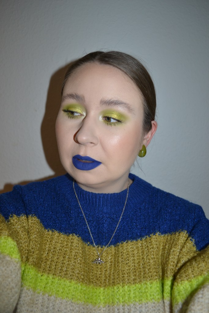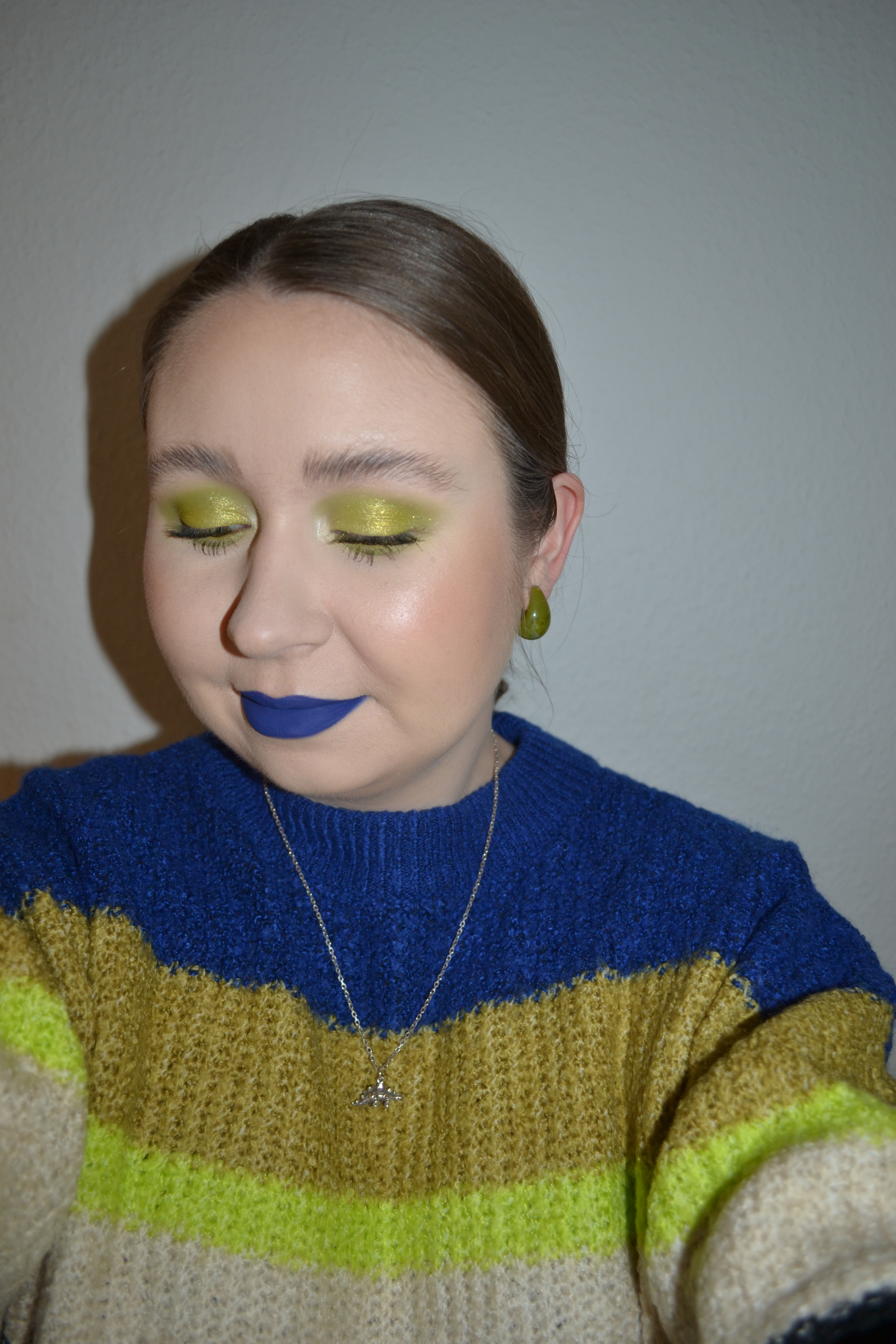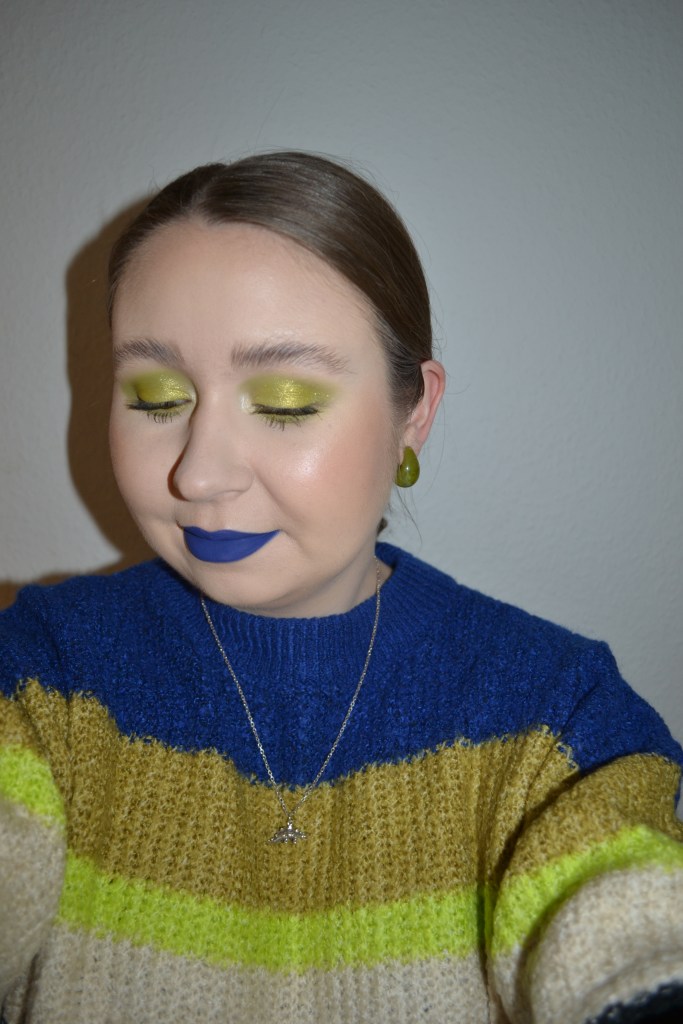 Here’s the make-up I wore with this outfit. I had so much fun doing this make-up look. I really wanted to wear the Oden’s Eye x Angelica Hela eyeshadow palette again and thought I would pair the green eye look with a blue lip to match my jumper.