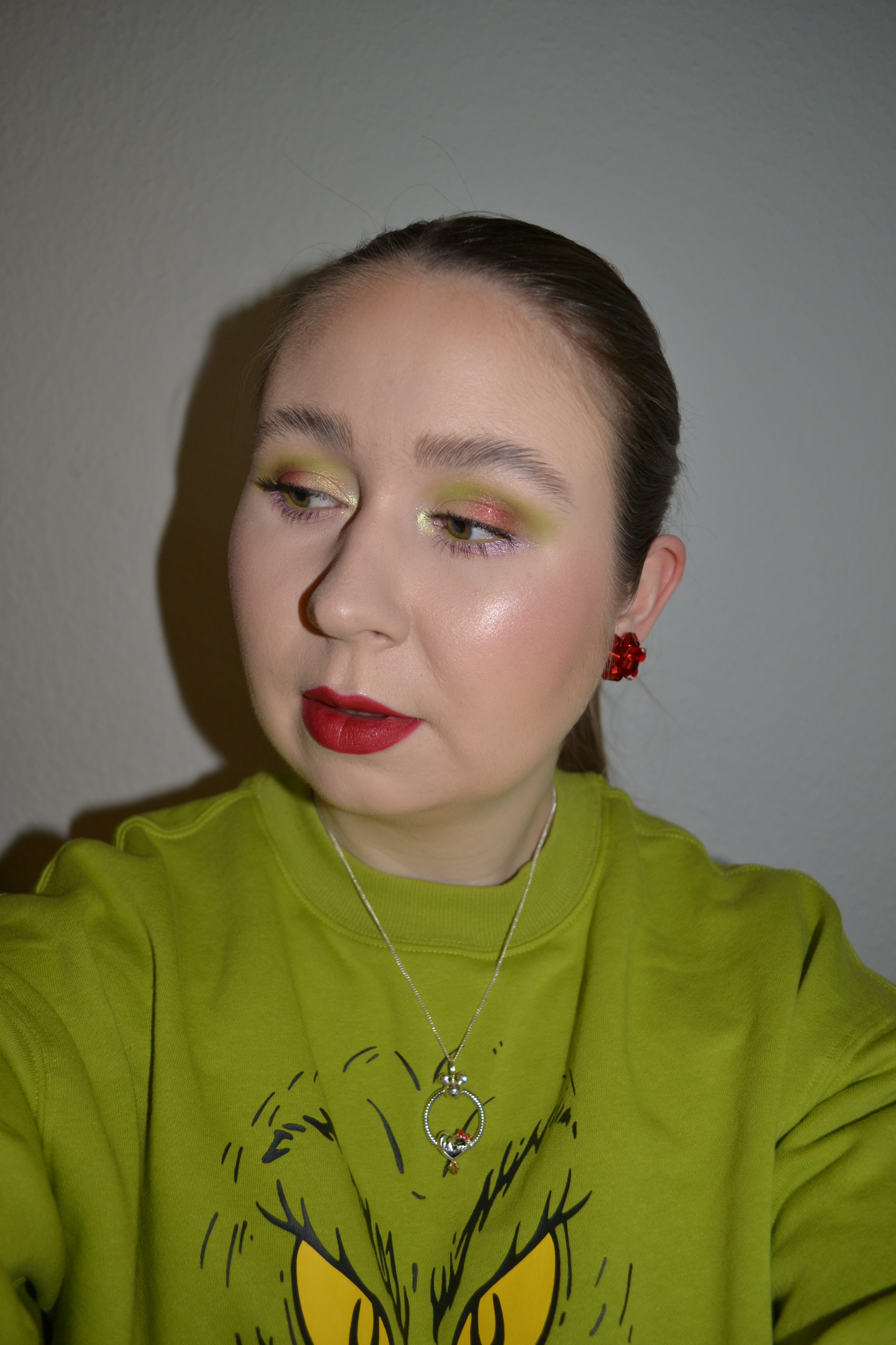(Base: primer – Milk Makeup Hydro Grip primer, foundation – L’Oreal Infaillible 24H Fresh Wear foundation (shade: 015 Porcelain), concealers – Sigma Beauty Spectrum Color-Correcting Duo in Light to Medium + NYX Bare With Me concealer serum (shade: 02 Light), powders – Essence Brighten Up! Banana powder in 10 Bababanana + Essence Skin Lovin’ Sensitive mineral powder (shade: 01 Translucent). Face make-up: bronzer – MAC Next To Nothing bronzing powder (shade: Canyon Dreamin’), blushers – Clinique Cheek Pop palette in Warm Up (shade: Cola Pop) + MAC Extra Dimension Skinfinish in Bottomless Brunch, highlighter – MAC Hyper Real Glow Duo in Fortune Teller/Blizzard Wizard. Eye make-up: base – Sigma Beauty Eyeshadow Base Primer in Persuade, eyeshadows – Revolution The Grinch x Revolution Mean One shadow palette (shades: Mr Grinch + Loathe Entirely + Whobilation + I’m Feeling + Naughty List + Mean Machine + 5:30 Jazzercize), mascara – Pat McGrath Labs Dark Star mascara, eyeliner – Oden’s Eye Solmåne II gel liner in 006 Green Tea. Eyebrows: Anastasia Beverly Hills Brow Freeze + Maybelline Brow Ultra Slim pencil in Medium Brown. Lips: Gosh Velvet Touch lipliner in 003 Cardinal Red + MAC Powder Kiss liquid lipcolour in Fashion, Sweetie)
