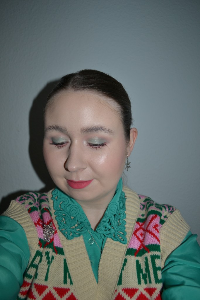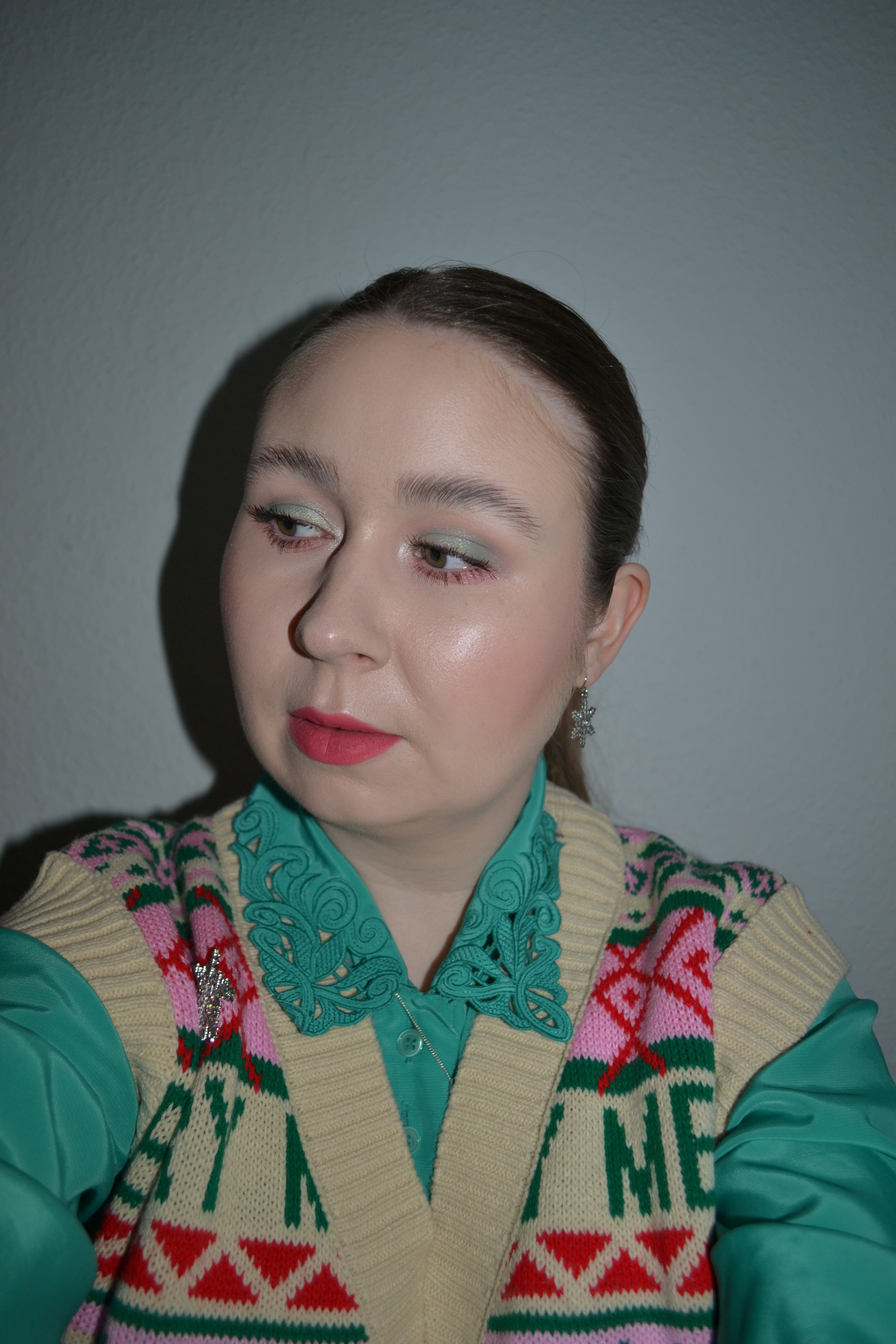 (Base: primer – Huda Beauty Glowish Blur Jam silicone-free smoothing primer, foundation – Urban Decay Stay Naked Hydromaniac Tinted Glow Hydrator (shade: 20 Fair Neutral), concealers – Smashbox x Becca Under Eye Brightening Corrector in Fair/Light + NYX Bare With Me concealer serum (shade: 02 Light), powders – Laura Mercier Translucent Loose Setting Powder Tone Up in Rose + Dior Backstage Face & Body Powder-No-Powder in 0 Neutral. Face make-up: bronzer – Rare Beauty Warm Wishes Effortless bronzer in Power Boost, blusher – Fenty Beauty Double Cheek’d Up cream blush duo (shade: Peony Droppa), highlighter – Catrice Disney Villains Cruella liquid highlighter in 020 Divine. Eye make-up: base – MAC Pro Longwear Paint Pot in Painterly, eyeshadows – Essence eyeshadow in 05 Granny Pants + Natasha Denona Retro Glam palette (shades: Holly + Sage + Marlin + Flare + Palladian), mascara – Maybelline Lash Sensational Sky High mascara Cosmic Black, eyeliner – NYX Faux Whites eyeliner in Seashell. Eyebrows: Anastasia Beverly Hills Brow Freeze + Soda #browpurrfection Ultra Thin Brow Liner in 003 Kim. Lips: MAC Powder Kiss liquid lipcolour in A Little Tamed)